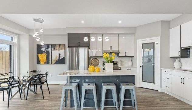 • Open-concept main floor with laminate flooring and modern kitchen.