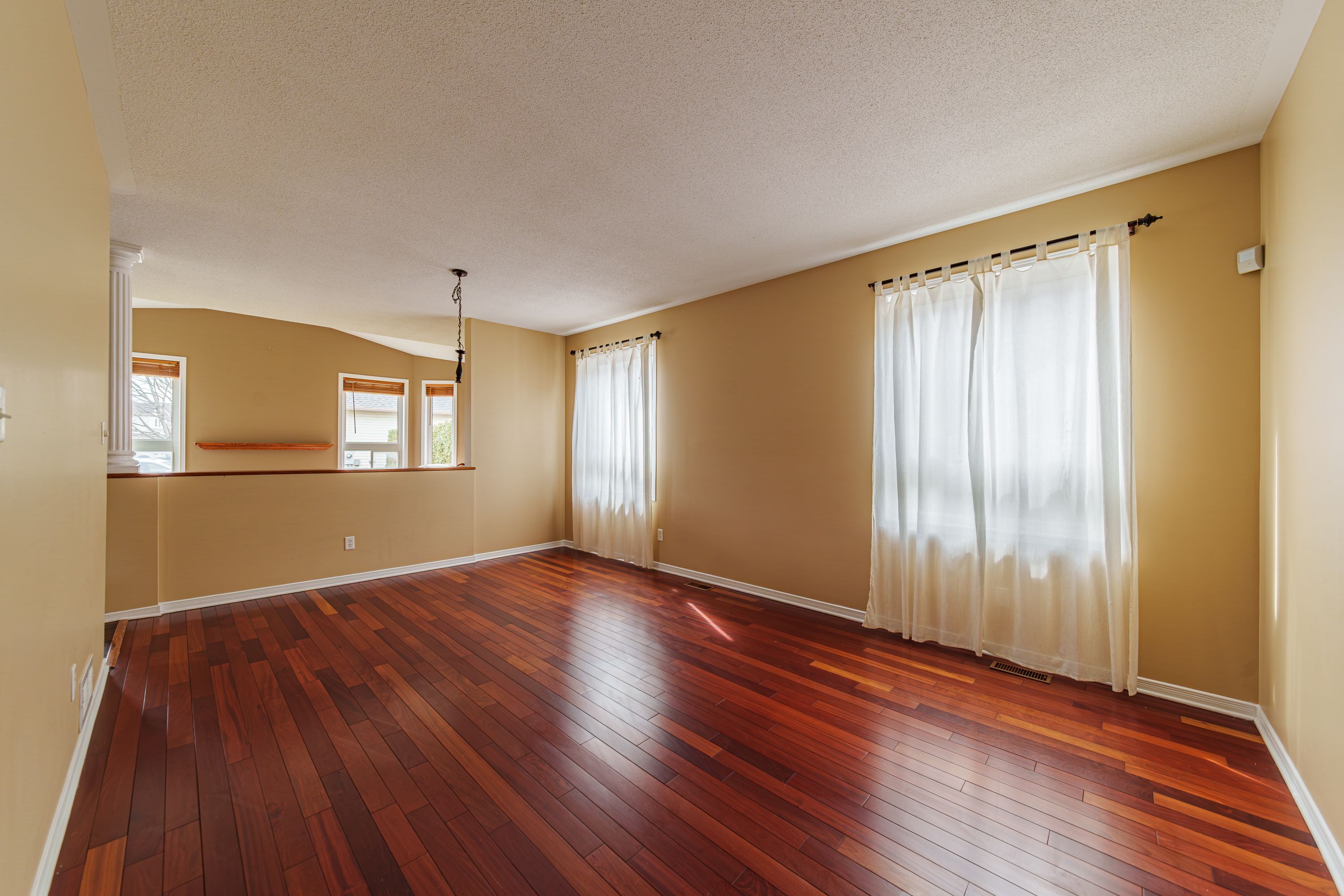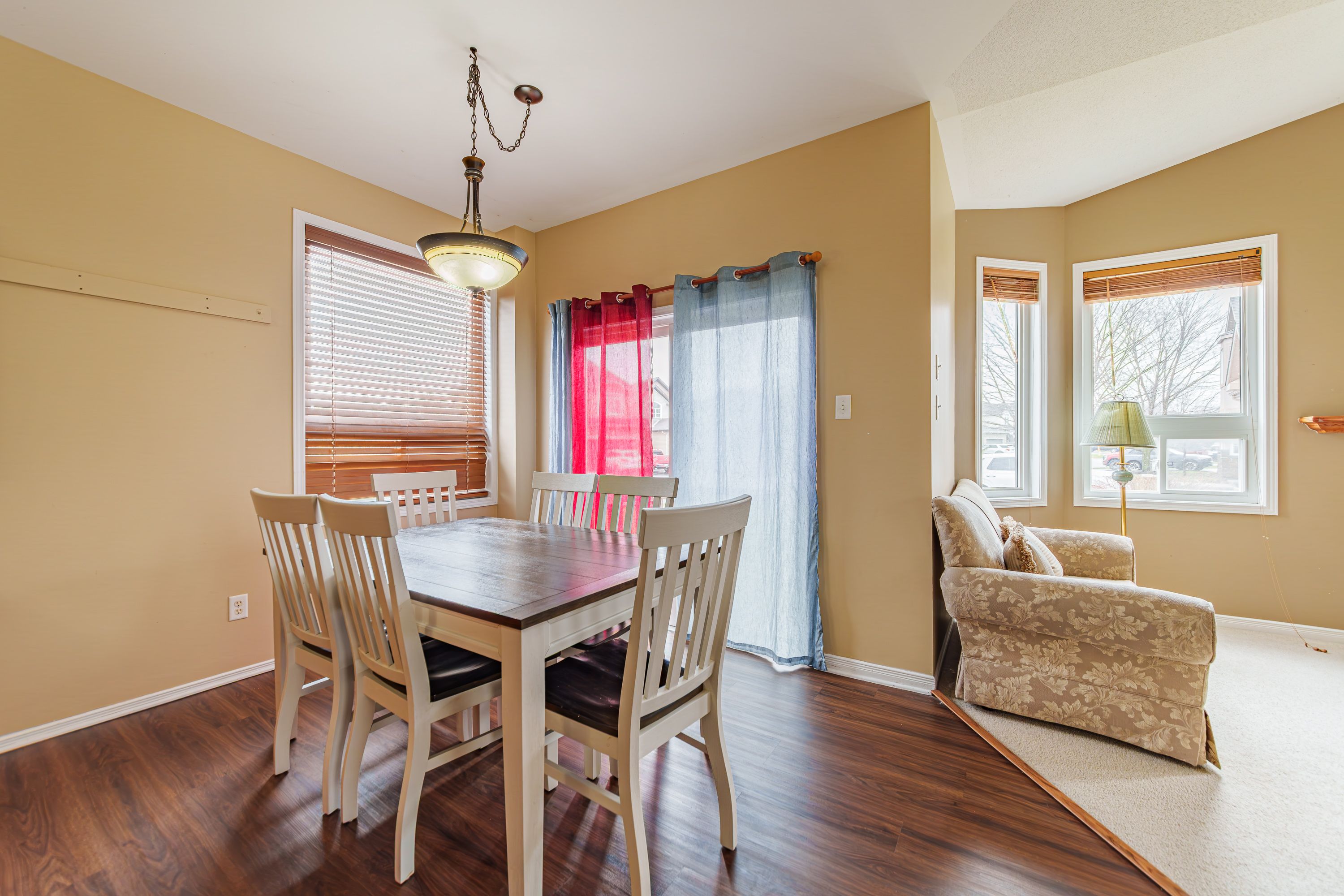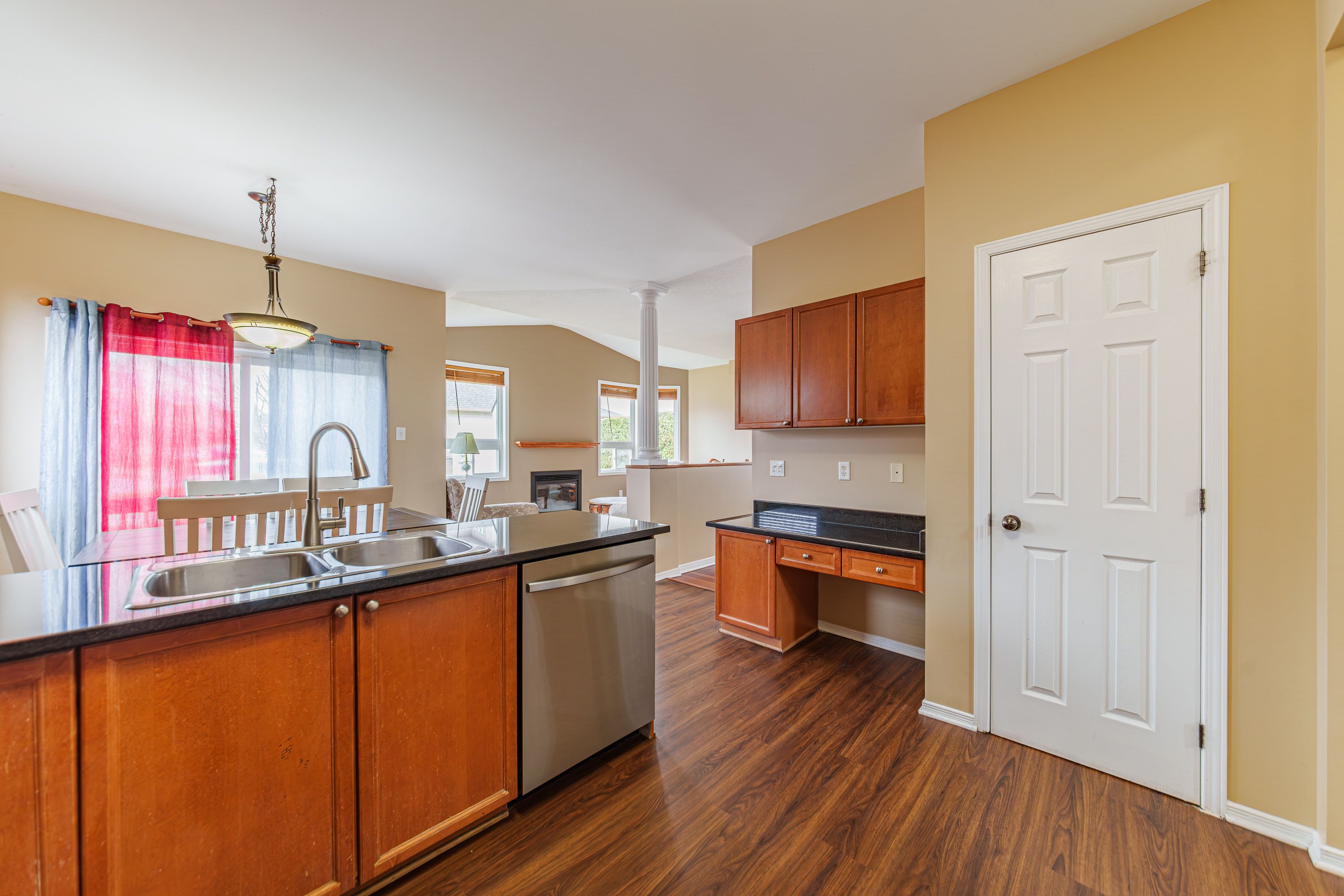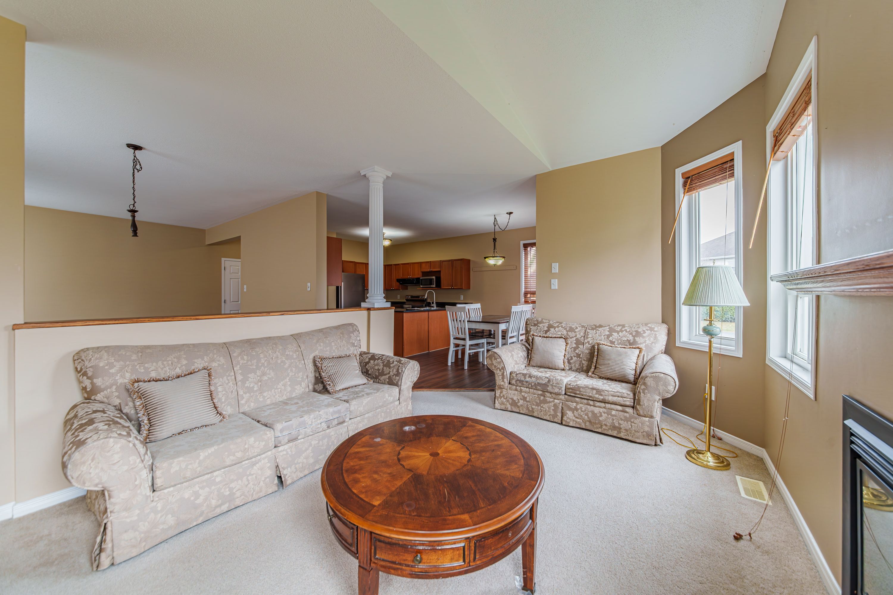 • Cozy family room with large windows and a fireplace for comfort.