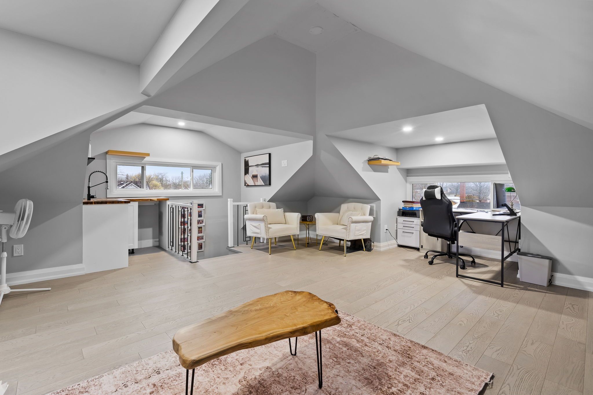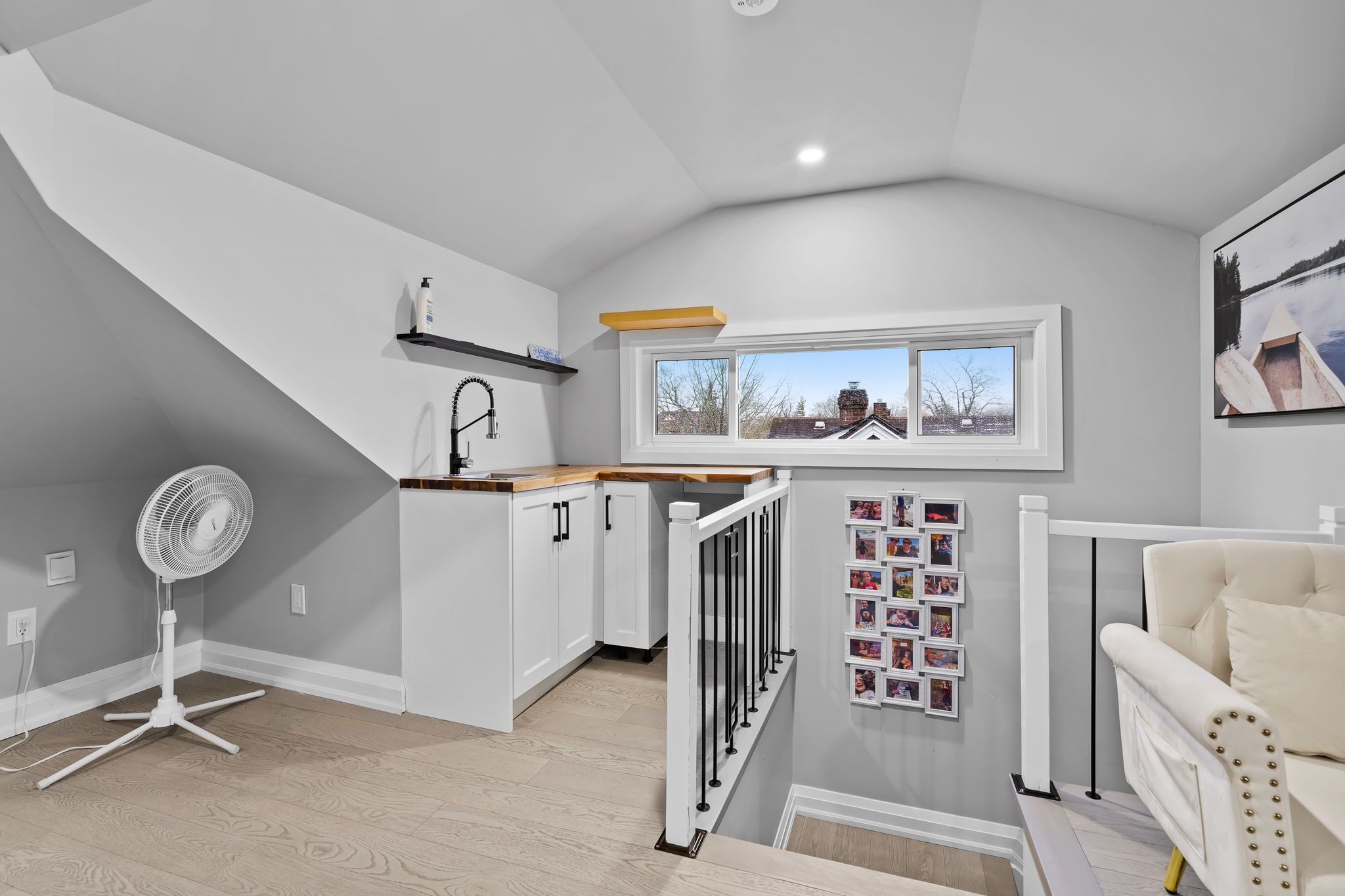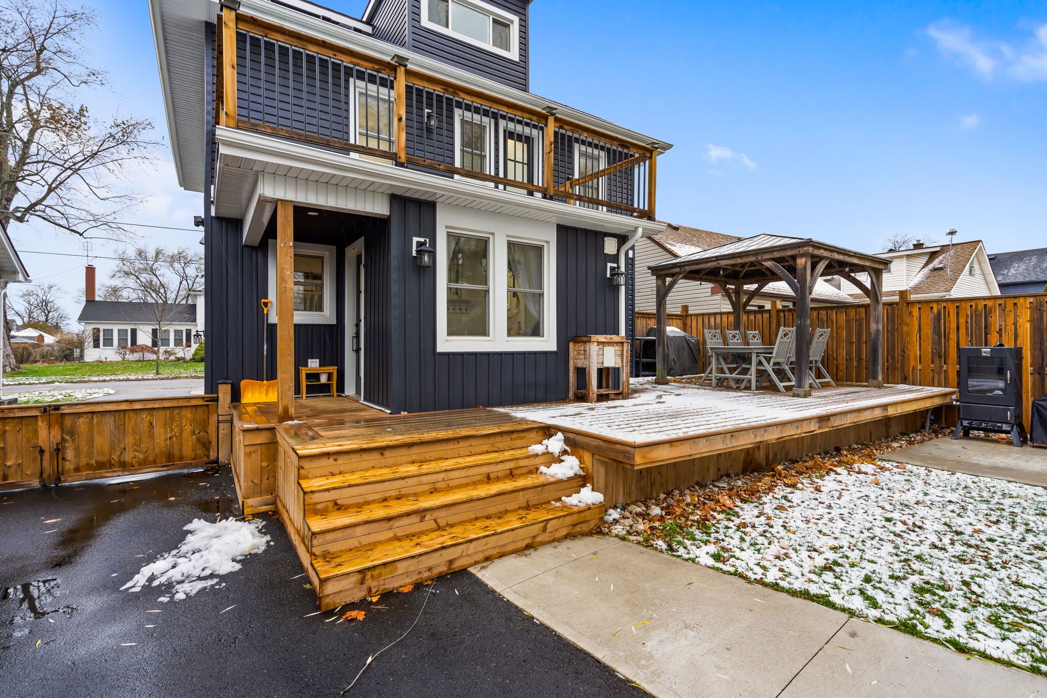 Beautifully renovated top to bottom, this gorgeous 2. 5-storey character home in the heart of chippawa showcases true pride of ownership throughout. The home welcomes you with an asphalt driveway and a stunning new wood front porch, leading inside to a porcelain tile entryway and engineered hardwood flowing through the living and dining areas. The custom kitchen features quartz countertops, a massive quartz island with sink, stainless steel appliances, and pot lights throughout on smart switches, offering an ideal layout for everyday living and entertaining. A convenient mudroom with side entry and a 2-piece bath completes the main floor, while the dining room opens to a backyard deck with gazebo. The second level offers an updated 4-piece bathroom with tub/shower and rain head, two additional bedrooms, and a primary suite with walk-out deck, large walk-in closet with custom cabinetry, and a beautiful 3-piece ensuite with glass shower and rain head. A staircase in the second bedroom leads to a fully finished loft ideal as an additional bedroom, office, playroom, or studio, complete with its own sink/kitchenette area. The basement has been thoughtfully cleaned out and refreshed, with previous insulation and vapour barrier professionally removed, walls treated as a preventative measure, and all walls, floors, and stairs freshly painted, offering a clean and functional storage or utility space. The fully fenced backyard includes a double garage with 60-amp service, water, and sewer-perfect for a workshop or hobby space. A truly exceptional home in an incredible community!
