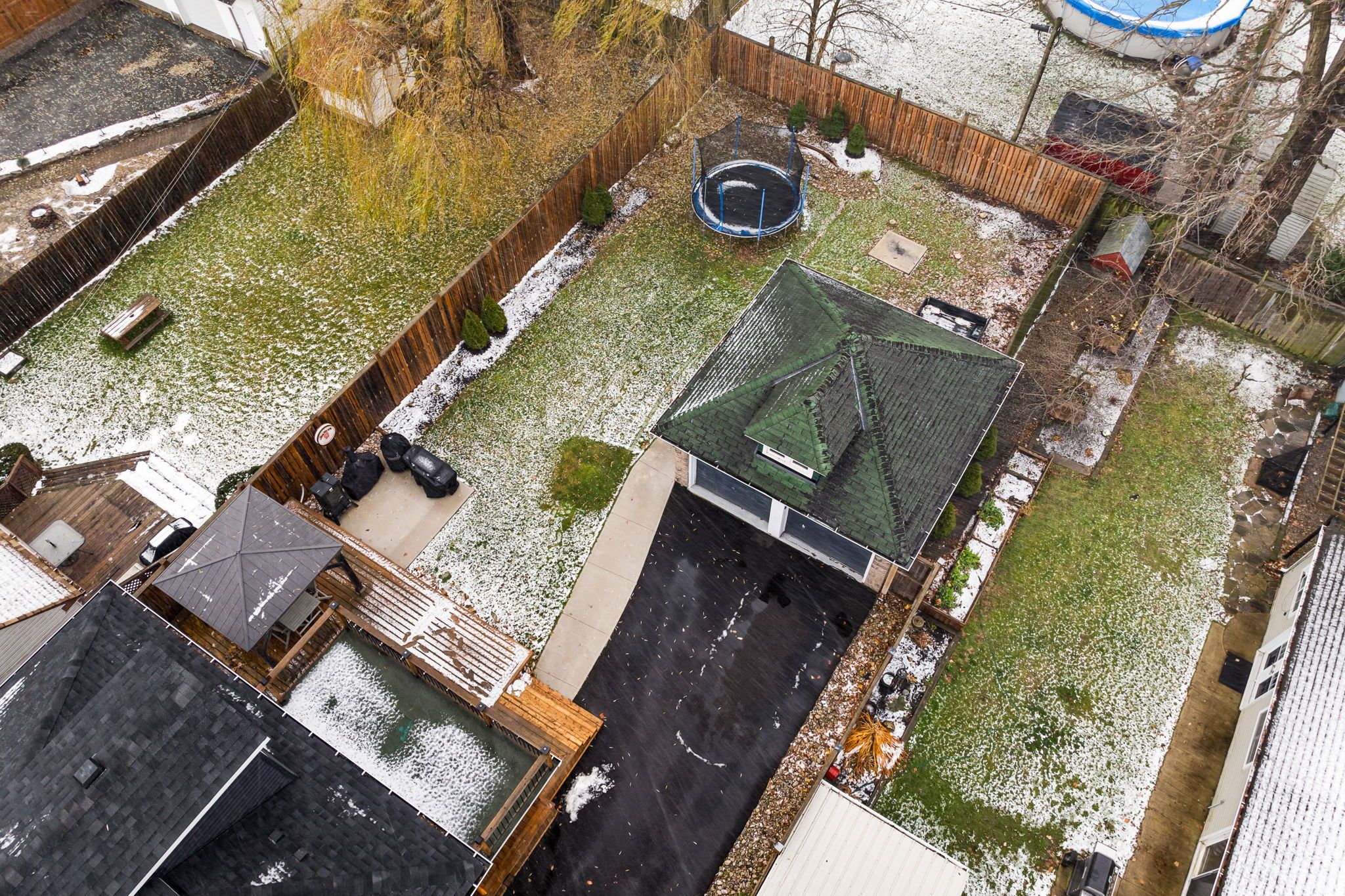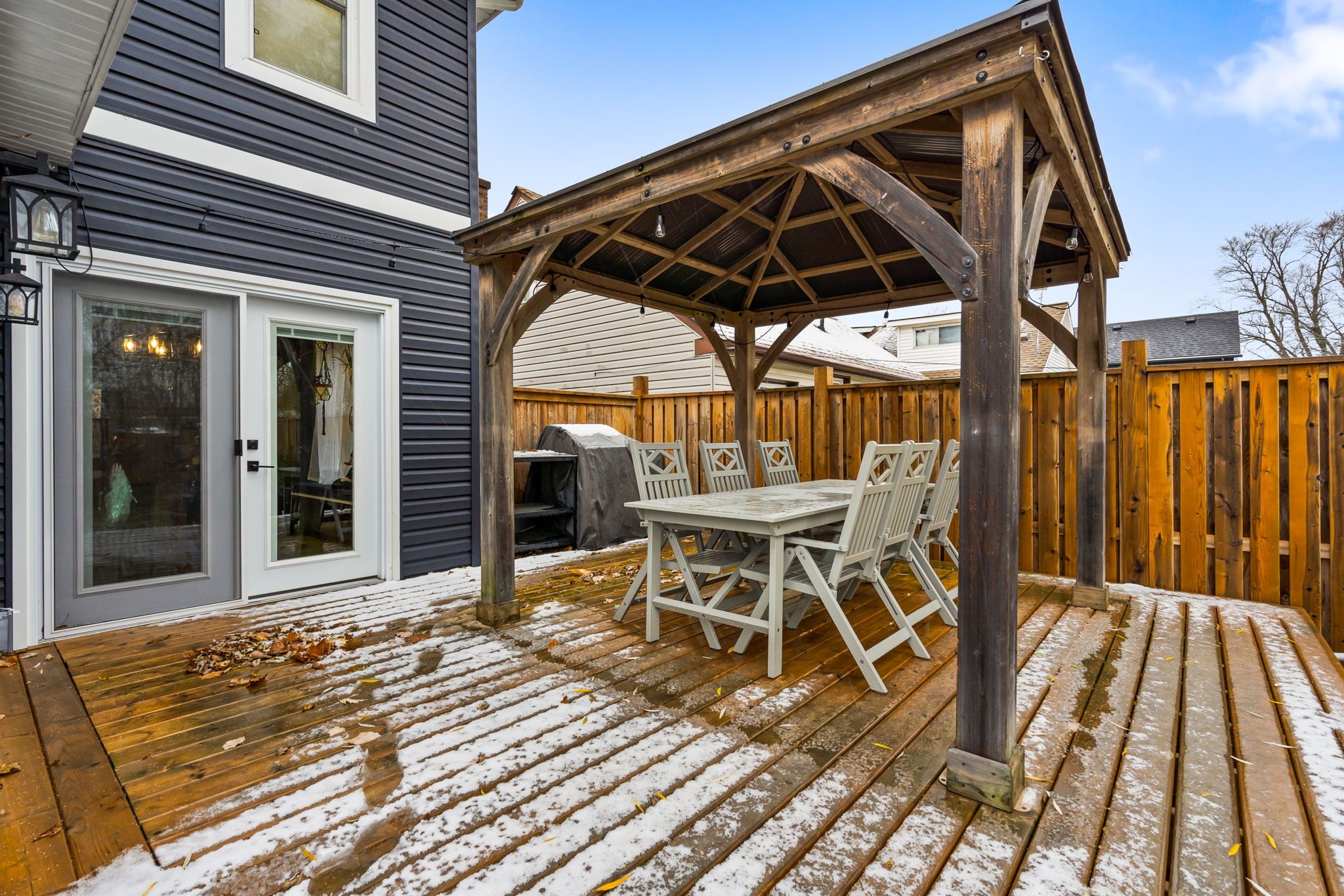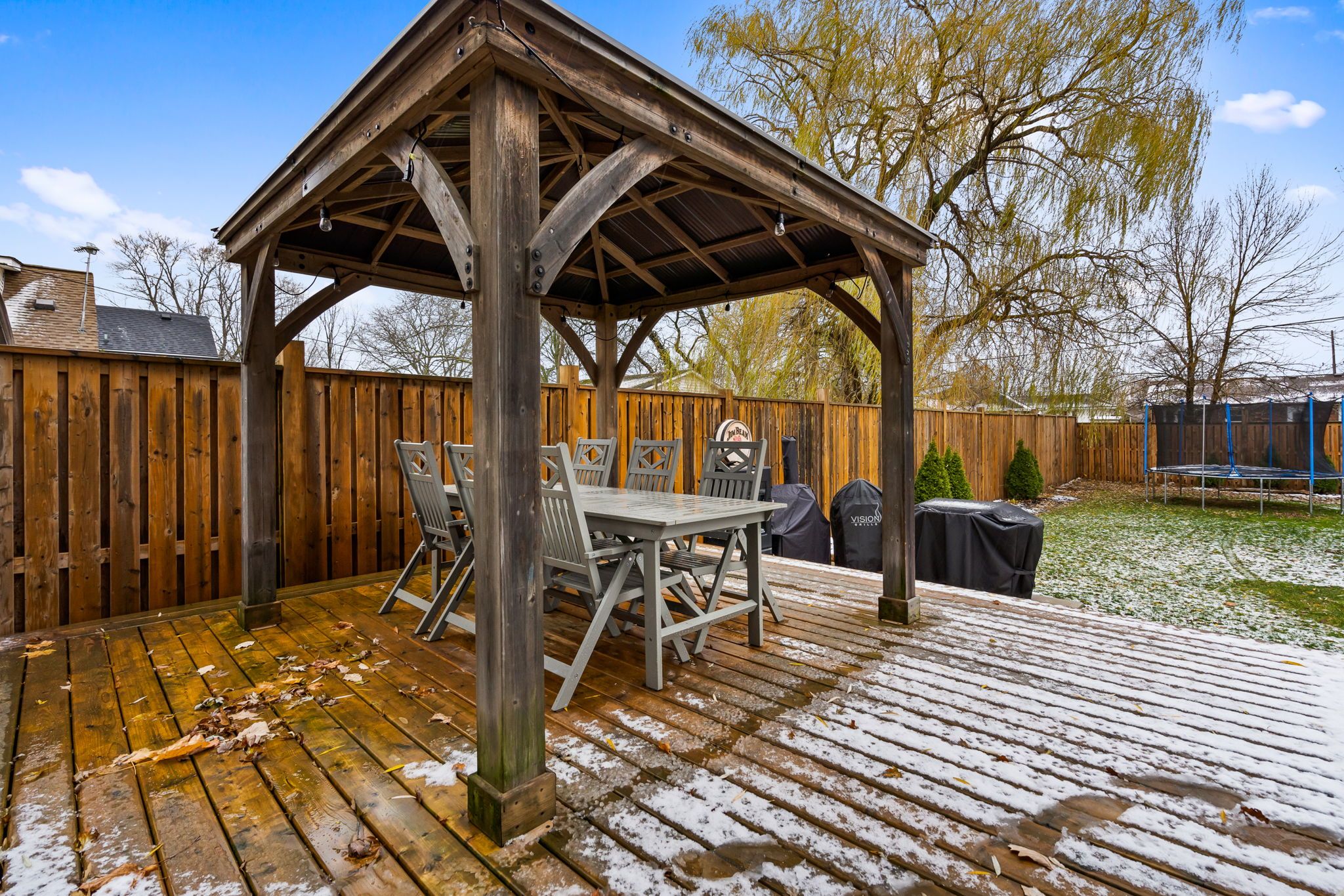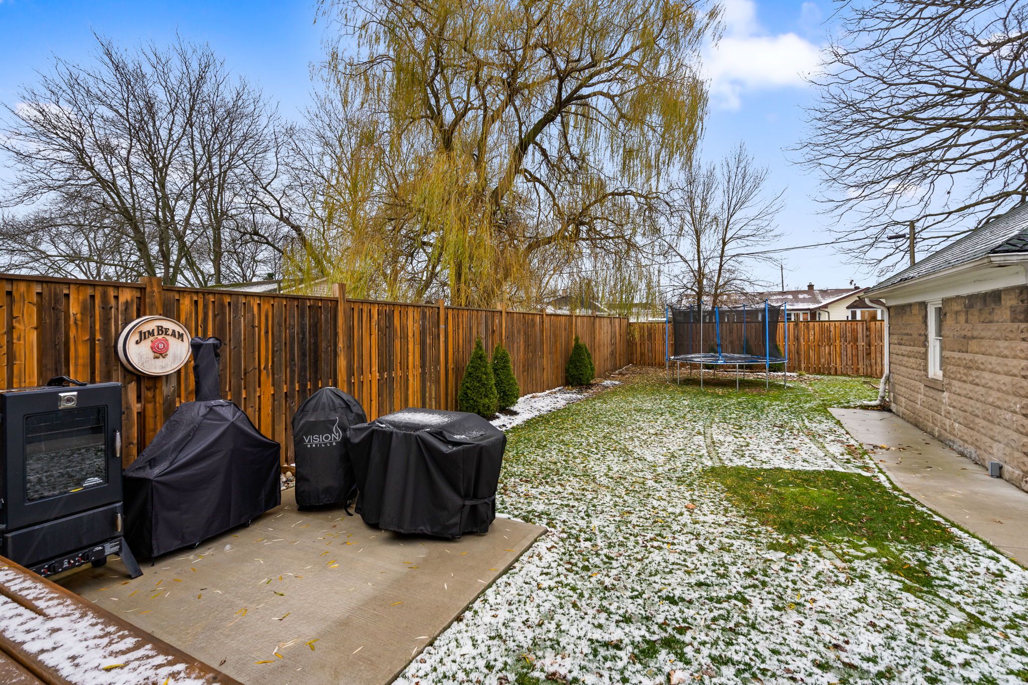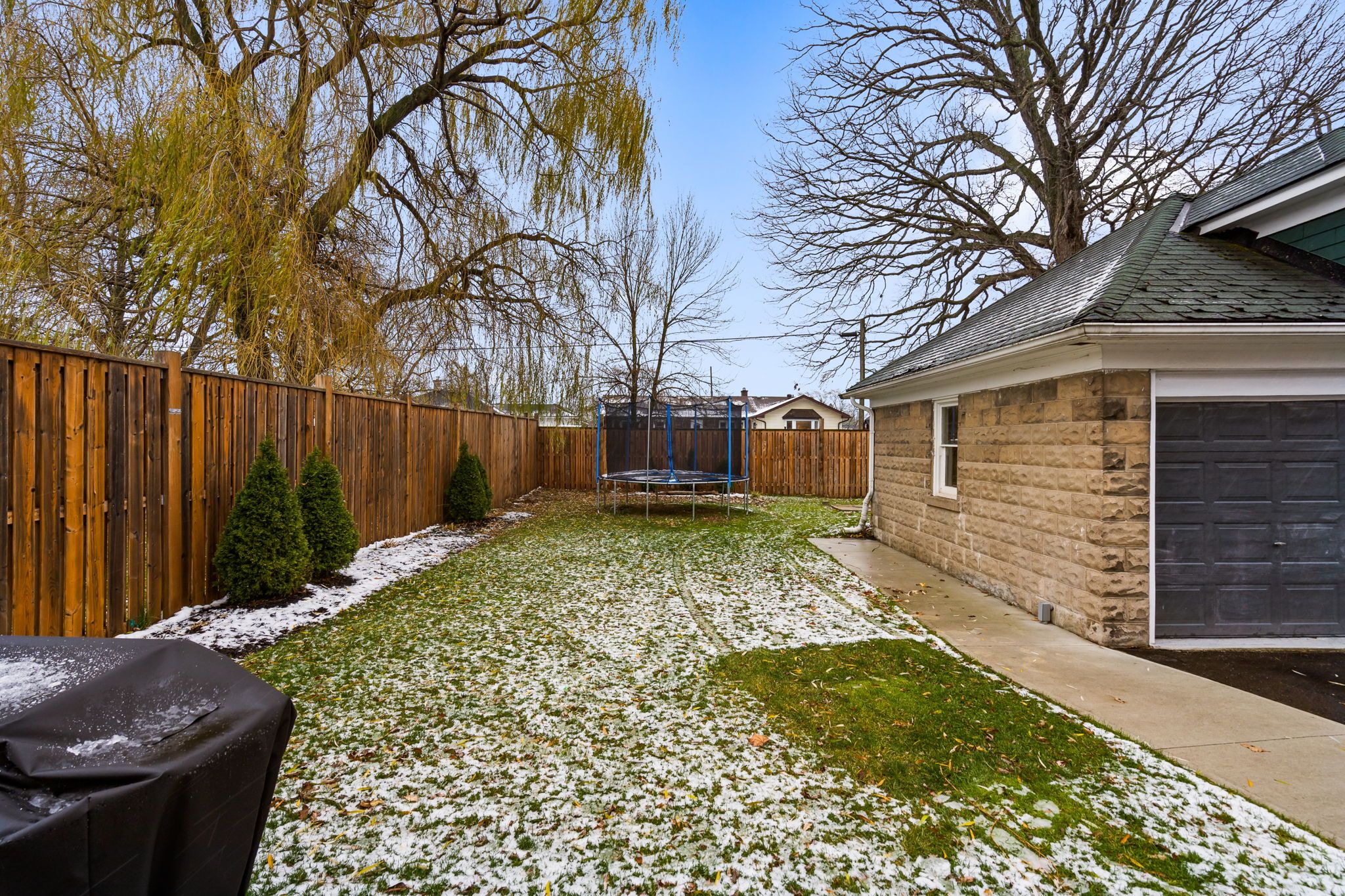 • Fenced backyard includes a double garage, ideal for a workshop or hobbies.