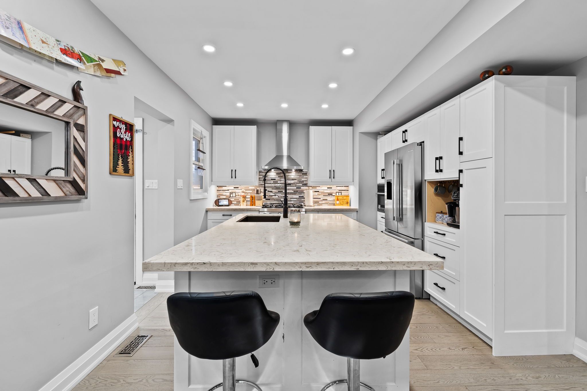 • Custom kitchen features quartz countertops and a large island for cooking.
