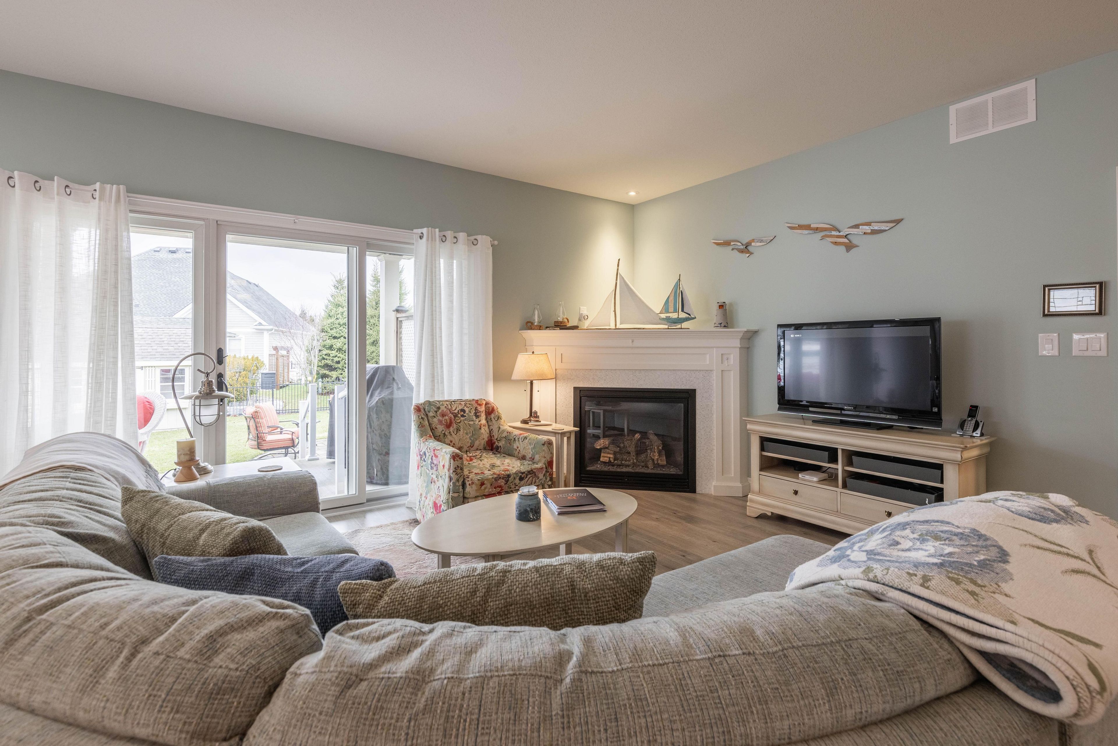 Enjoy relaxed living in ridgeway by the lake, an upscale adult lifestyle community just minutes from lake erie, the charming shops and restaurants of historic ridgeway, and the white sand beaches of crystal beach. This bright 4-bedroom, 3-bathroom bungalow offers a spacious and welcoming layout. The open-concept kitchen, dining, and living area is perfect for entertaining and everyday living. The kitchen features stainless steel appliances, granite countertops, and an island with seating, flowing into the dining and living areas where a cozy gas fireplace creates a warm focal point. Glass sliding doors open to the private backyard. Designed for comfortable main-floor living, the primary bedroom retreat features a large walk-in closet and 3-piece ensuite with double sinks and shower, along with convenient access to the main floor laundry room. The finished lower level expands the living space with a large recreation room, guest bedroom with double closet, 3-piece bathroom, and a versatile bonus room ideal for a bedroom, storage, or hobby space. Step outside to enjoy the private backyard retreat, where a raised deck overlooks a paver patio sitting area with 14' umbrella, tranquil fountain, large shed, and in-ground irrigation system. Residents may also choose optional membership to the algonquin club, a 9,000 sq ft clubhouse offering a fitness centre, saltwater pool, sauna, games room, billiards, and an active social calendar of community events.