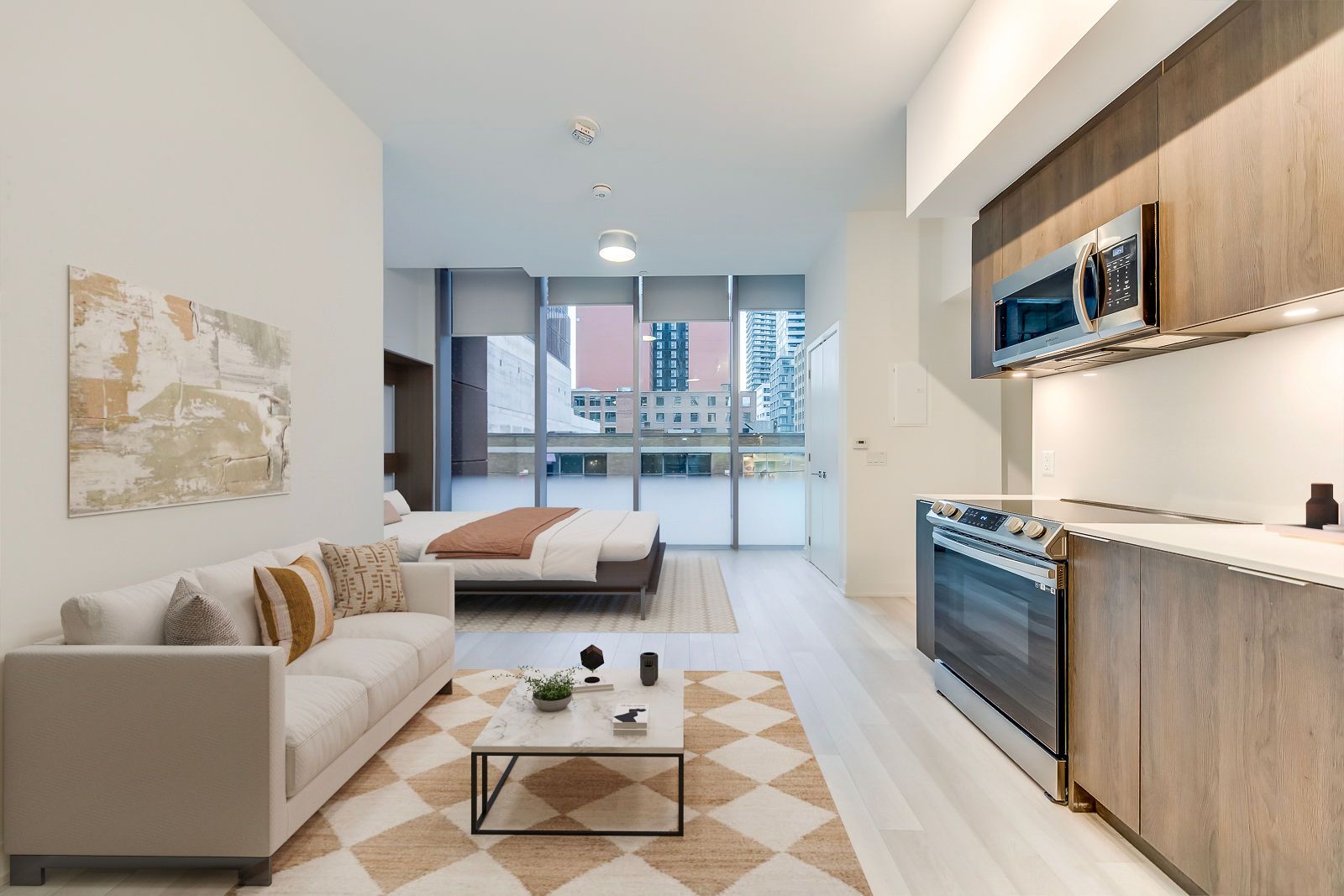 • Generous 478 sq. ft. studio with high ceilings and large windows.