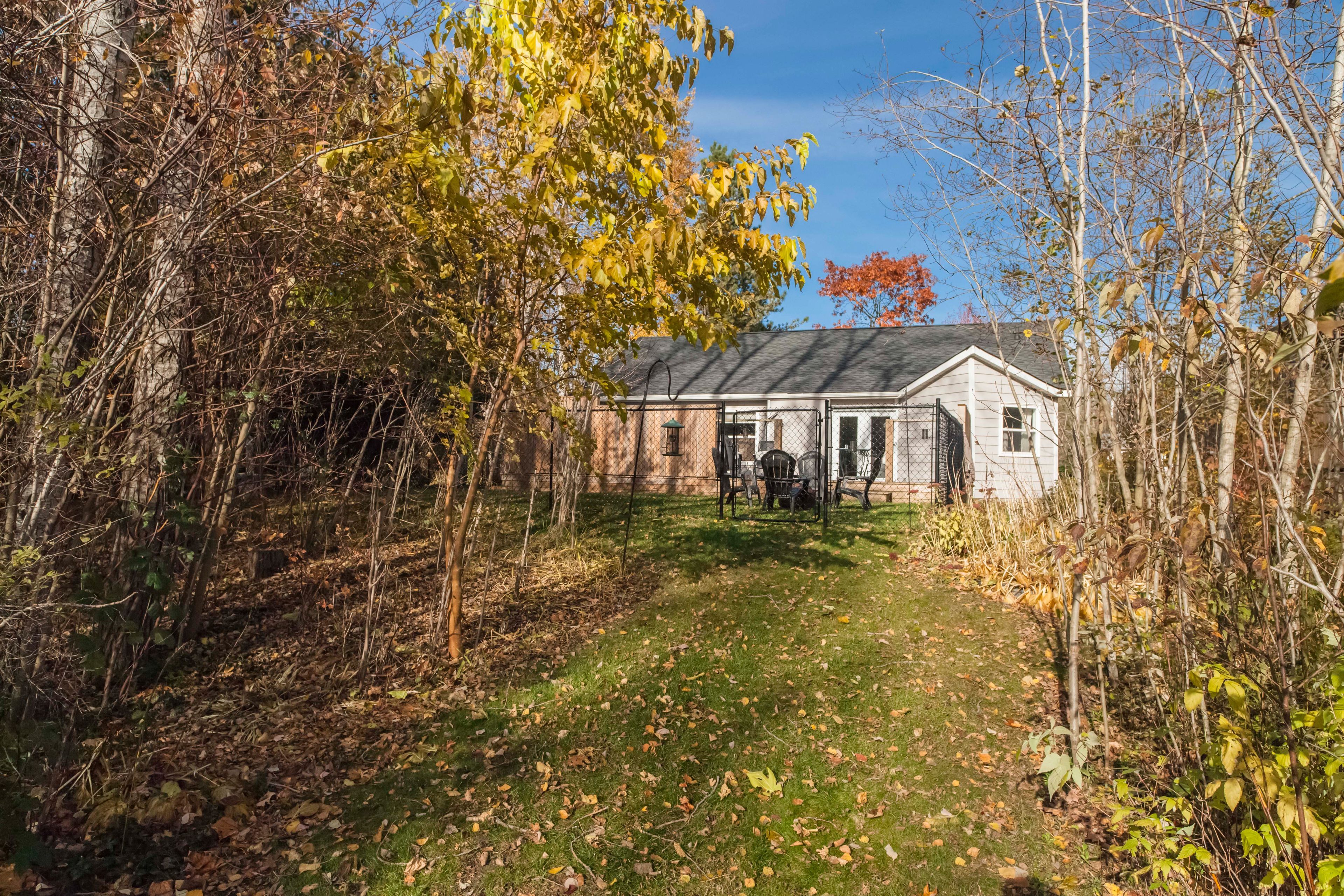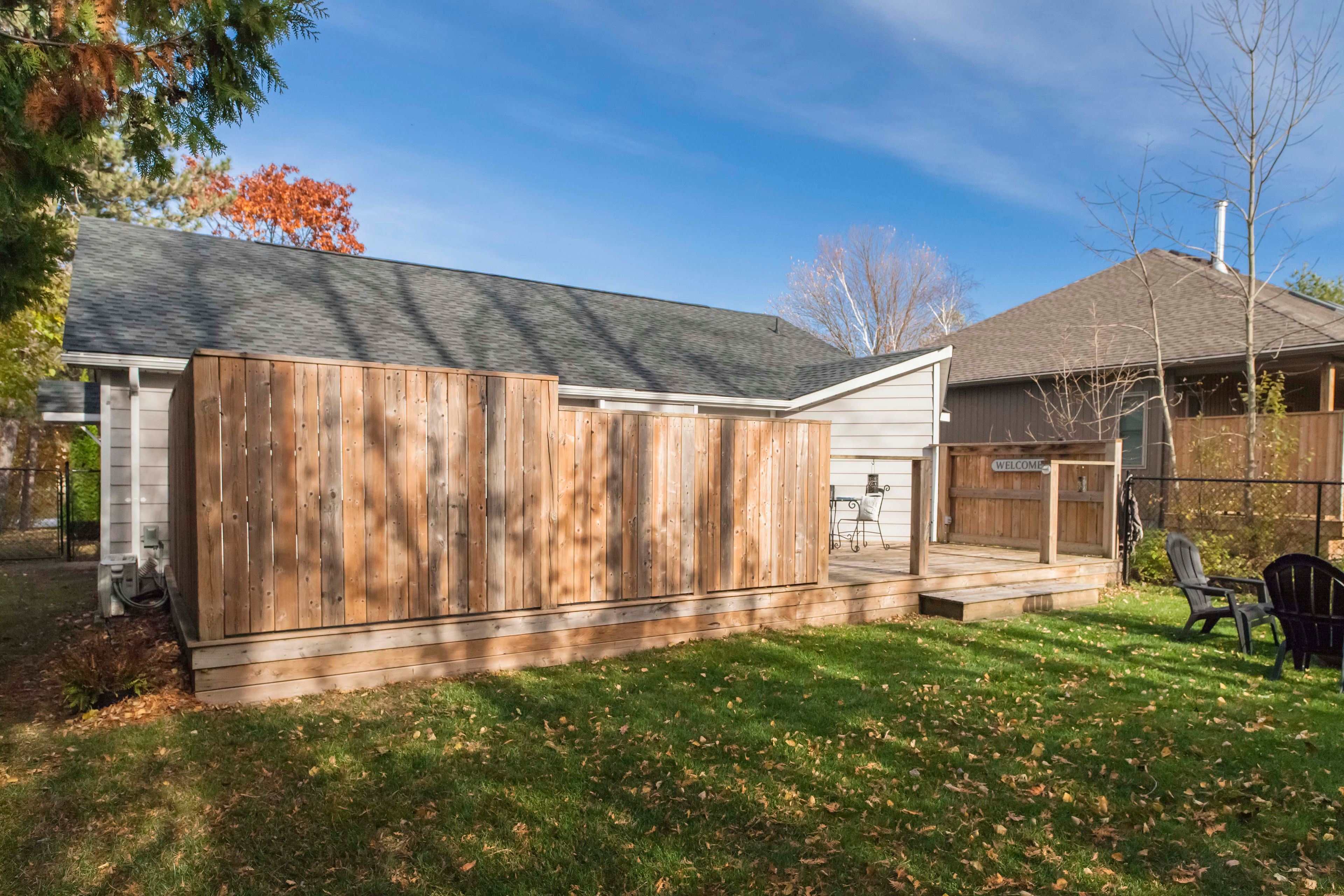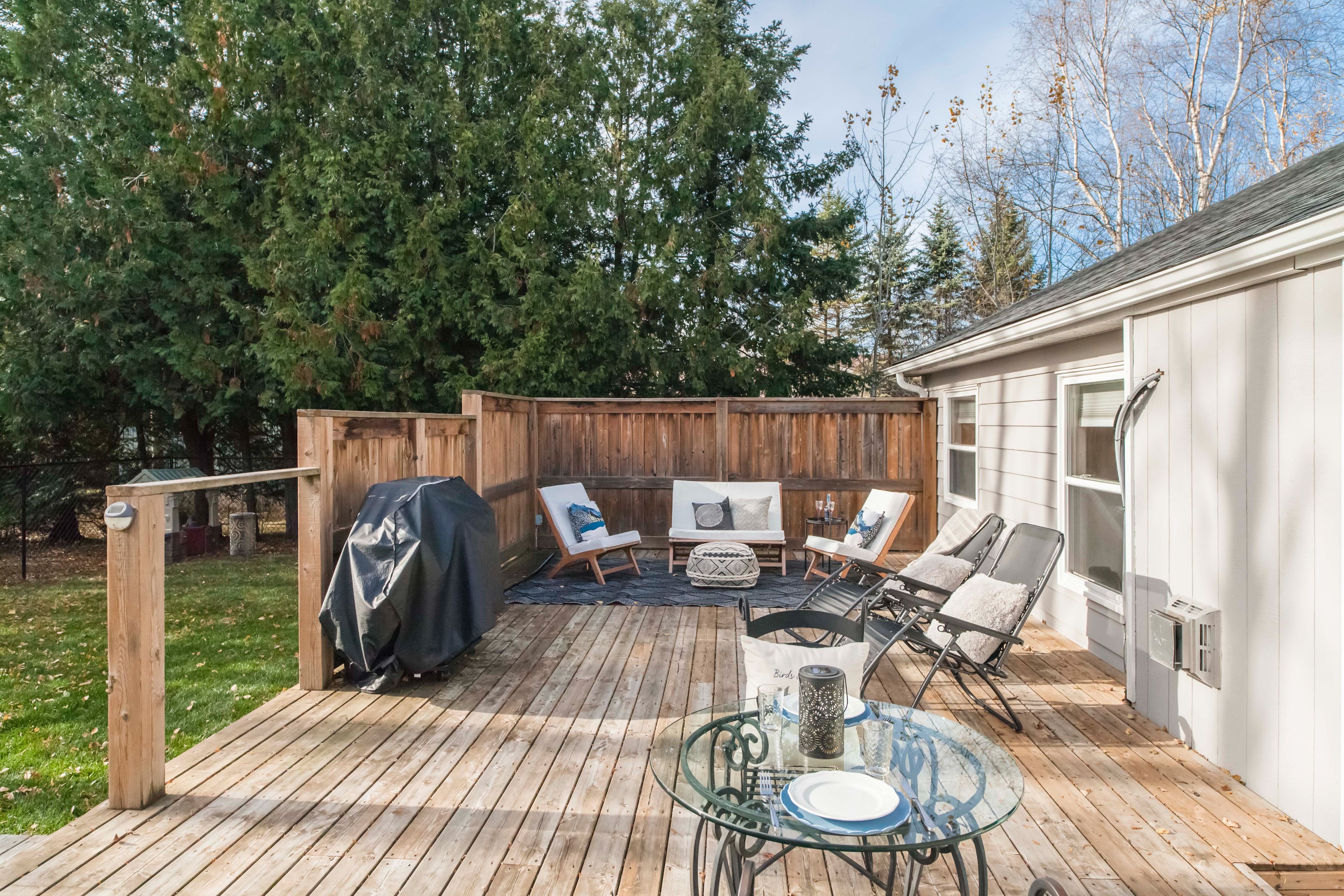 • Private south-facing deck overlooking a fenced yard for outdoor relaxation.