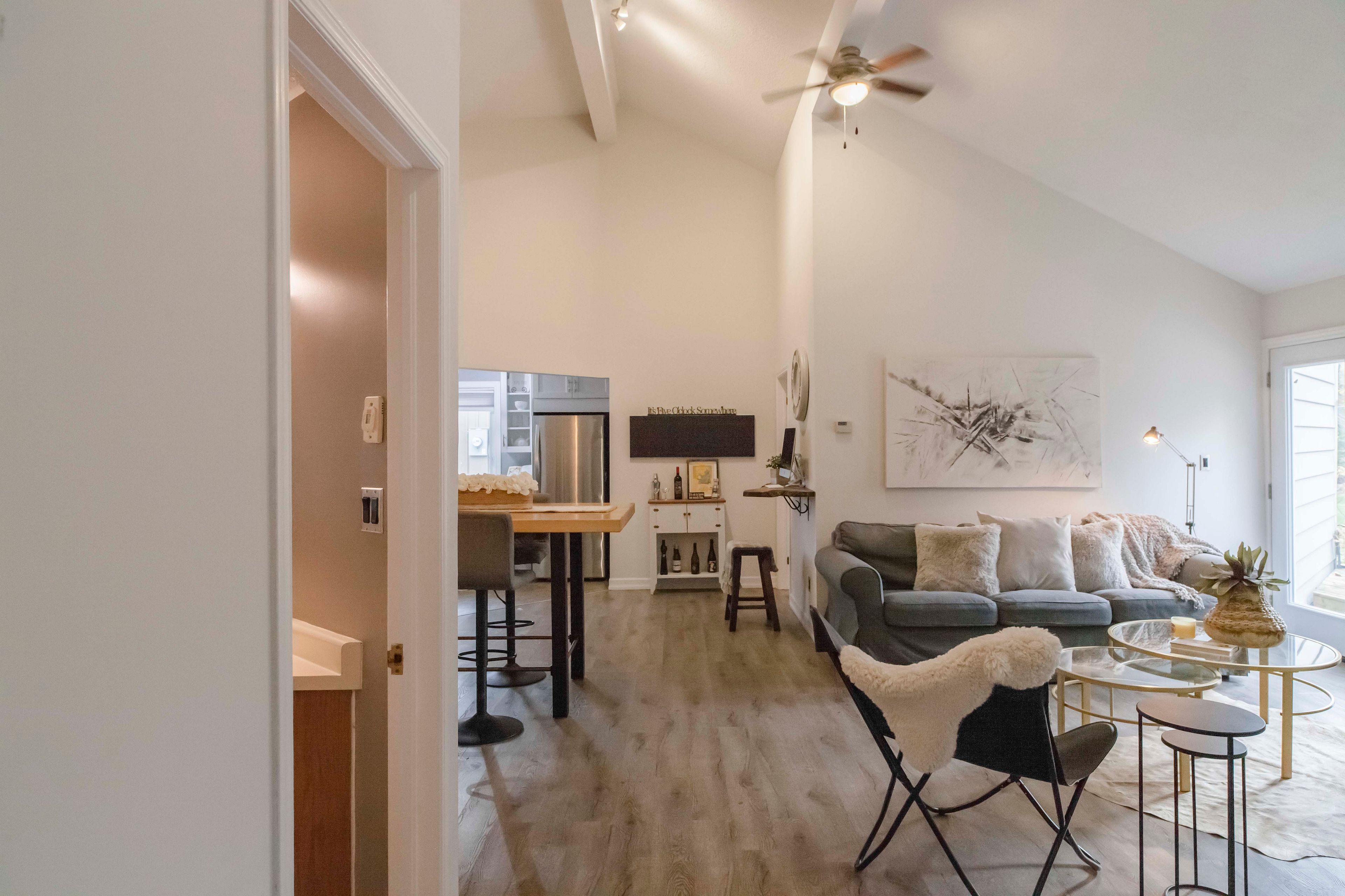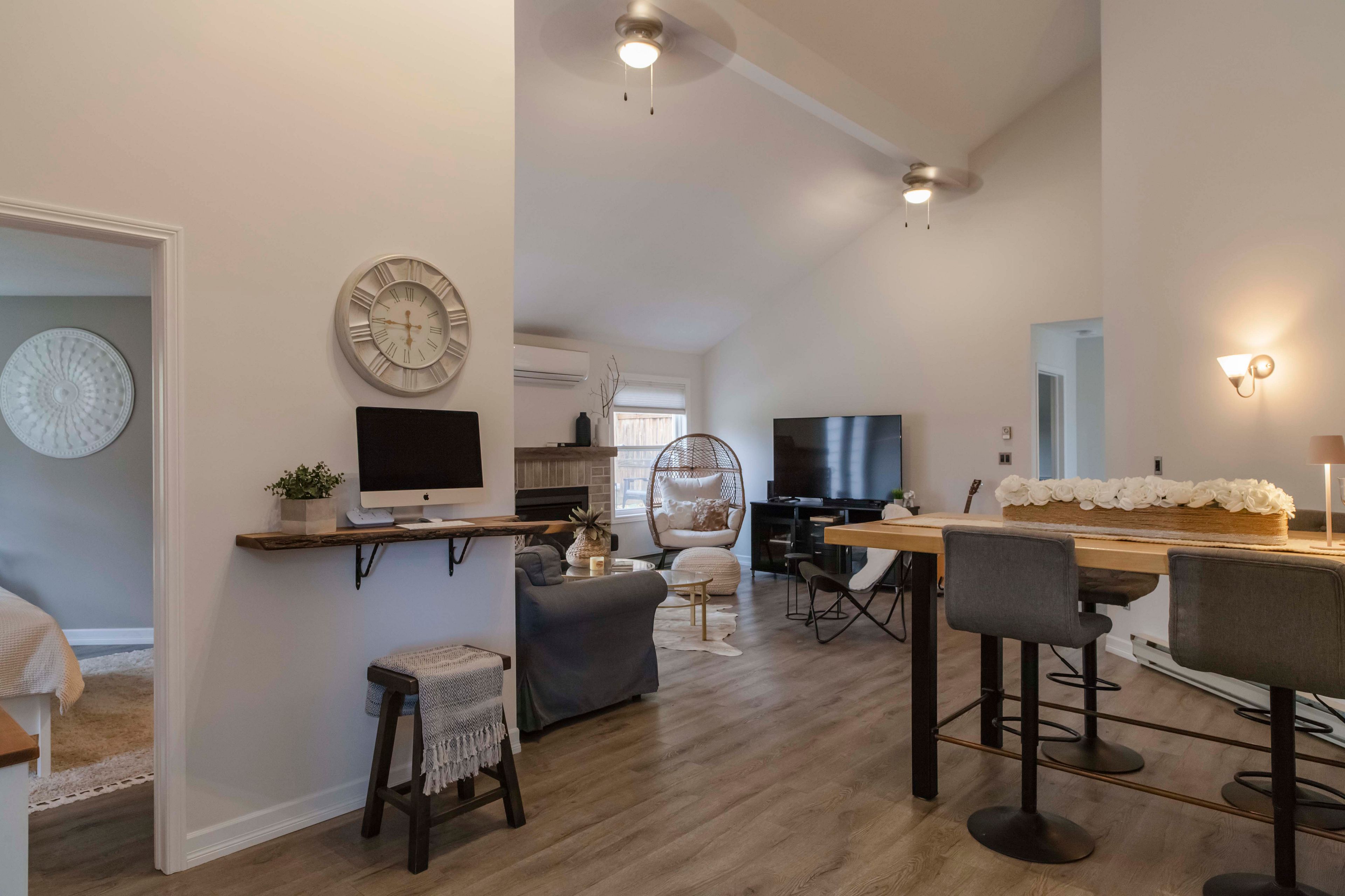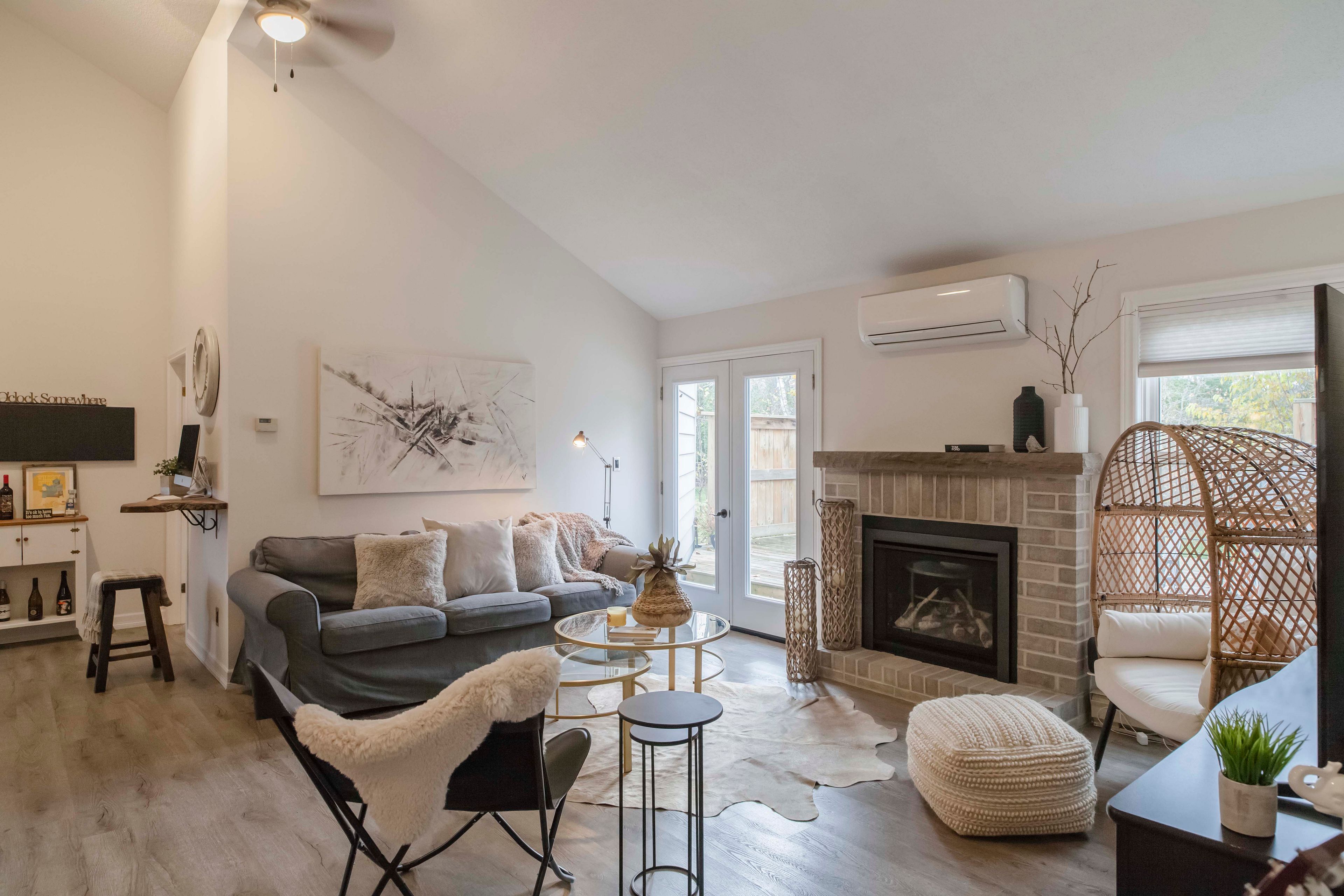 • Open design with vaulted ceilings and a cozy fireplace for spacious living.