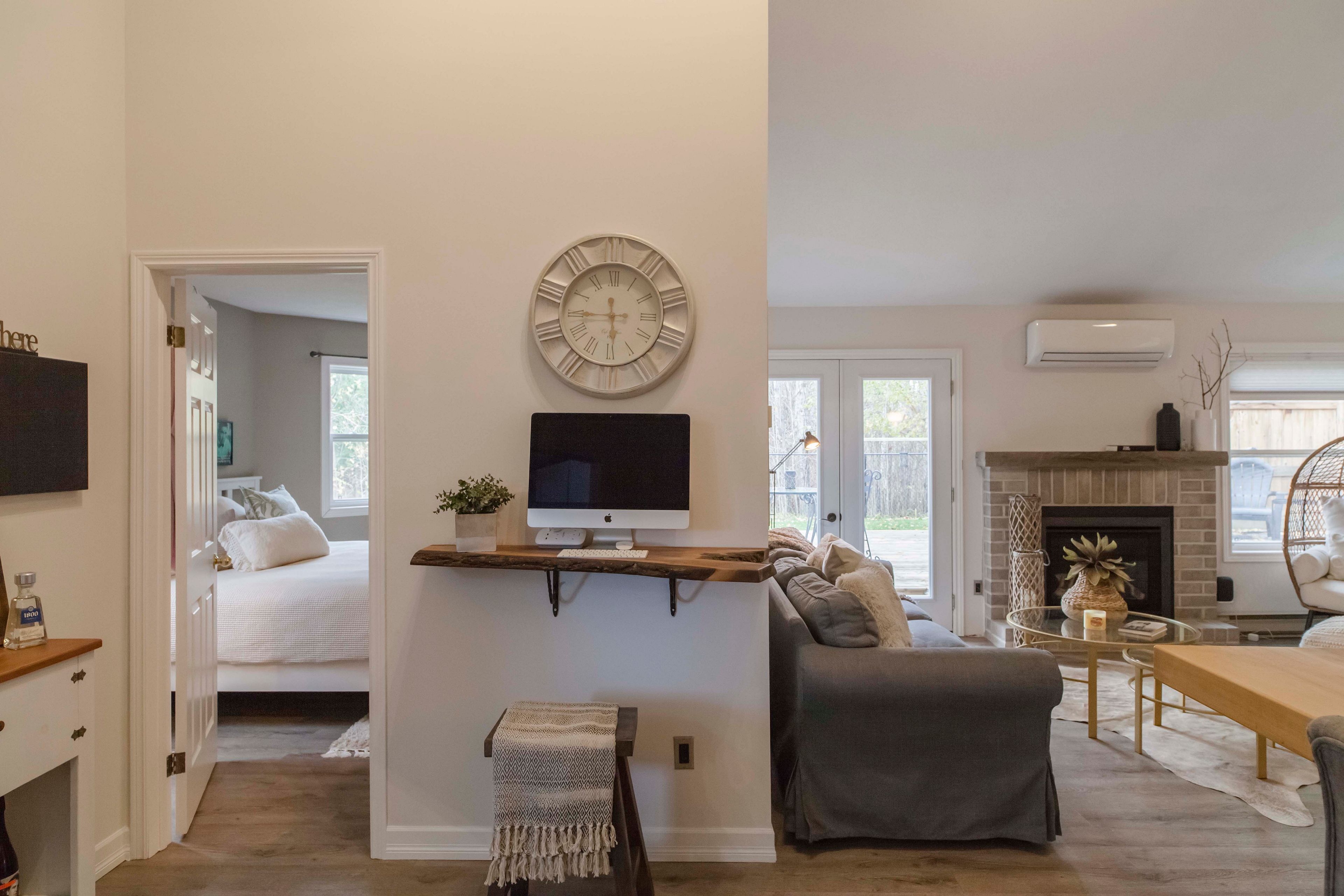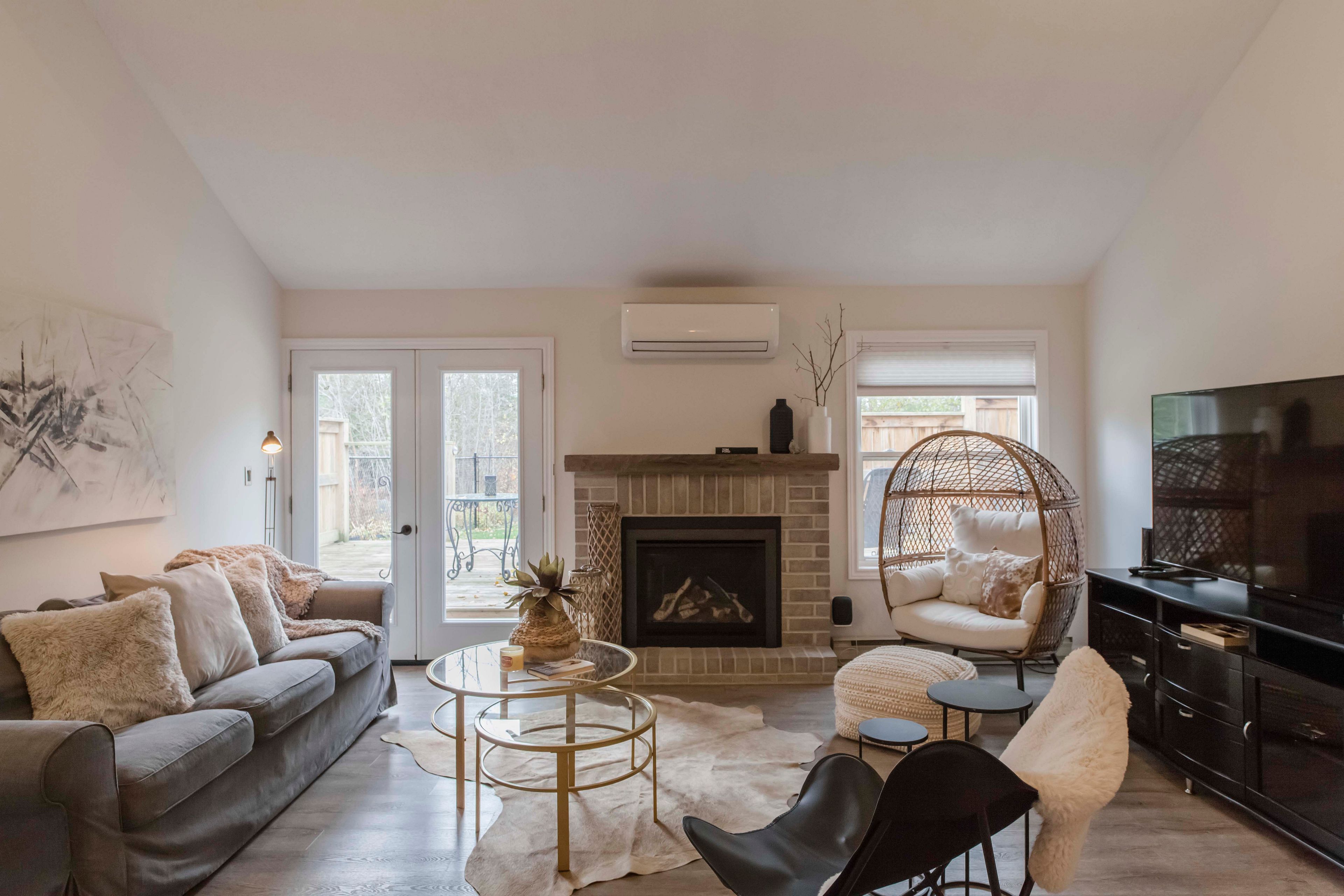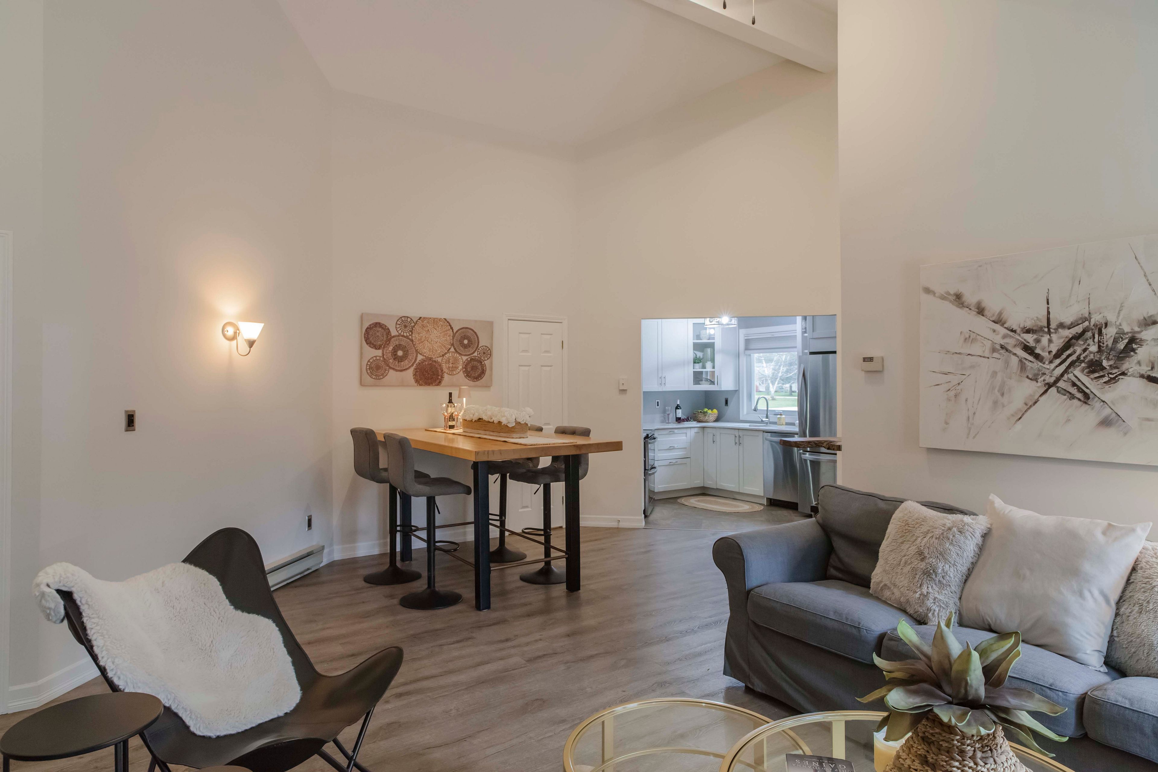 • Open design with vaulted ceilings and a cozy fireplace for spacious living.