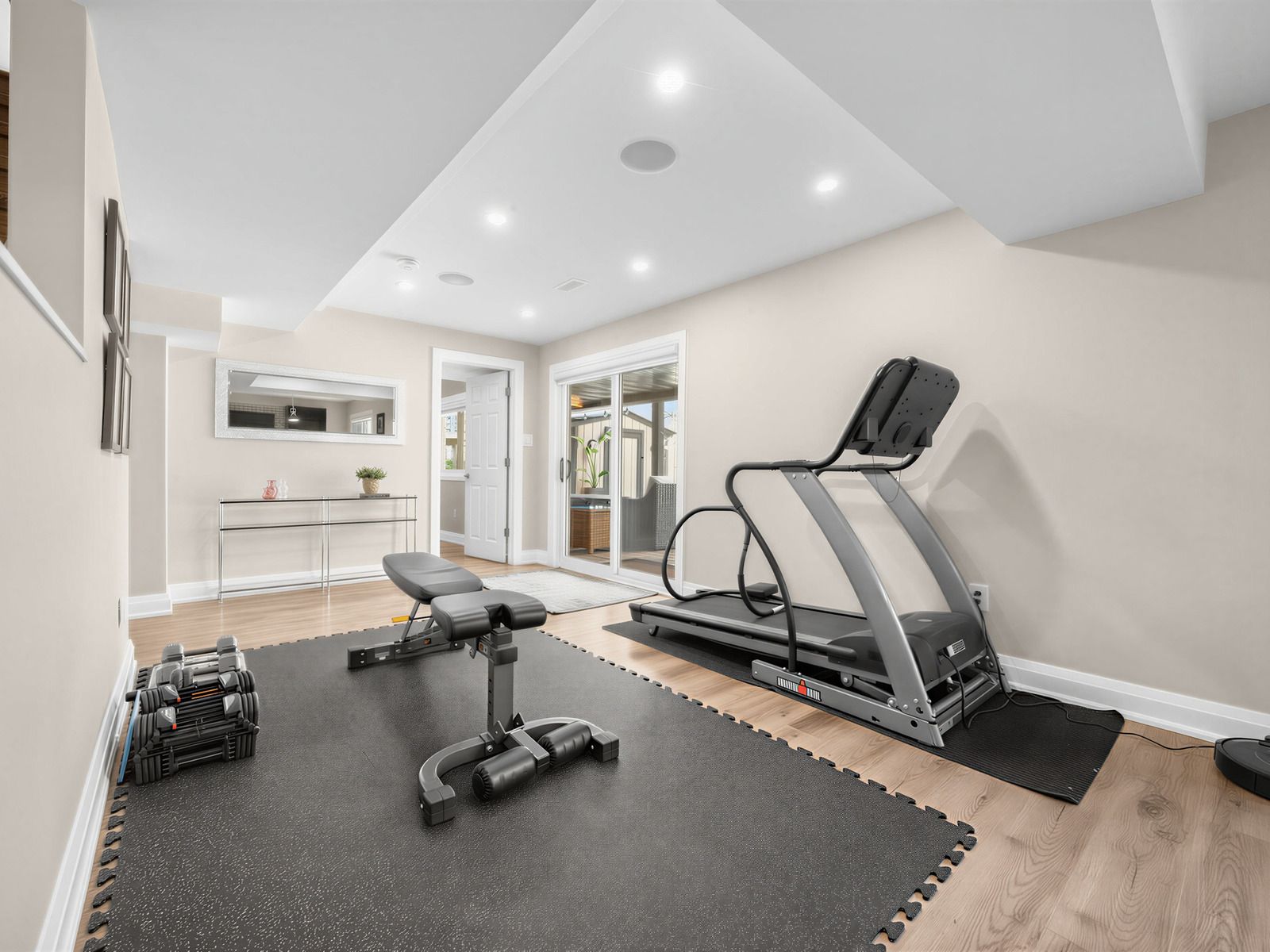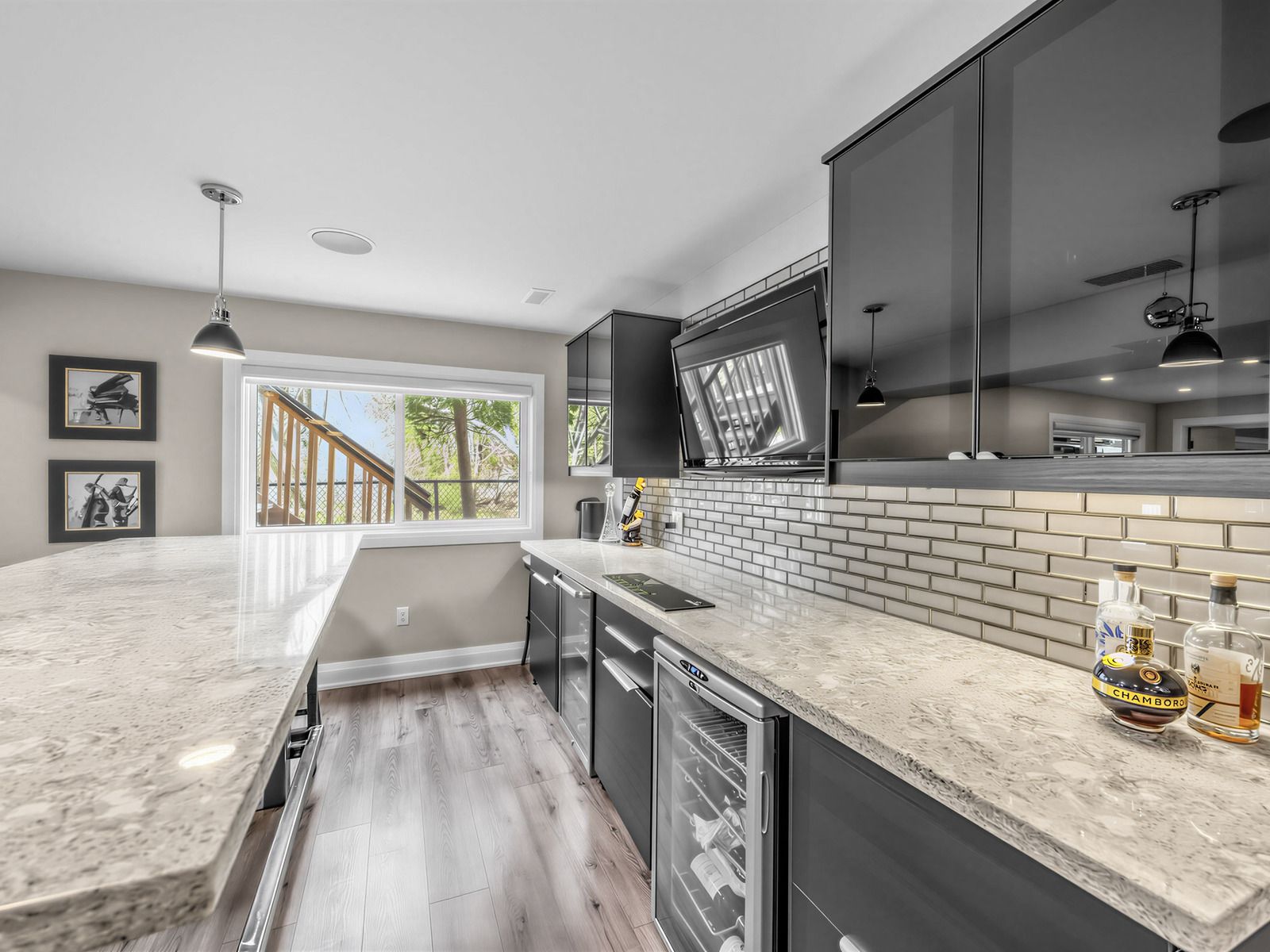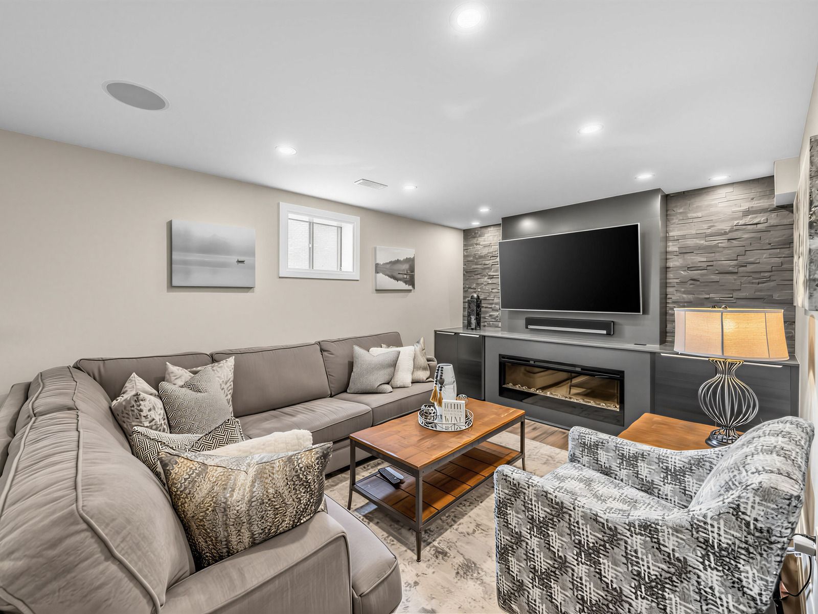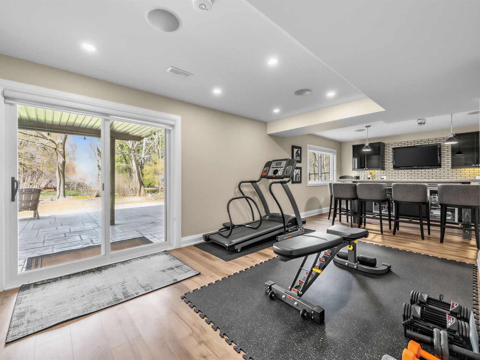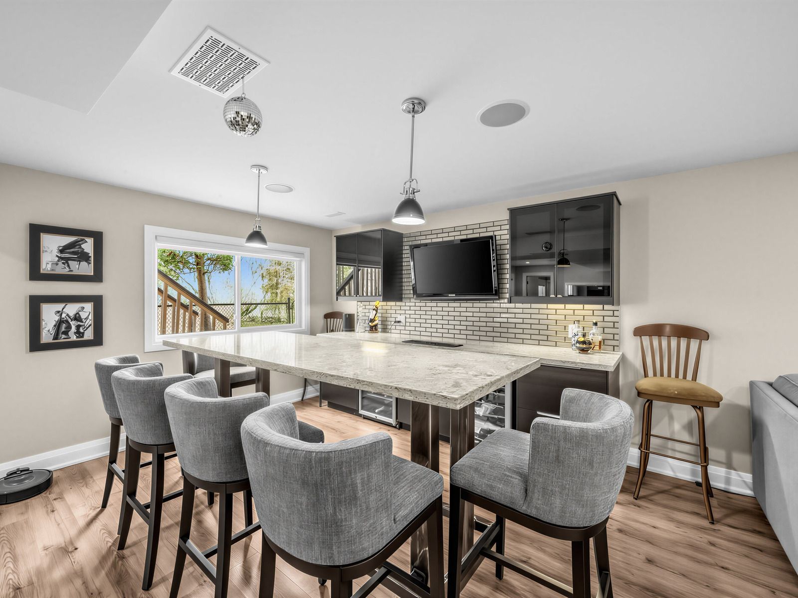 • Finished basement with custom bar, perfect for gatherings and relaxation.