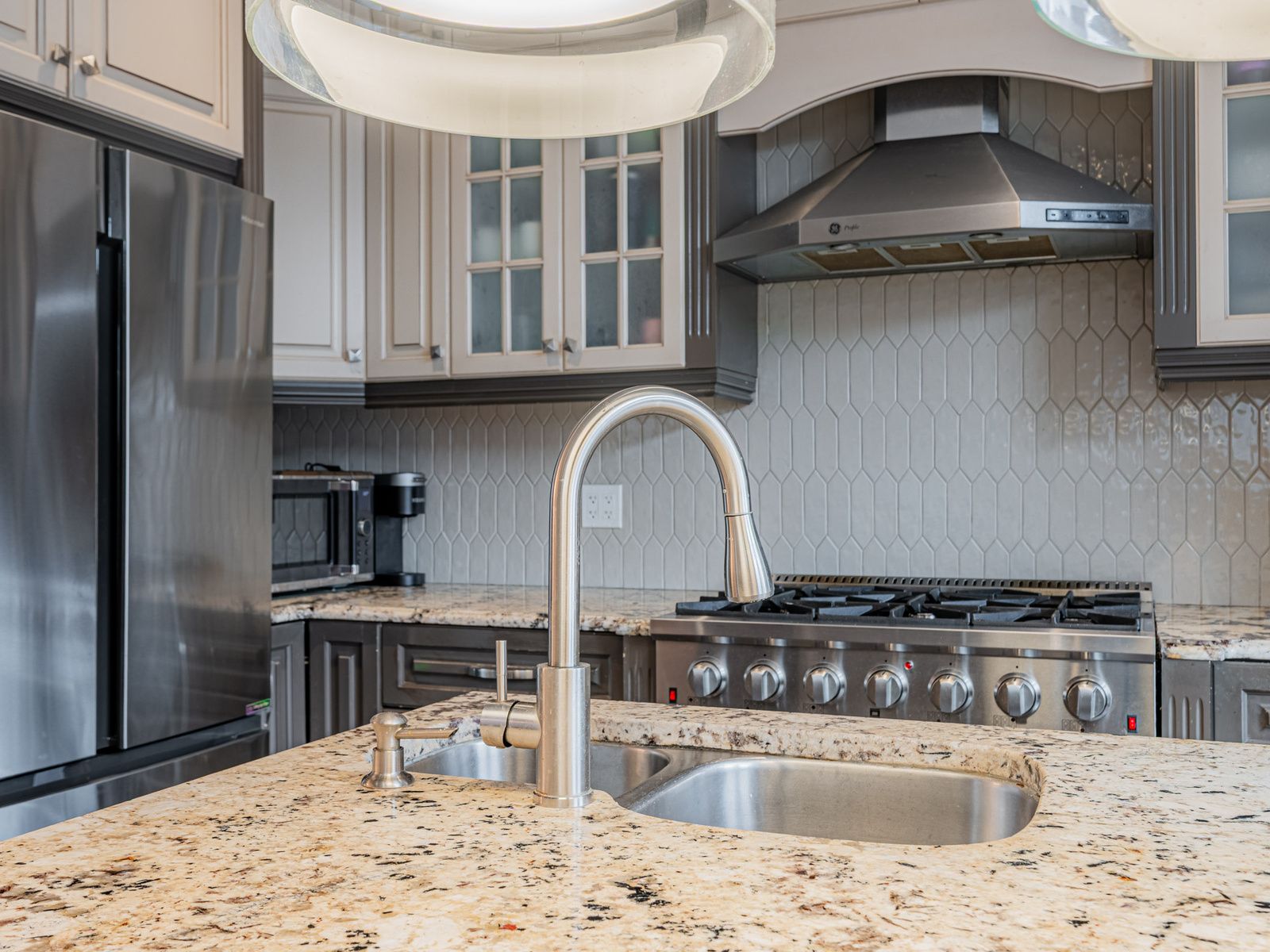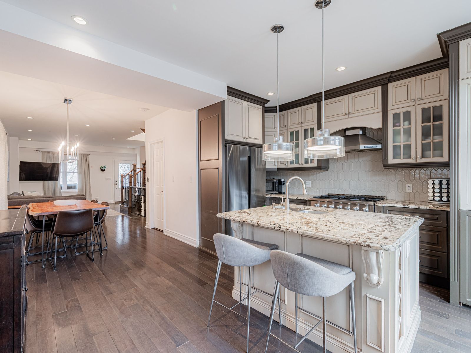 • Gourmet kitchen featuring granite countertops and a 6-burner gas range.