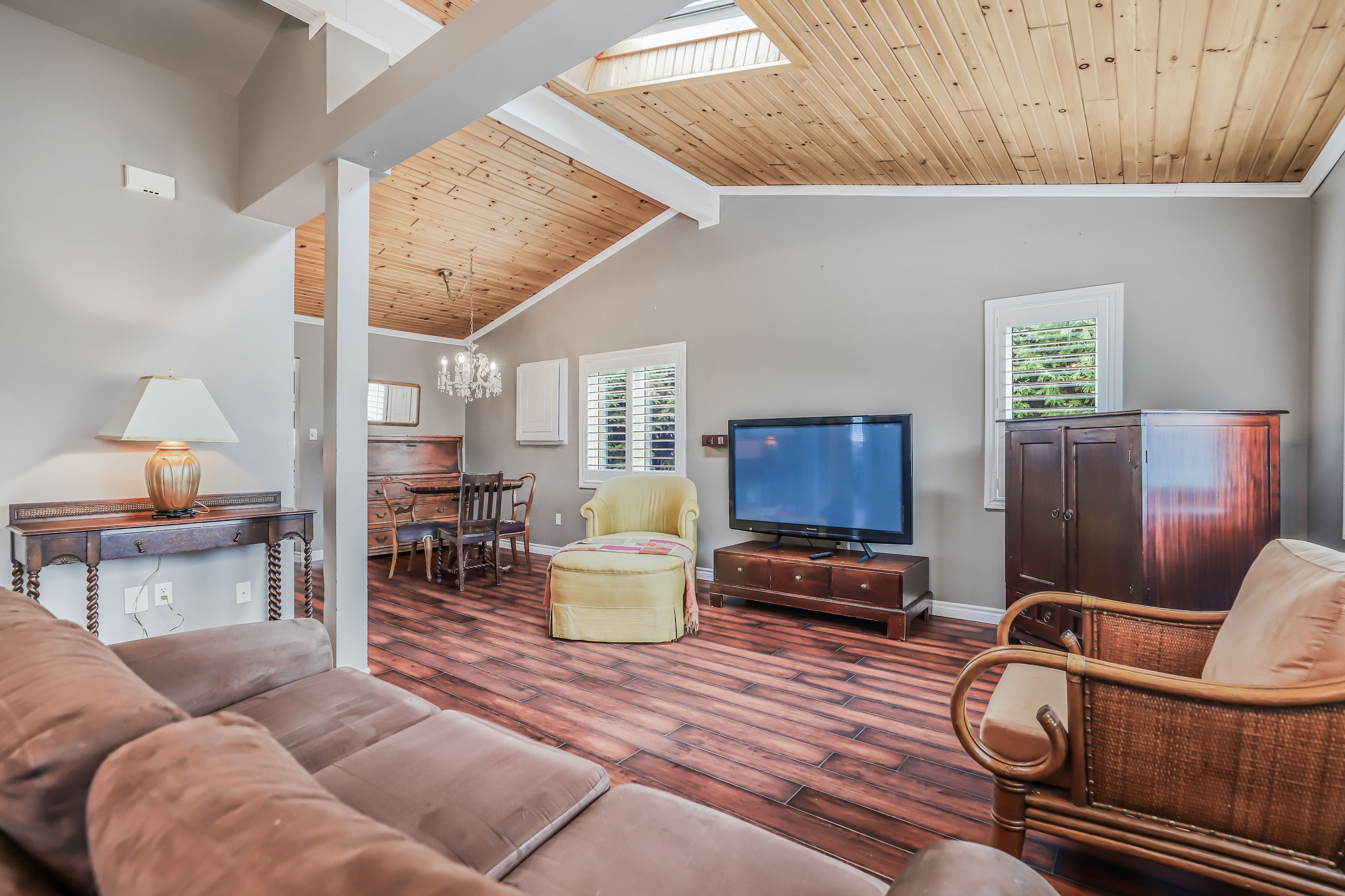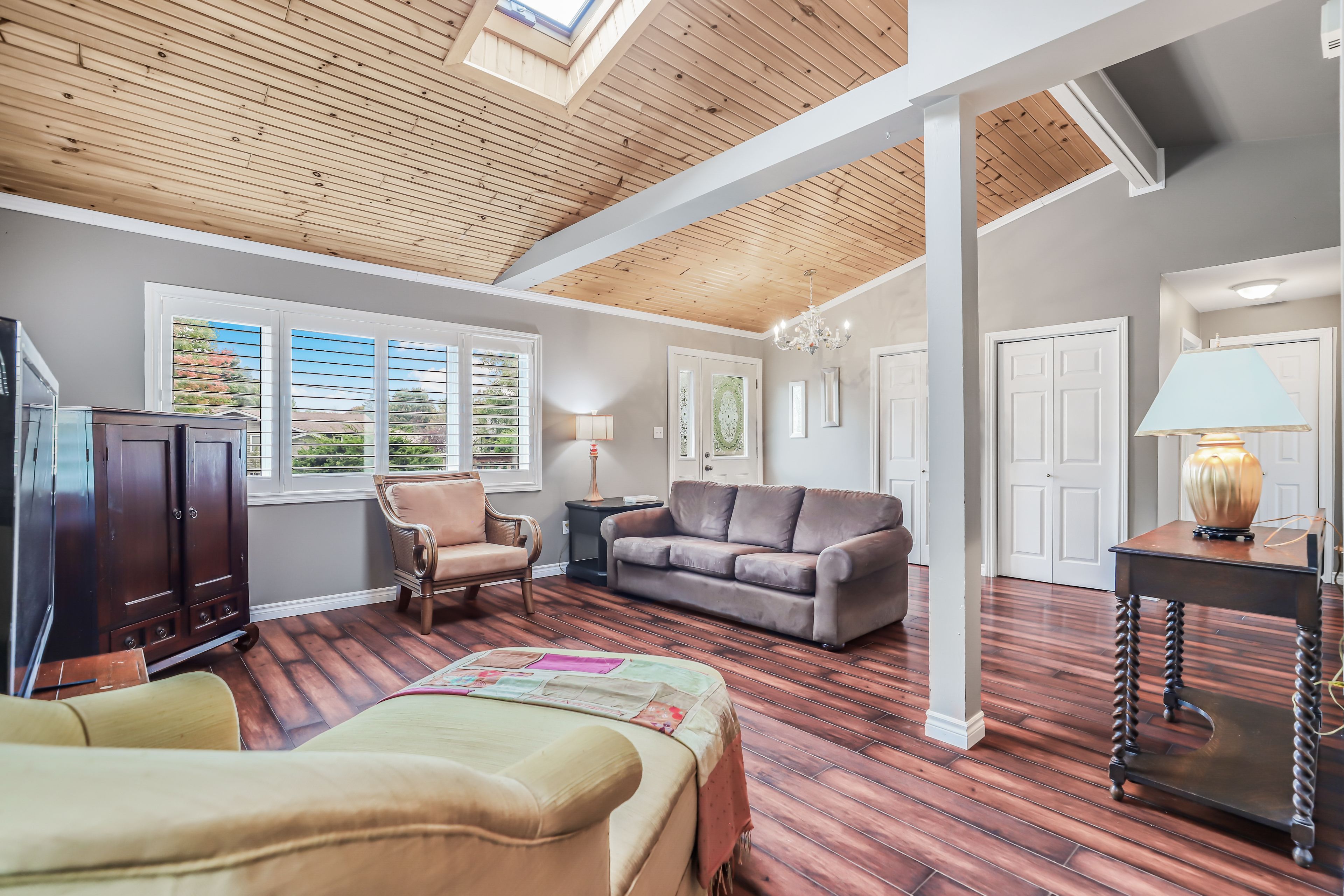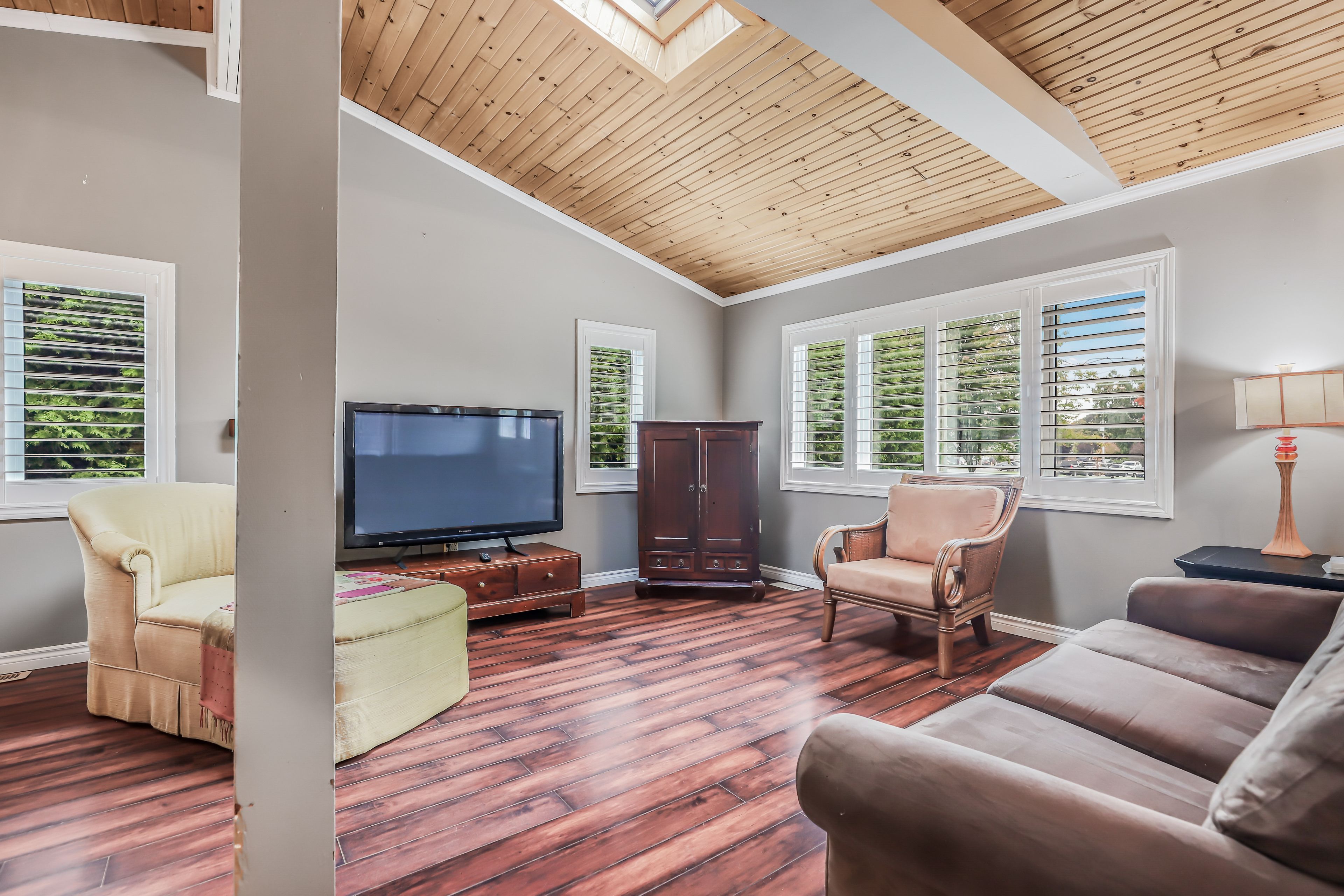 • Bright living room with skylight and cathedral ceiling for ample light.