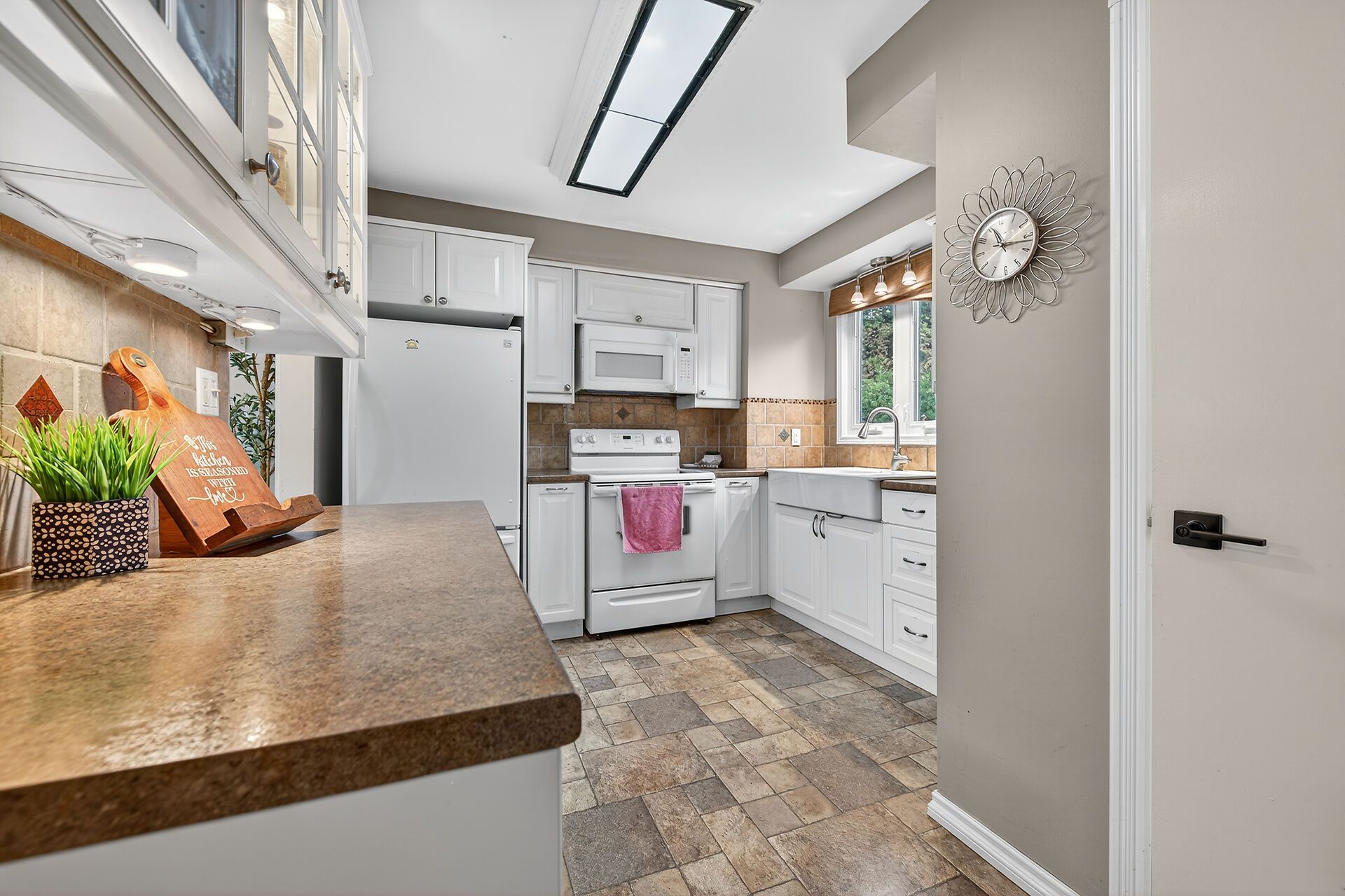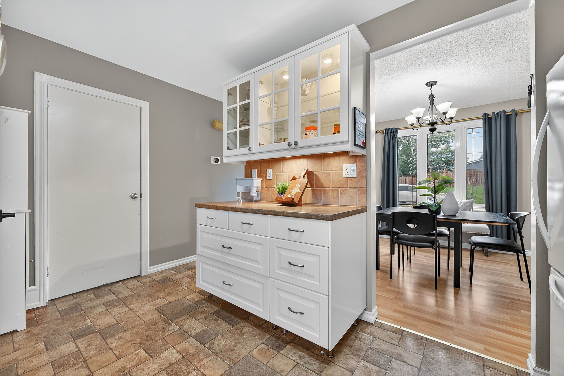 • Modern kitchen with white cabinetry and stylish backsplash.