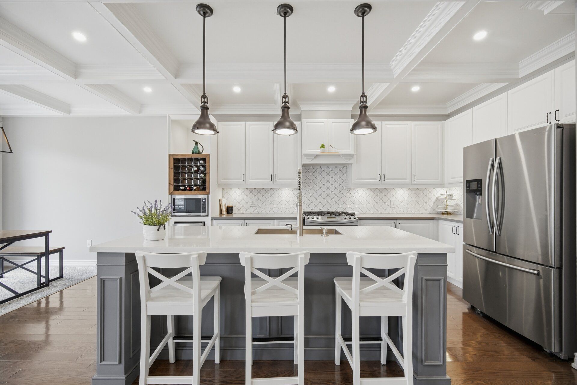 • Large chef's kitchen features a breakfast bar island for casual dining.