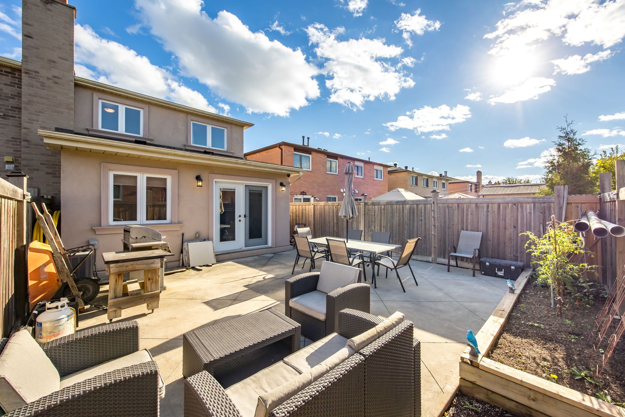 • Professionally landscaped backyard with patterned concrete for gatherings.