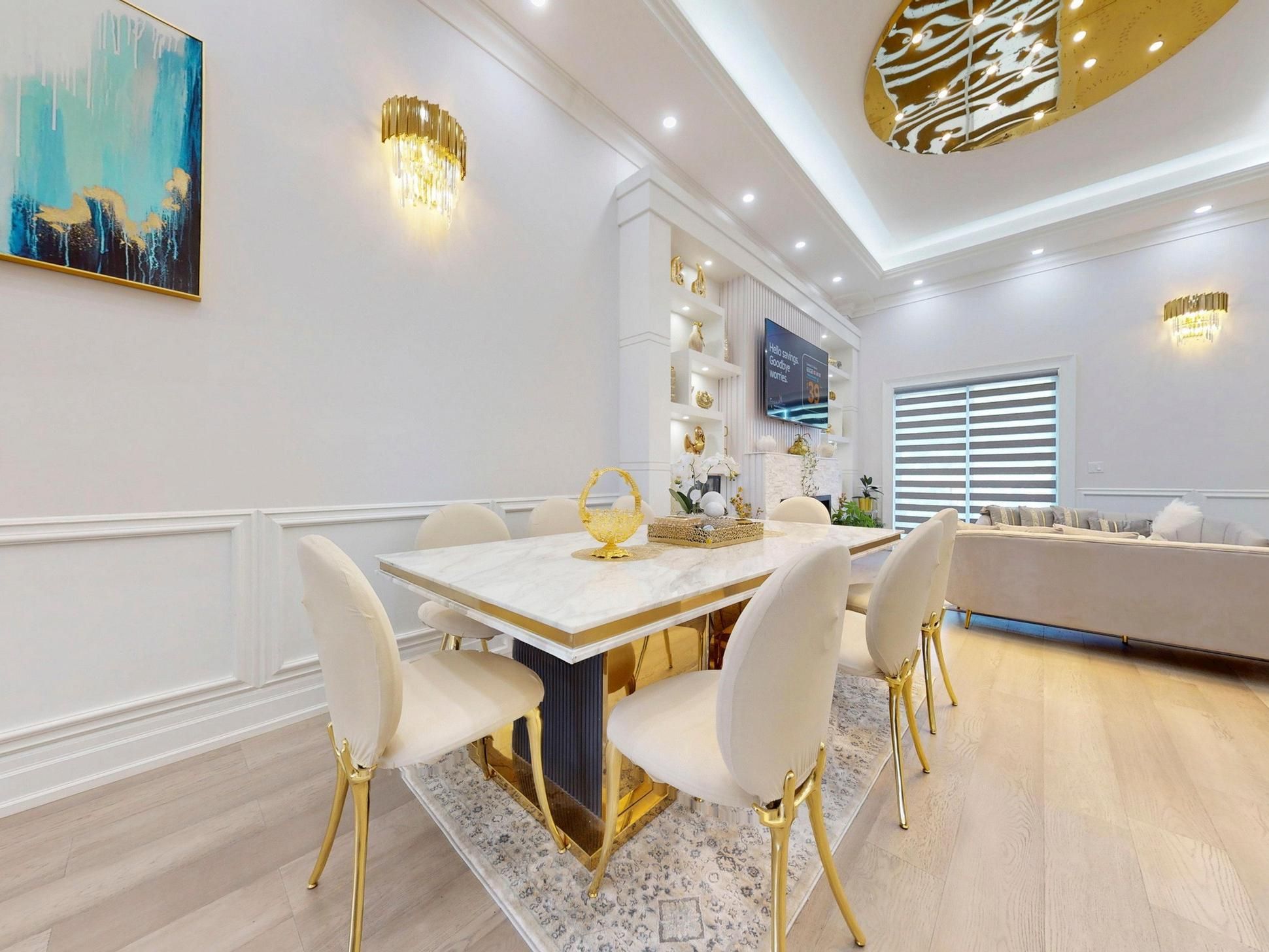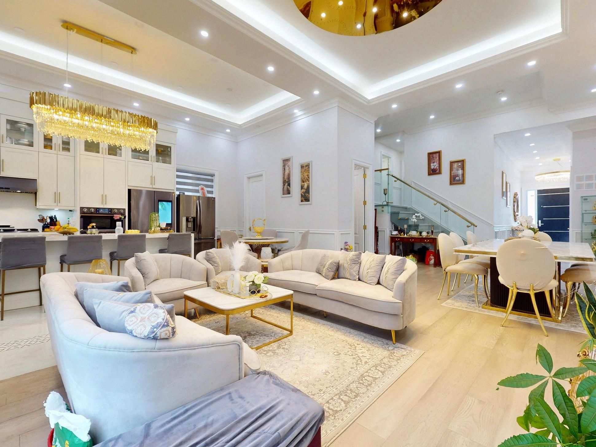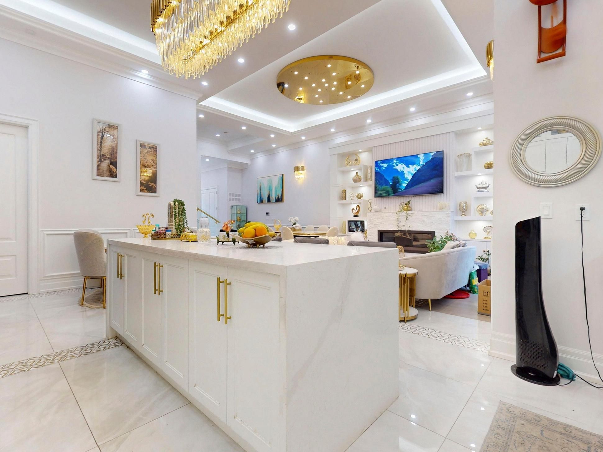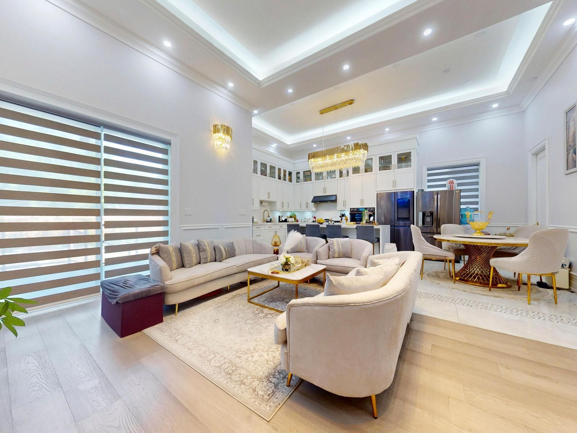 • Luxurious finishes throughout, including coffered ceilings and hardwood floors.