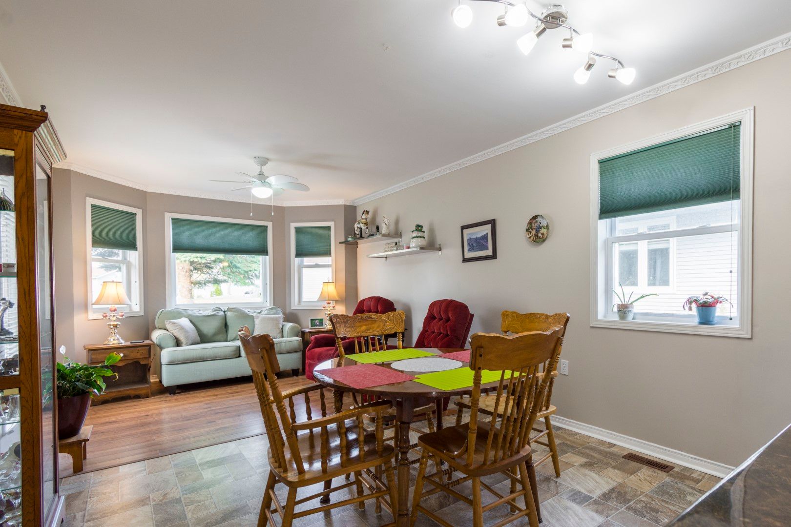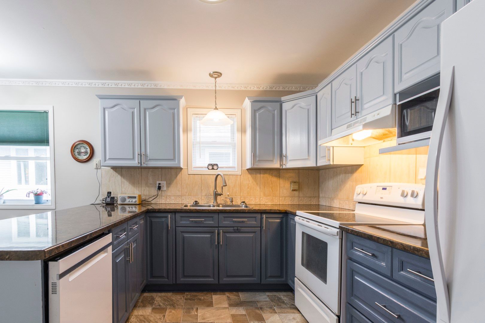 • Upgraded U-shaped kitchen with custom cabinets and open concept breakfast area.