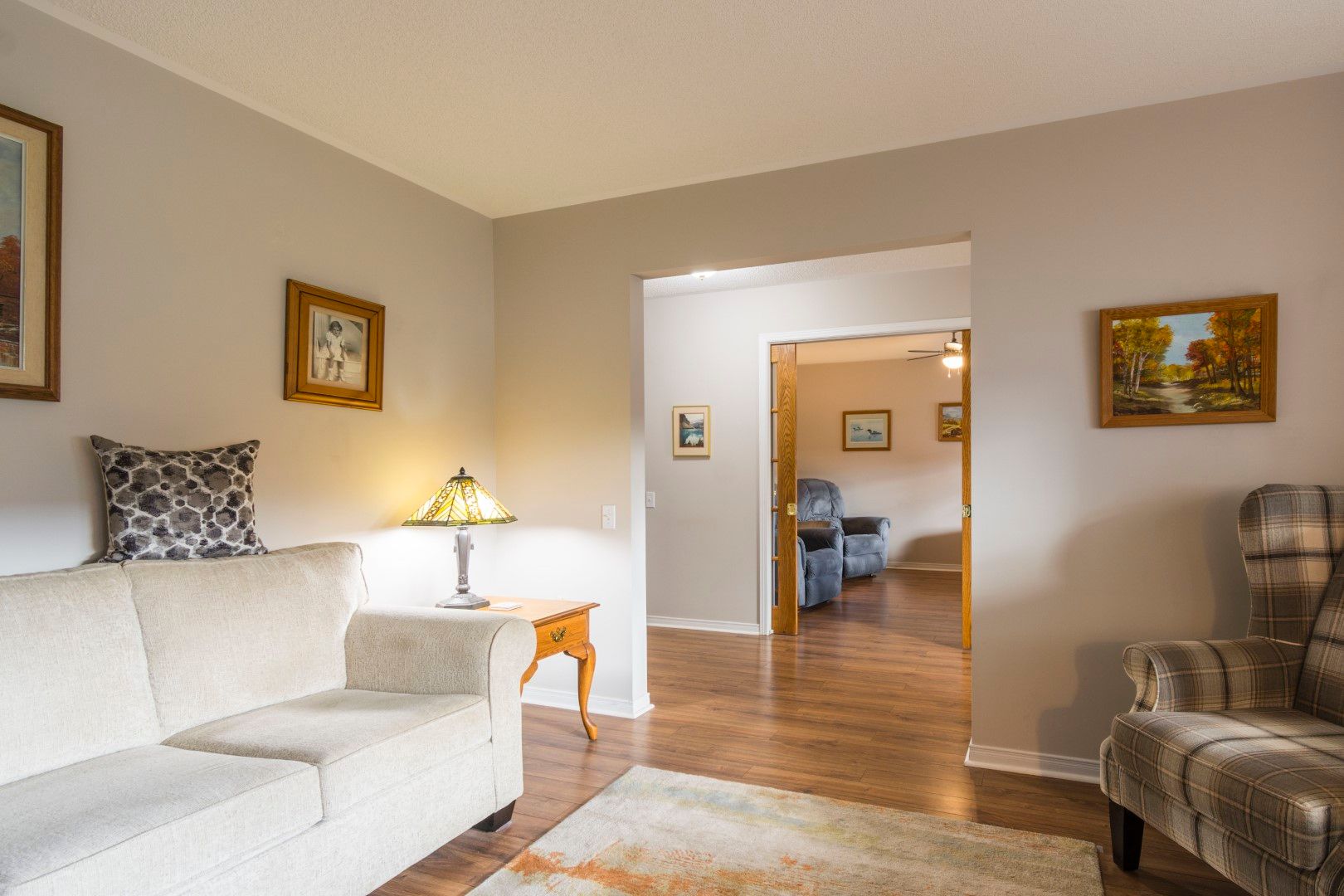 • Cozy living room features a natural gas fireplace for warmth and comfort.