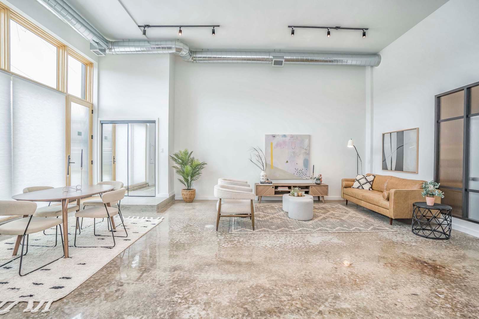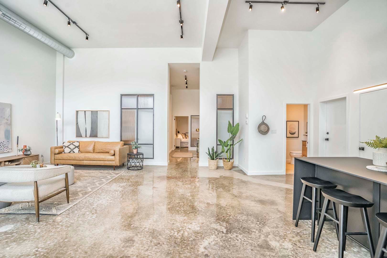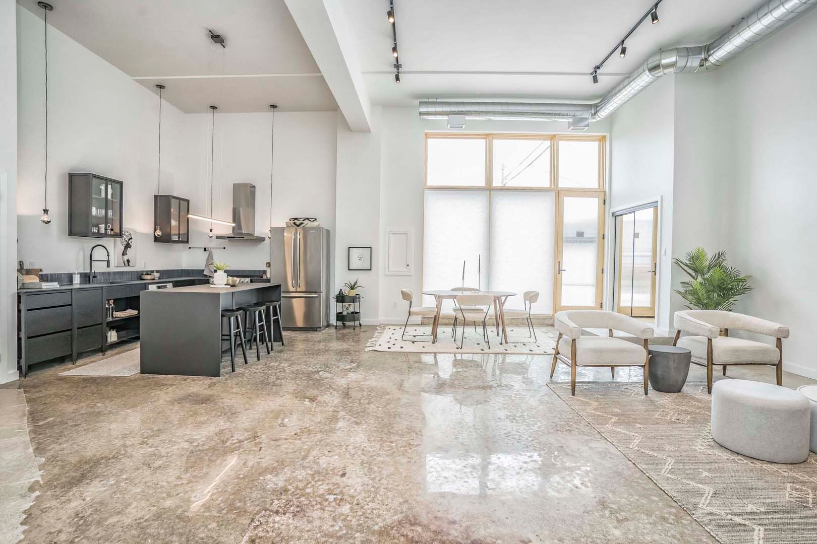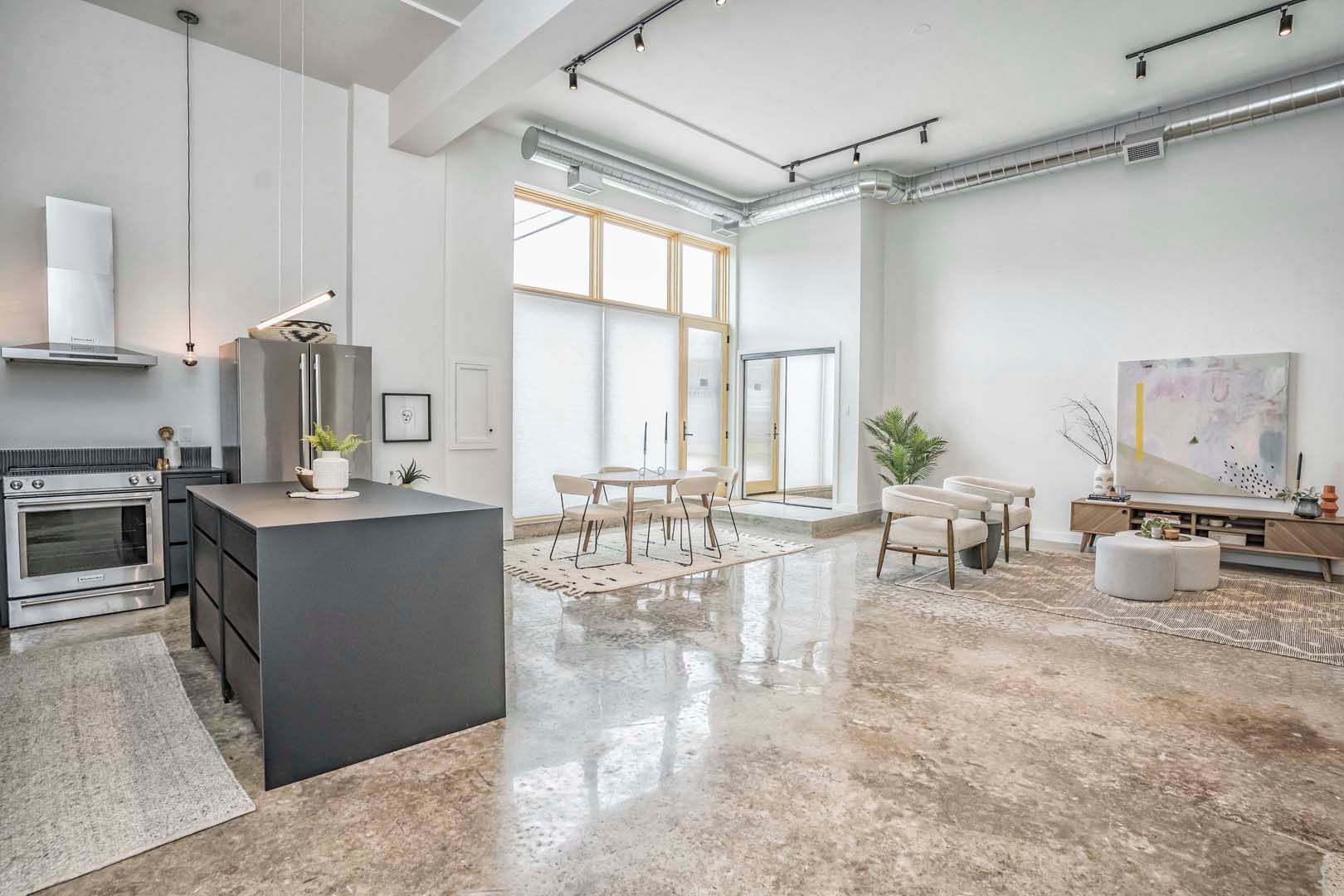 • Spacious 2,000+ sq ft loft with 14-foot ceilings and polished concrete floors.