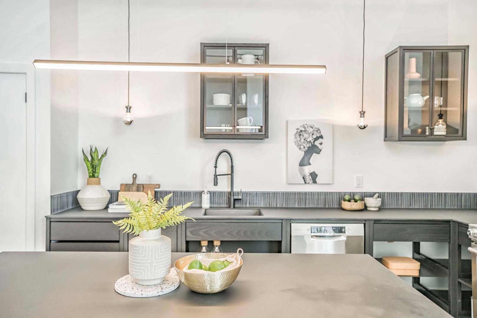 • Modern kitchen with high-end appliances and striking waterfall island.