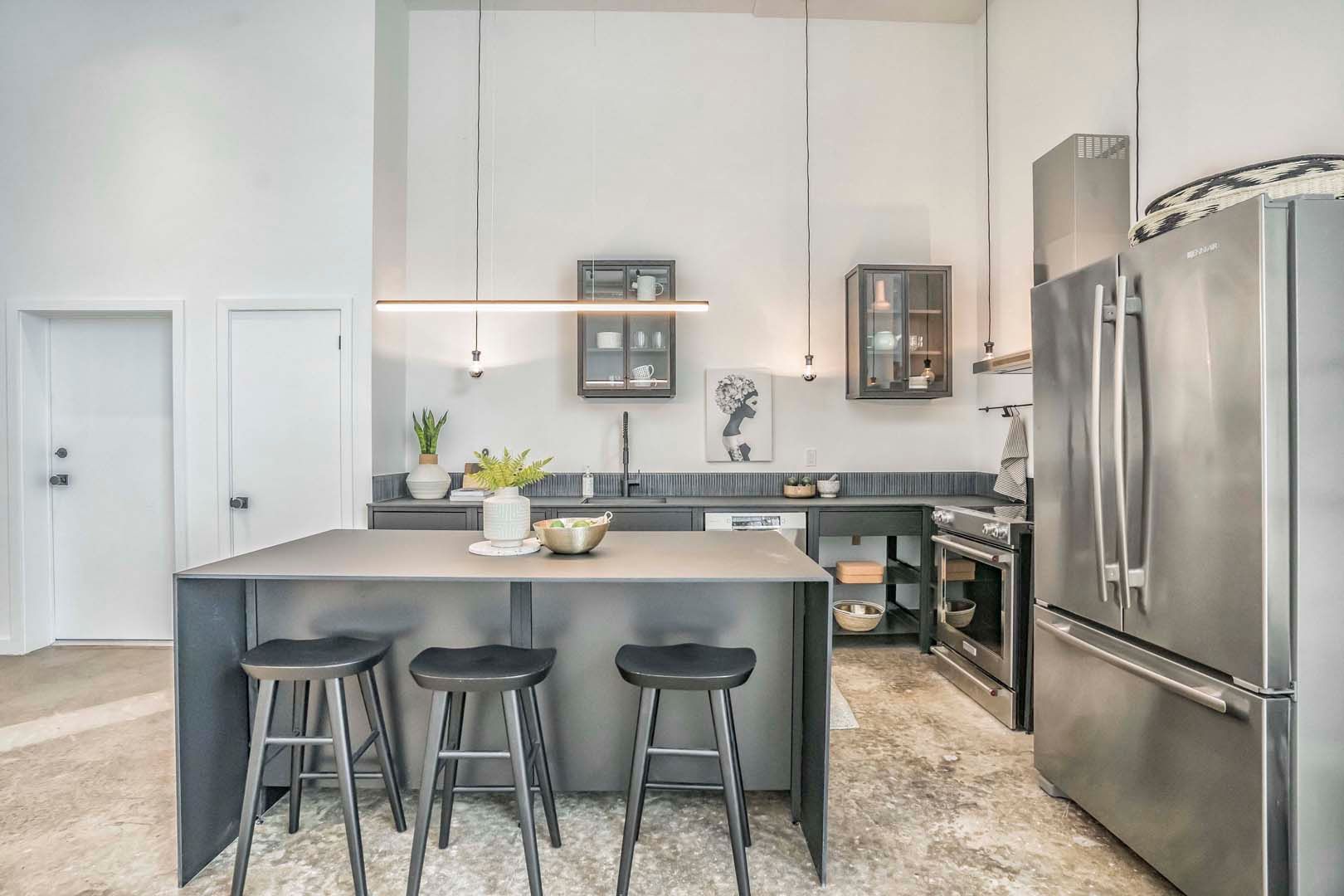 Experience sophisticated loft living on hip geary ave, where contemporary design meets expansive industrial architecture. This remarkable 2,000+ sq ft residence offers 3 bedrooms and 3 bathrooms within a dramatic open-concept layout defined by soaring 14-foot ceilings, polished concrete floors, and exposed ductwork- hallmarks of true urban loft design. Floor-to-ceiling windows flood the interior with natural light, enhancing the scale and airiness of the space while creating a seamless connection between living, dining, and kitchen areas. The sleek, modern kitchen is thoughtfully designed with high-end stainless steel appliances, fenix countertops, and a striking waterfall island, providing both visual impact and functional workspace ideal for everyday living and entertaining. The primary suite offers a spacious retreat featuring a walk-in closet and a spa-inspired 4-piece ensuite, complete with a deep soaking tub and separate glass-enclosed shower. Two additional bedrooms provide flexibility for guests, home offices, or creative spaces, each supported by well-appointed bathrooms with contemporary finishes. Additional conveniences include a 30 sq ft storage locker and first-come-first-serve bicycle racks, adding practical functionality to this exceptional property. Situated in one of the city's most dynamic and creative neighbourhoods, this residence combines industrial character, modern finishes, and generous proportions to deliver a truly distinctive urban space.