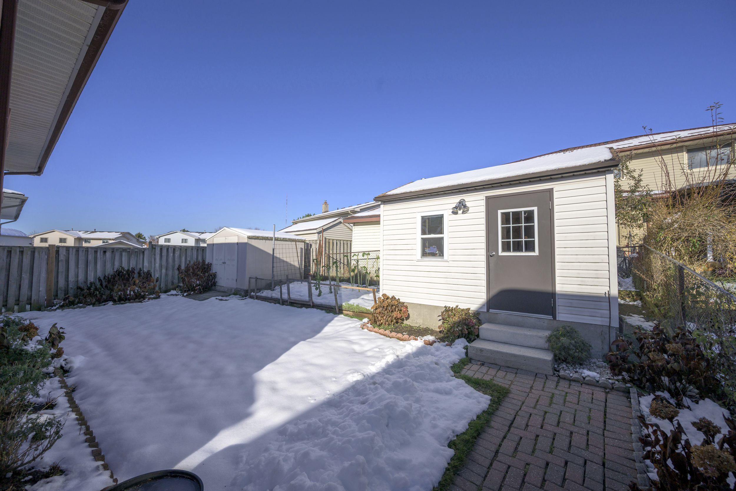 • Fully fenced yard features patio area and two sheds for extra storage.