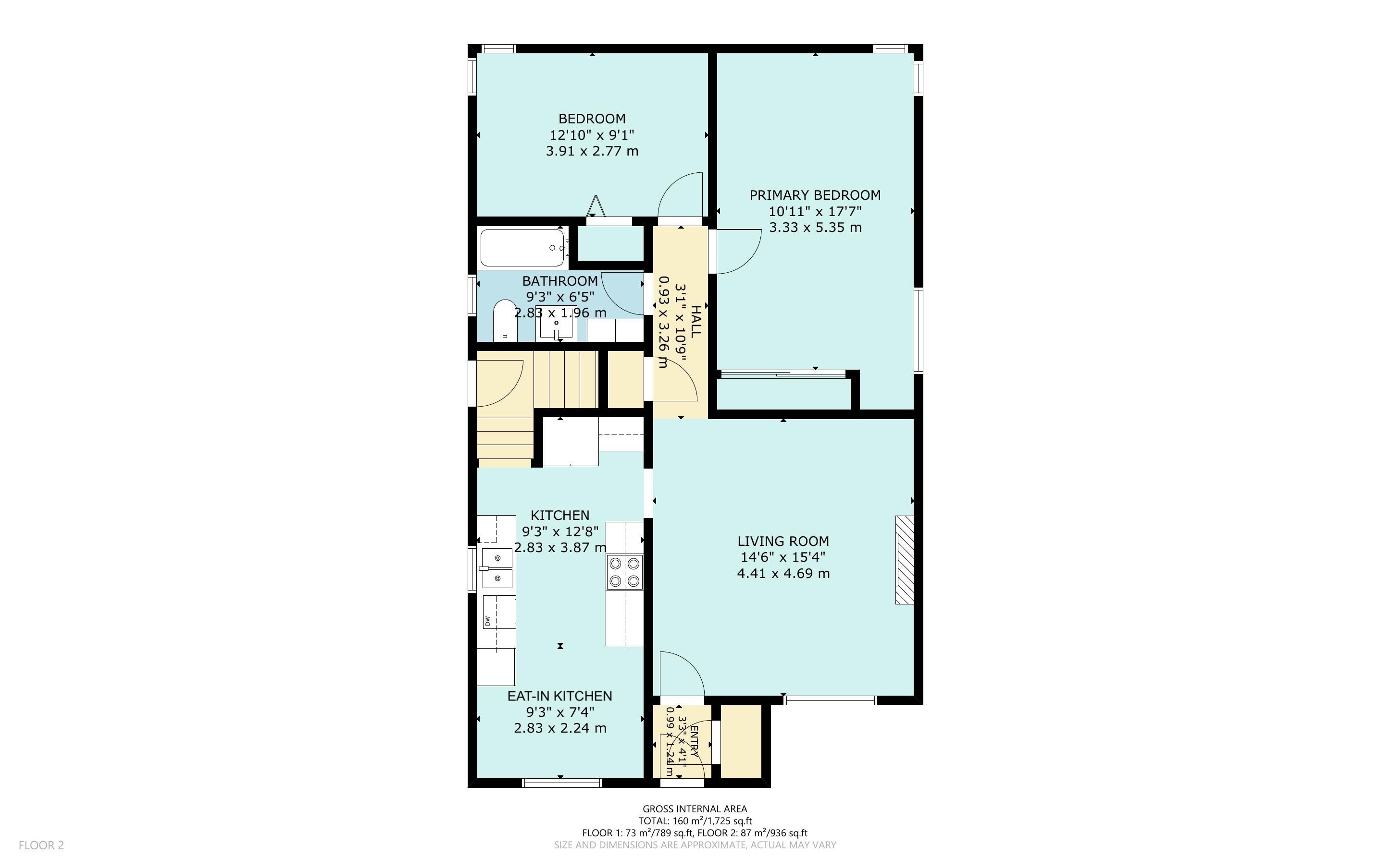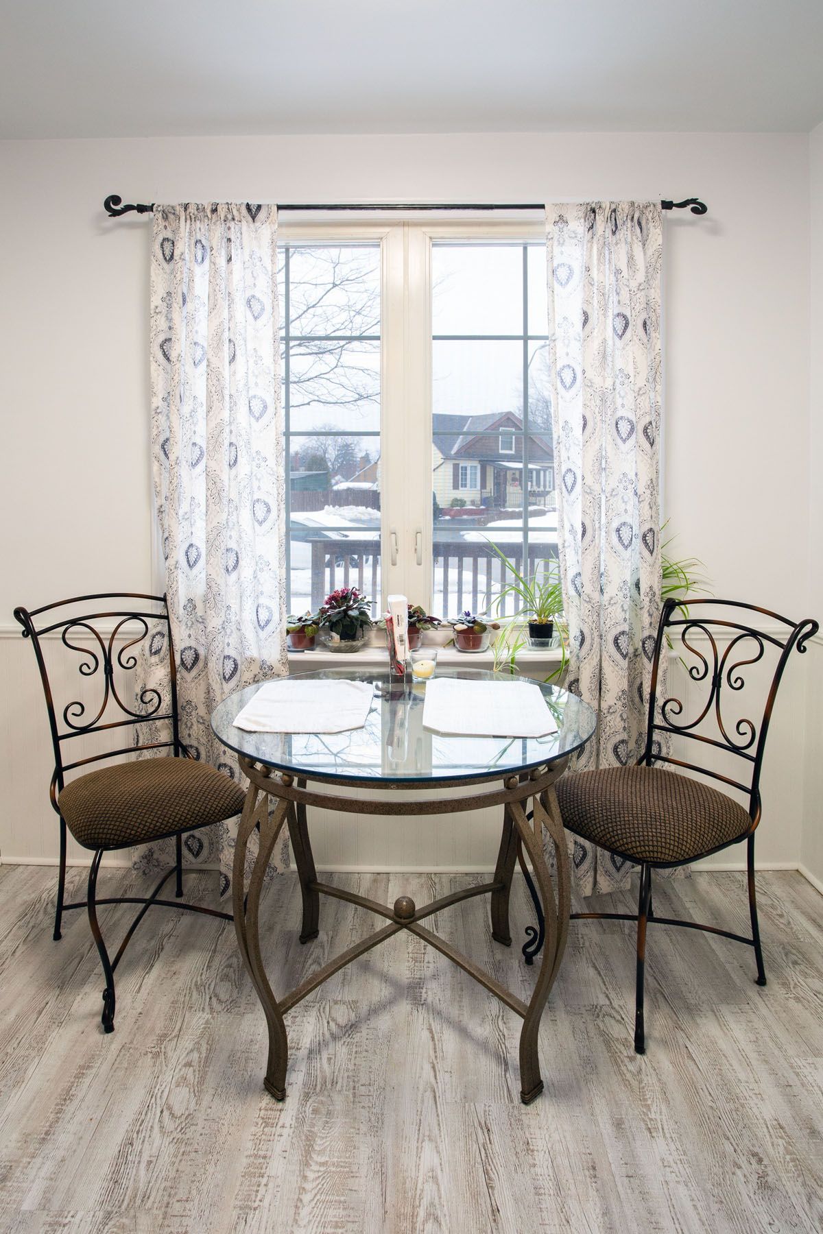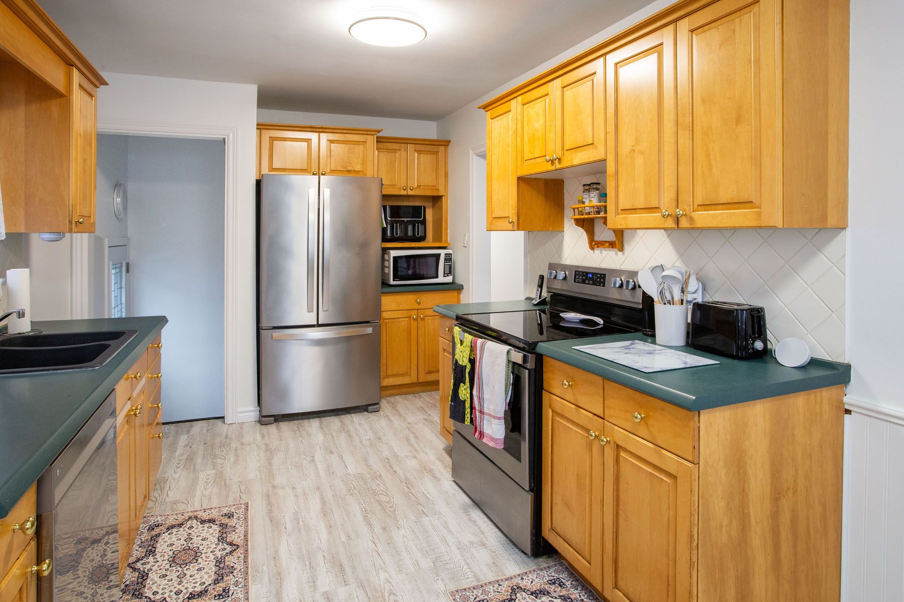 • Bright eat-in kitchen with ample counter and cupboard space.