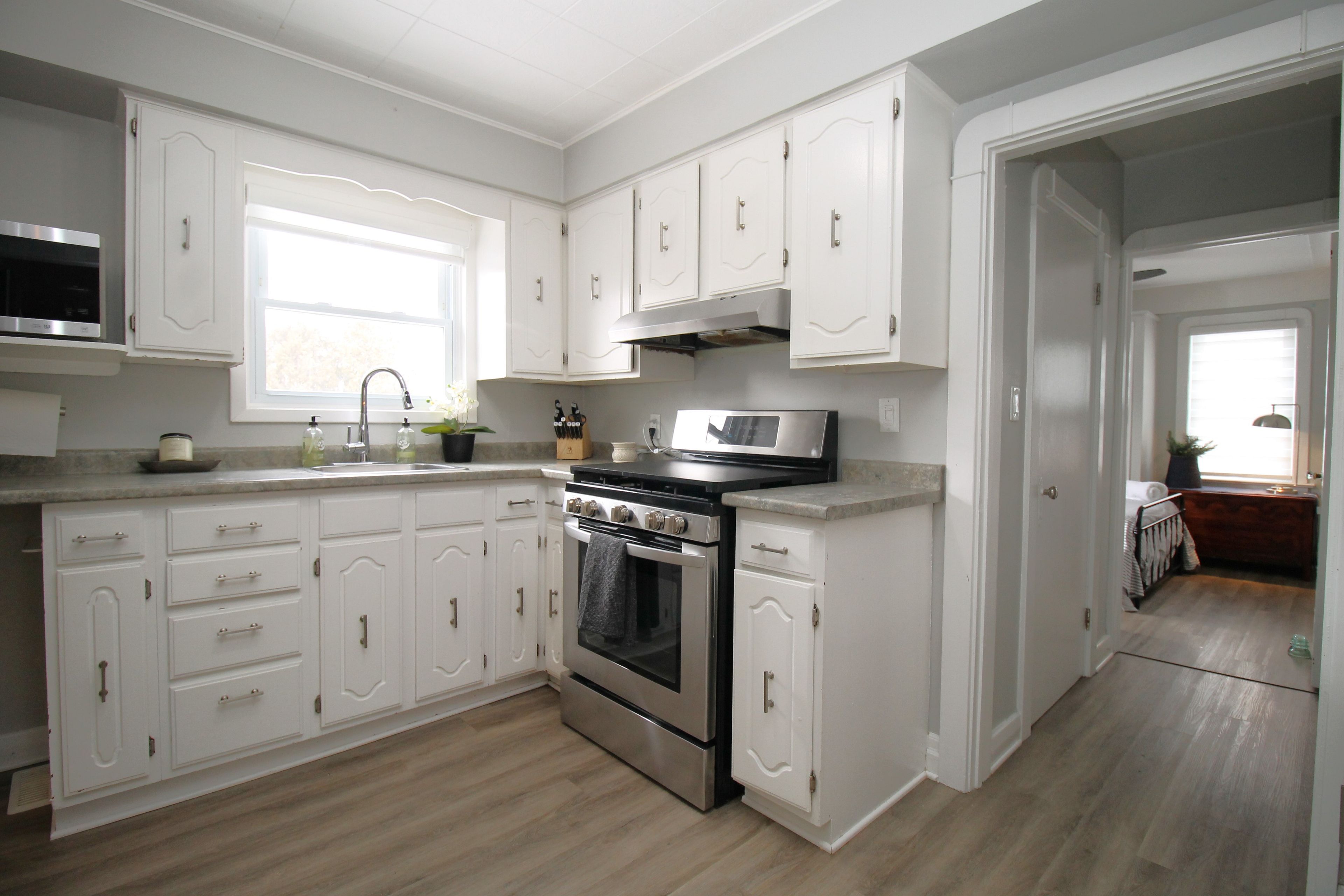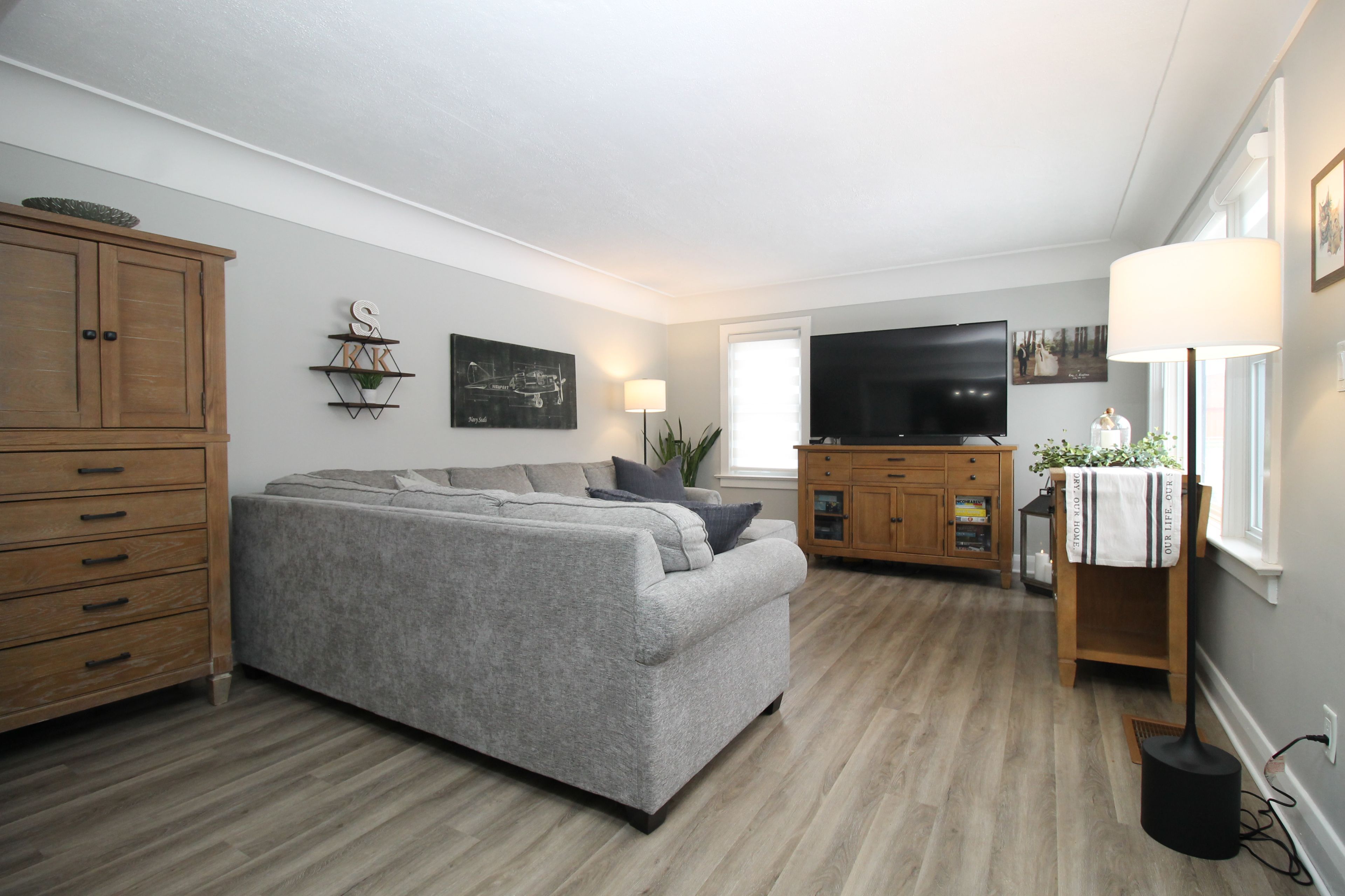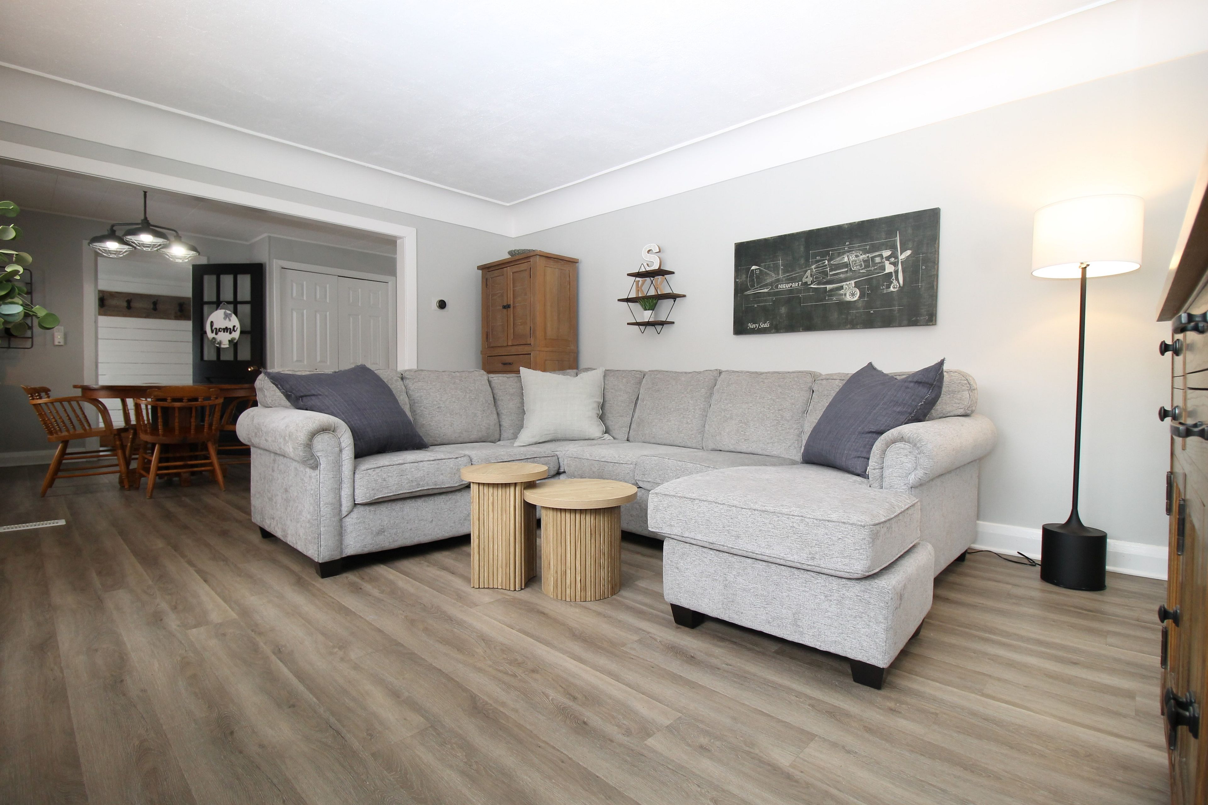 • L-shaped open concept kitchen, dining, and living space for comfortable living.