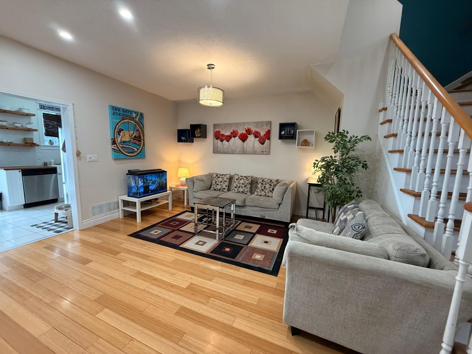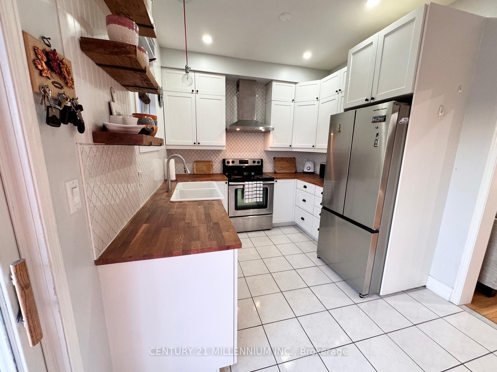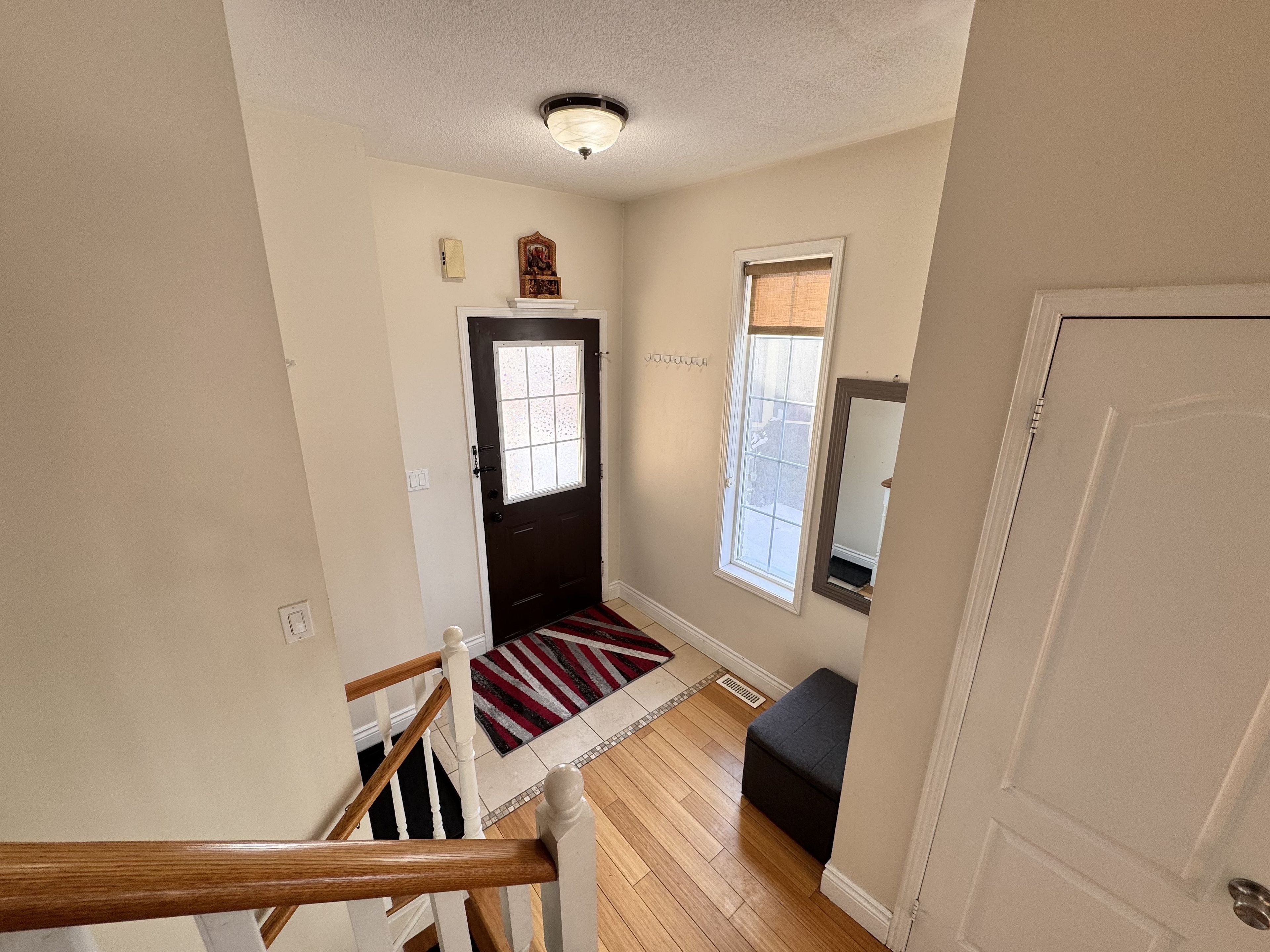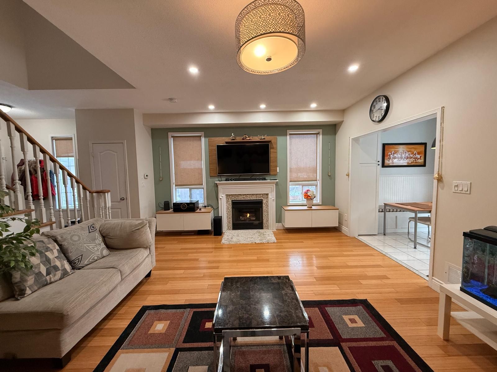 Welcome to semi-detached home, with rental potential, fully finished walk-out basement, separate entrance, with murphy bed, media wall unit, separate kitchen and 3 piece bath. This home features, spacious 9-foot sun filled living/dining room with pot lights & gas fireplace adds warmth to the living space. Wooden flooring, "no carpets throughout the house". Huge backyard, backing on to ravine, walkout from main level to a large 10' x 10' deck, concrete pad from front to rear of backyard and garden shed on concrete pad. 2021 built driveway provides 2 car parking plus full 1 car attached garage. 2023 owned hot water tank, 2024 stainless steel dishwasher and brand new s/s refrigerator (2025). Painted garage floor & fence, landscaped front-yard & tinted windows in main & 2nd level. Walking distance to library and park. This home is move-in-ready with lots of inclusion listed in the 'features sheet'. Inclusions: all appliances incl., s/s fridge, s/s stove, s/s dishwasher, washer & dryer, window coverings & elfs, pergola on deck; hwt- owned. Main level: 2 window cabinets, tv wall unit; 4 wall cubes; kitchen: pantry cupboard with bench; master-bed: tv wall unit; basement: b/i murphy bed unit, tv wall unit, 1 mini fridge, electric cooktop, microwave in bsmt; 4 door display unit in garage.