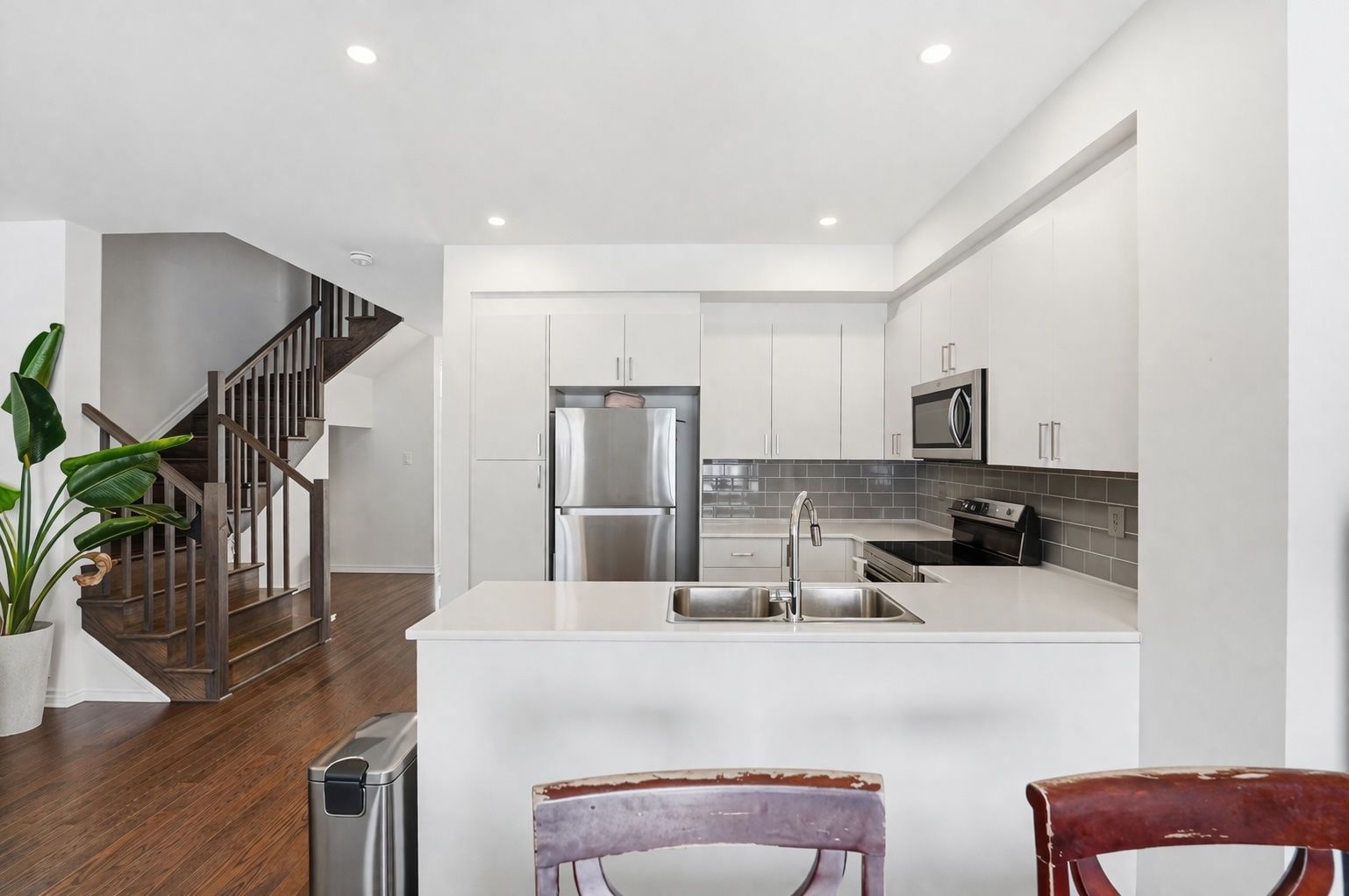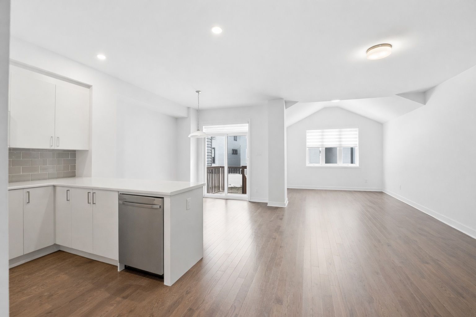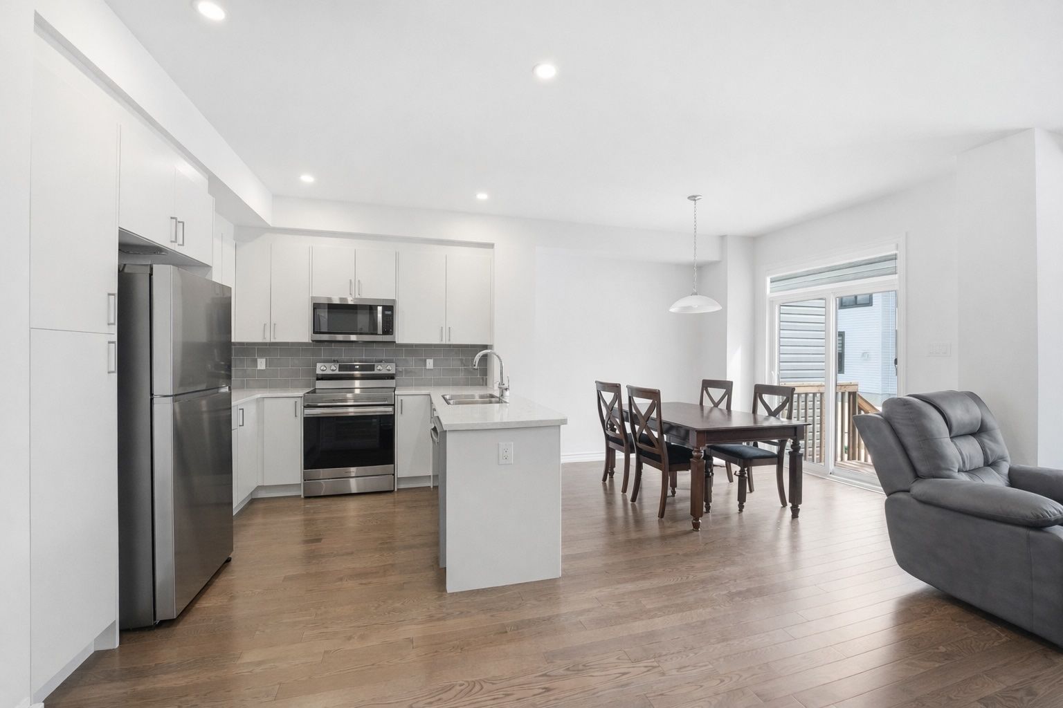 Welcome to this almost-new townhome in the highly desirable orleans village, offering over 2,000 sq. Ft. Of beautifully designed living space. This south-facing home is filled with natural light and features impressive arched, high ceilings that create an open and airy feel throughout. The main level boasts oak flooring complemented by 9-foot ceilings. The spacious kitchen features sleek finishes with ss appliances and breakfast nook. Upstairs, you'll find three generously sized bedrooms, with the primary offering two walk-in closets and a full ensuite. Second-level laundry for added convenience. The layout is both functional and family-friendly, offering comfort and privacy for all. The finished basement provides a versatile recreation room-perfect for a home theatre, gym, or additional living space; ample storage. Conveniently located in ottawa east at the western edge of orléans, offering easy access to shopping, dining, schools, transit, and downtown ottawa. Some photos have been virtually altered.