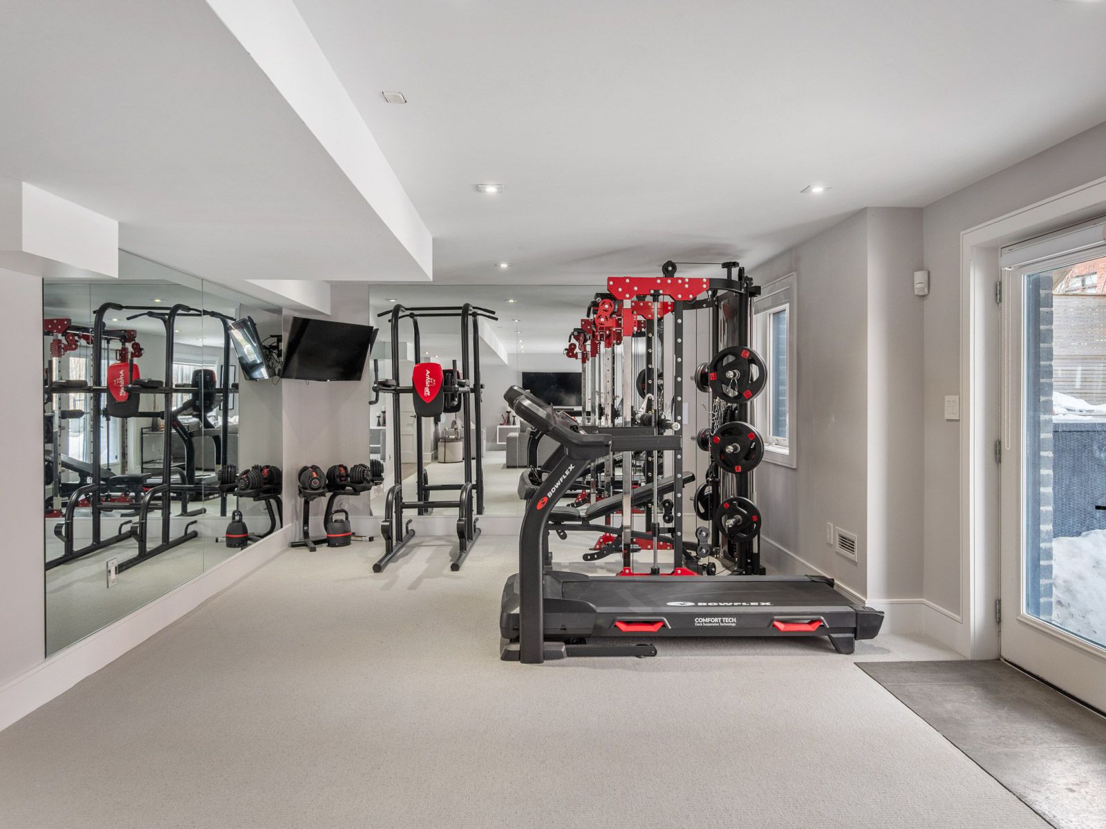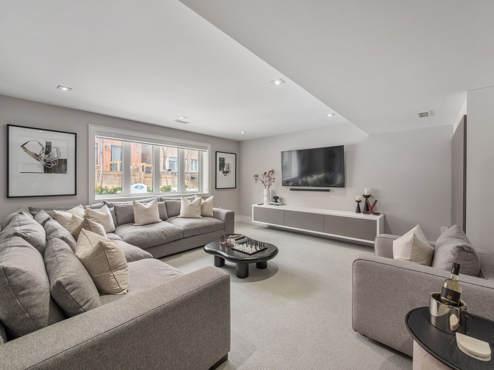 • Finished lower level includes a home theatre, exercise room, and nanny suite.