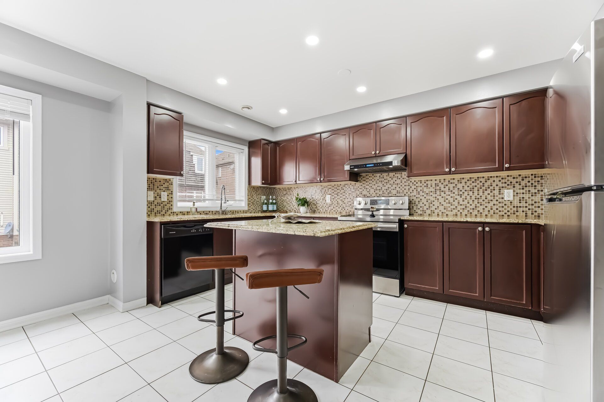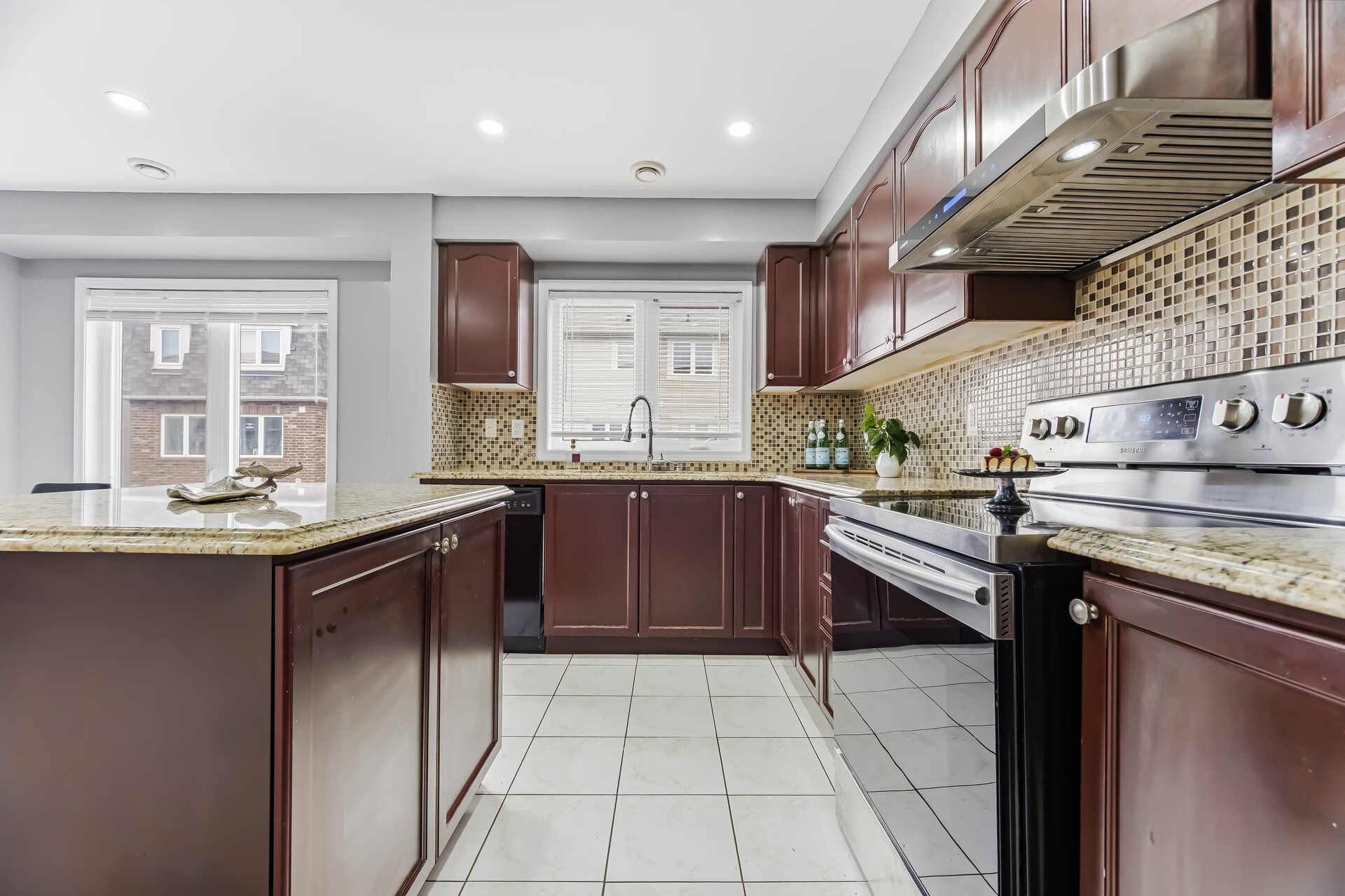 • Chef's kitchen features granite countertops, center island, and ample cabinetry.