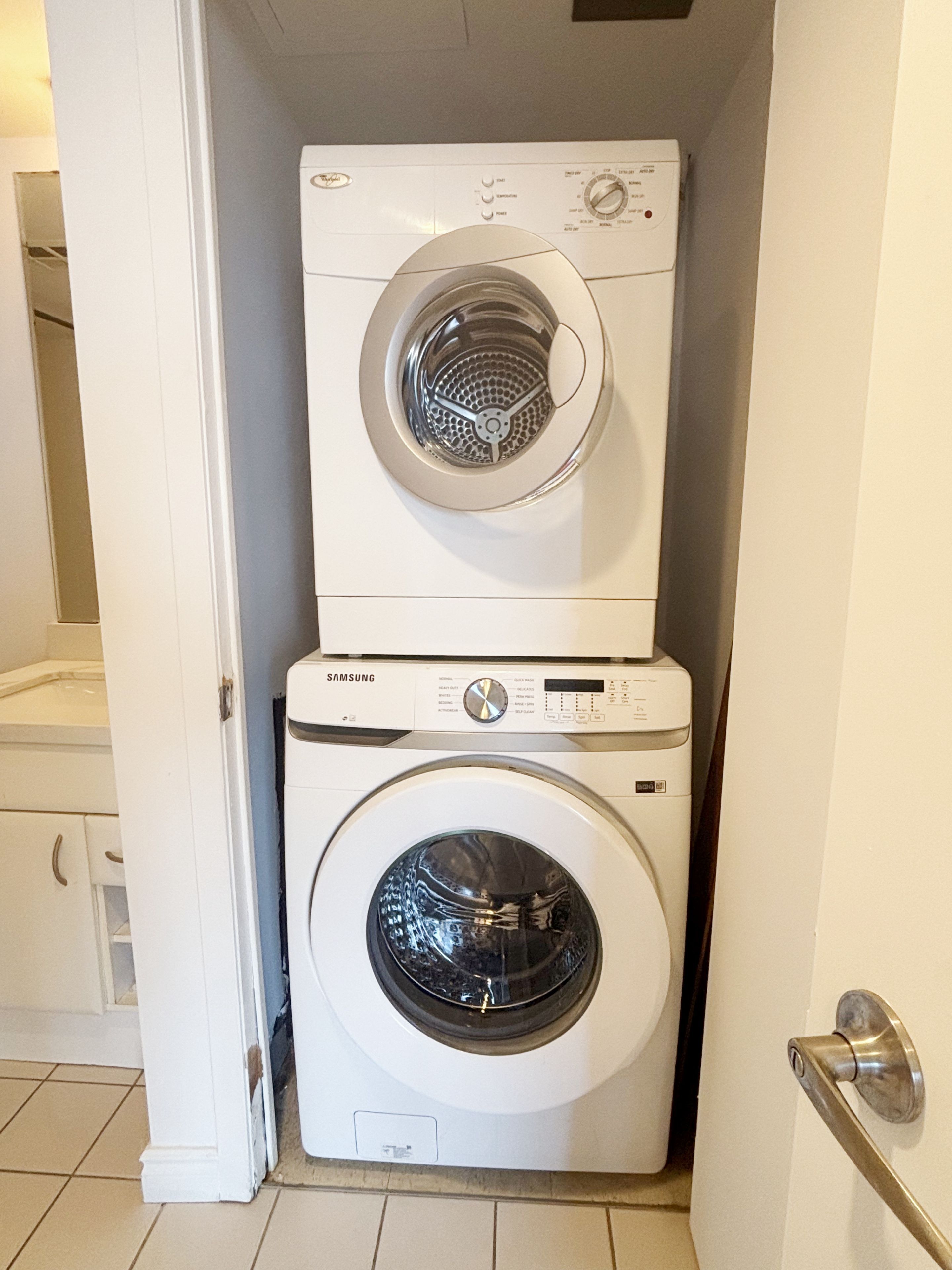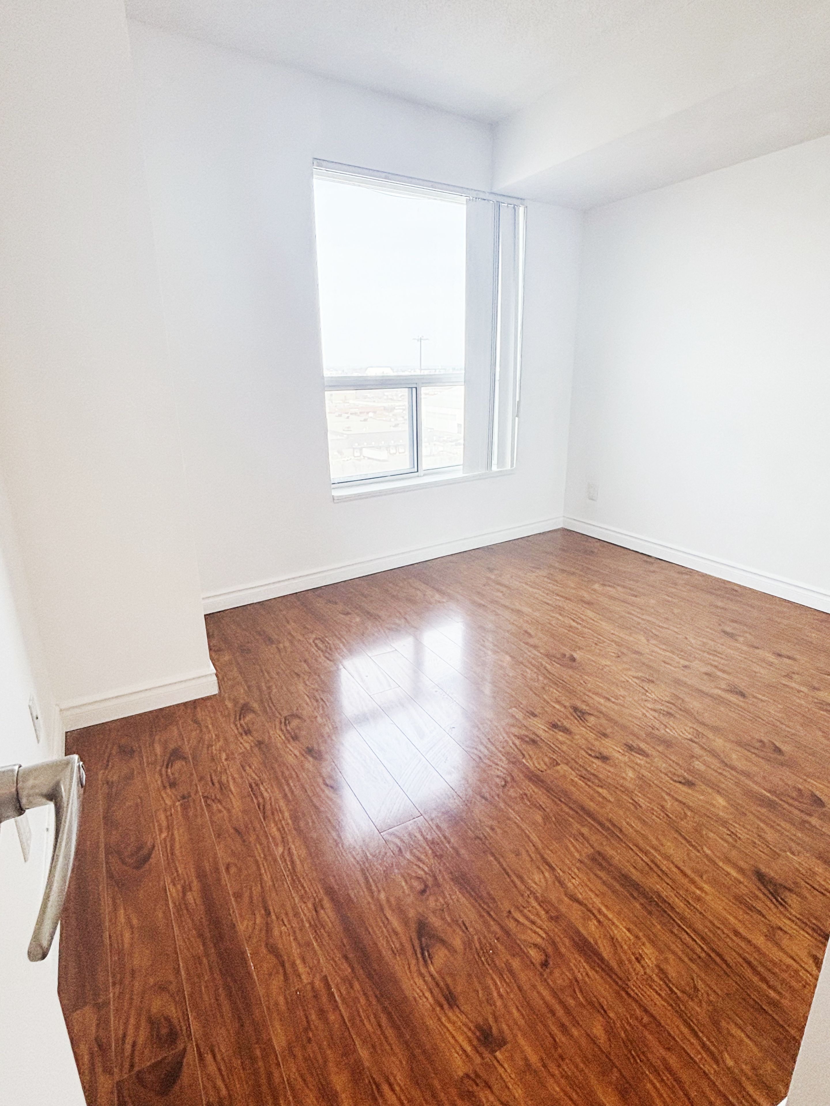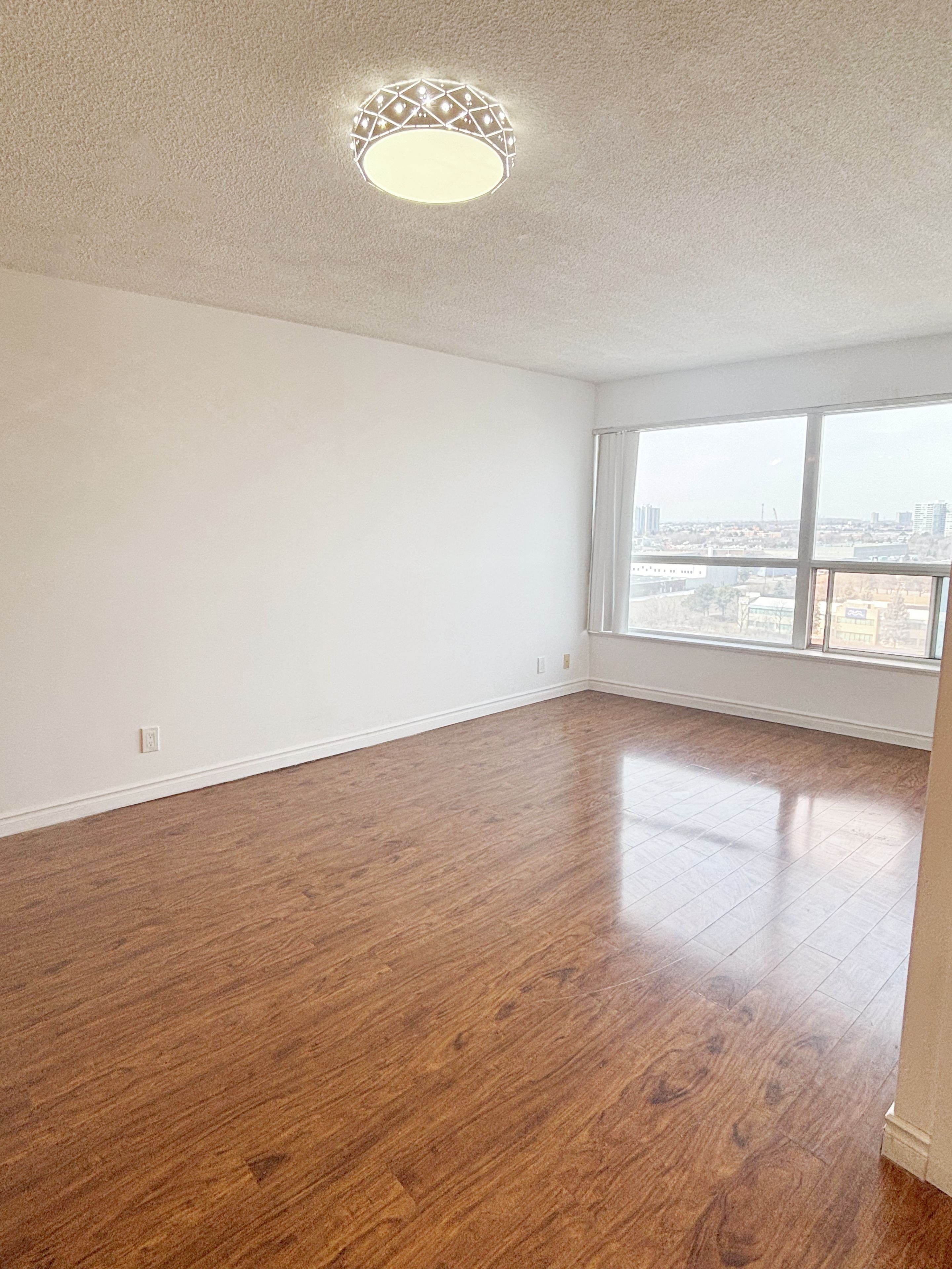 Step into this bright and modern condo featuring an open-concept living and dining area with a huge window that showcases beautiful, unobstructed city views. The kitchen is designed for functionality, offering a convenient breakfast bar and an open layout that overlooks the living space. The den with french doors can serve as a second bedroom or a private home office. This unit includes owned parking and access to world-class amenities such as an indoor pool, sauna, billiards room, exercise room, meeting room, and 24 hour concierge/security. Enjoy easy access to major highways, the subway, and a free shuttle to nearby shopping centers.