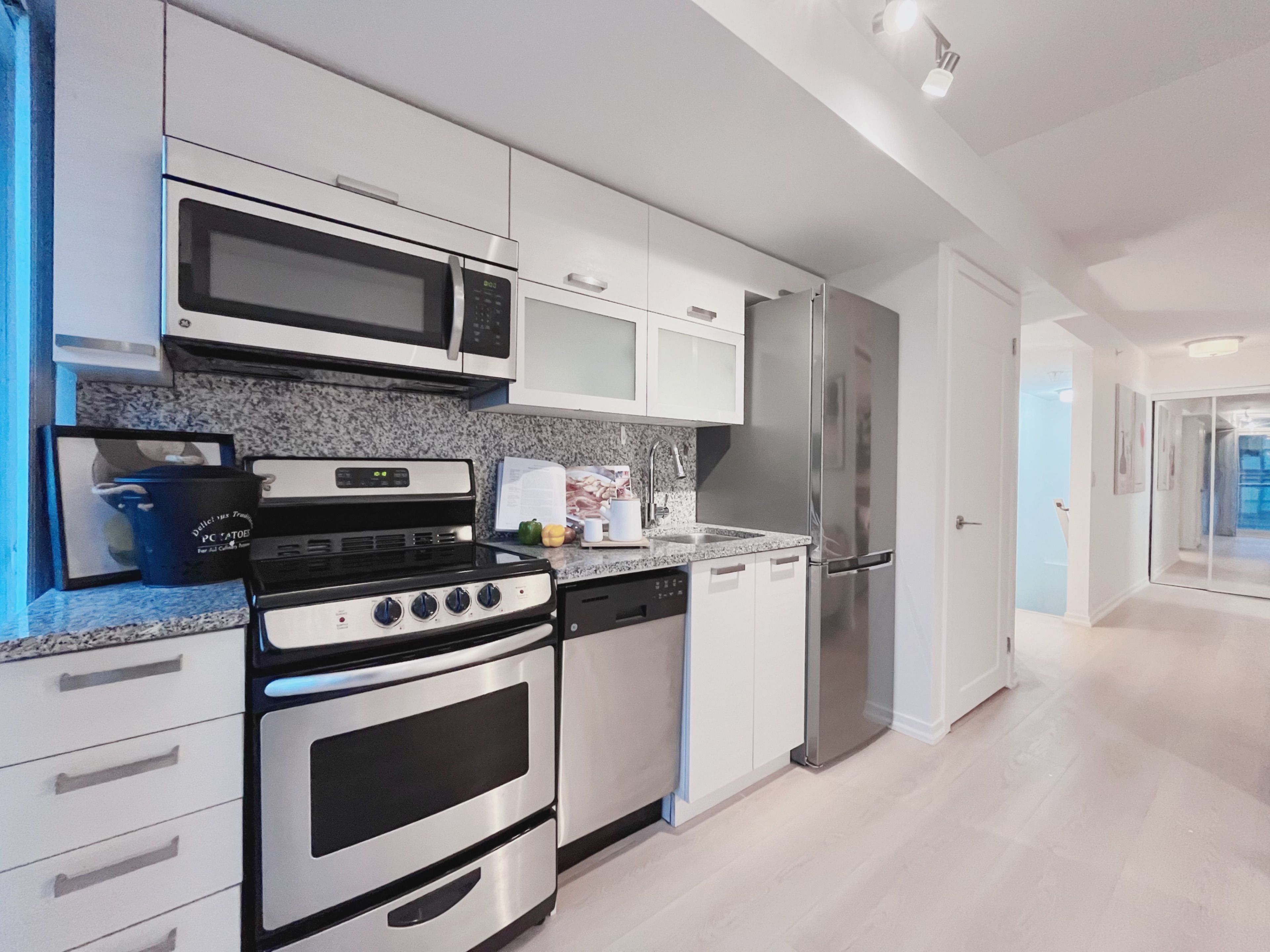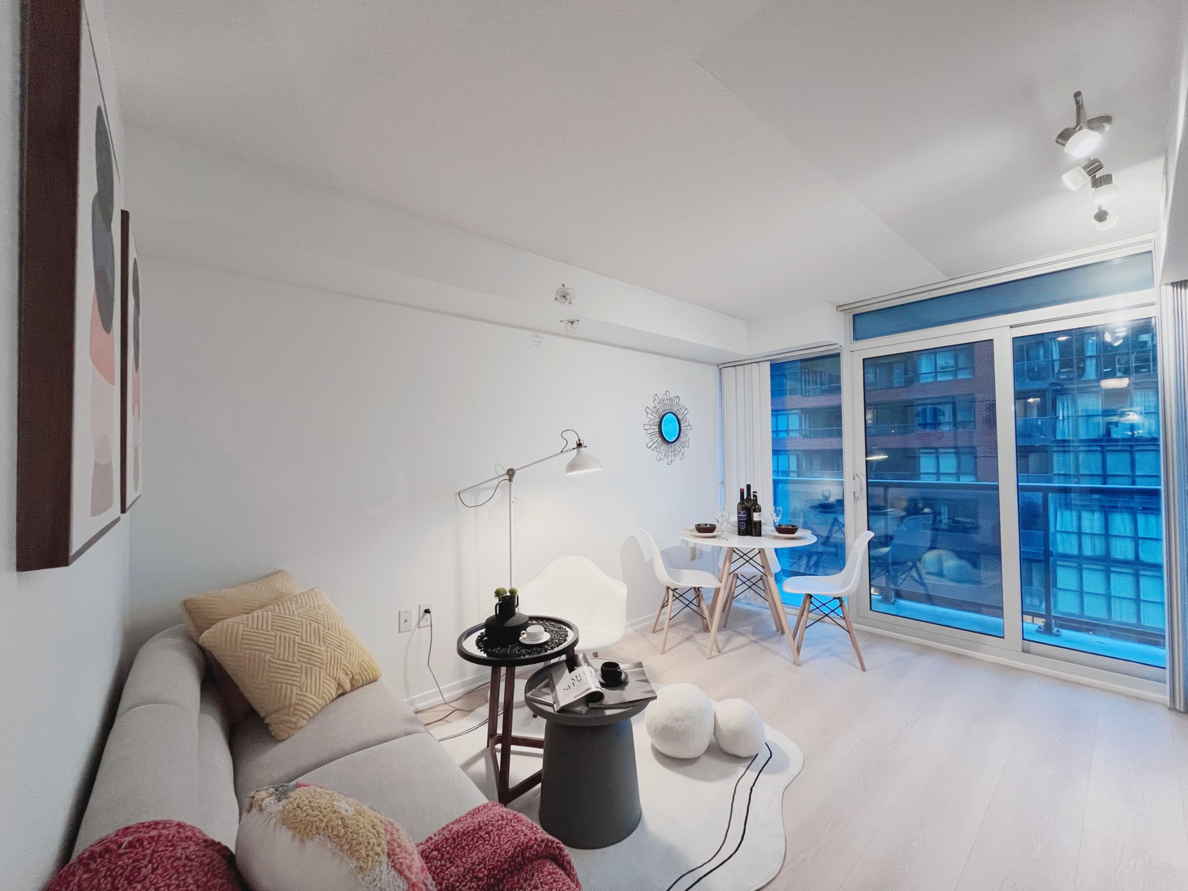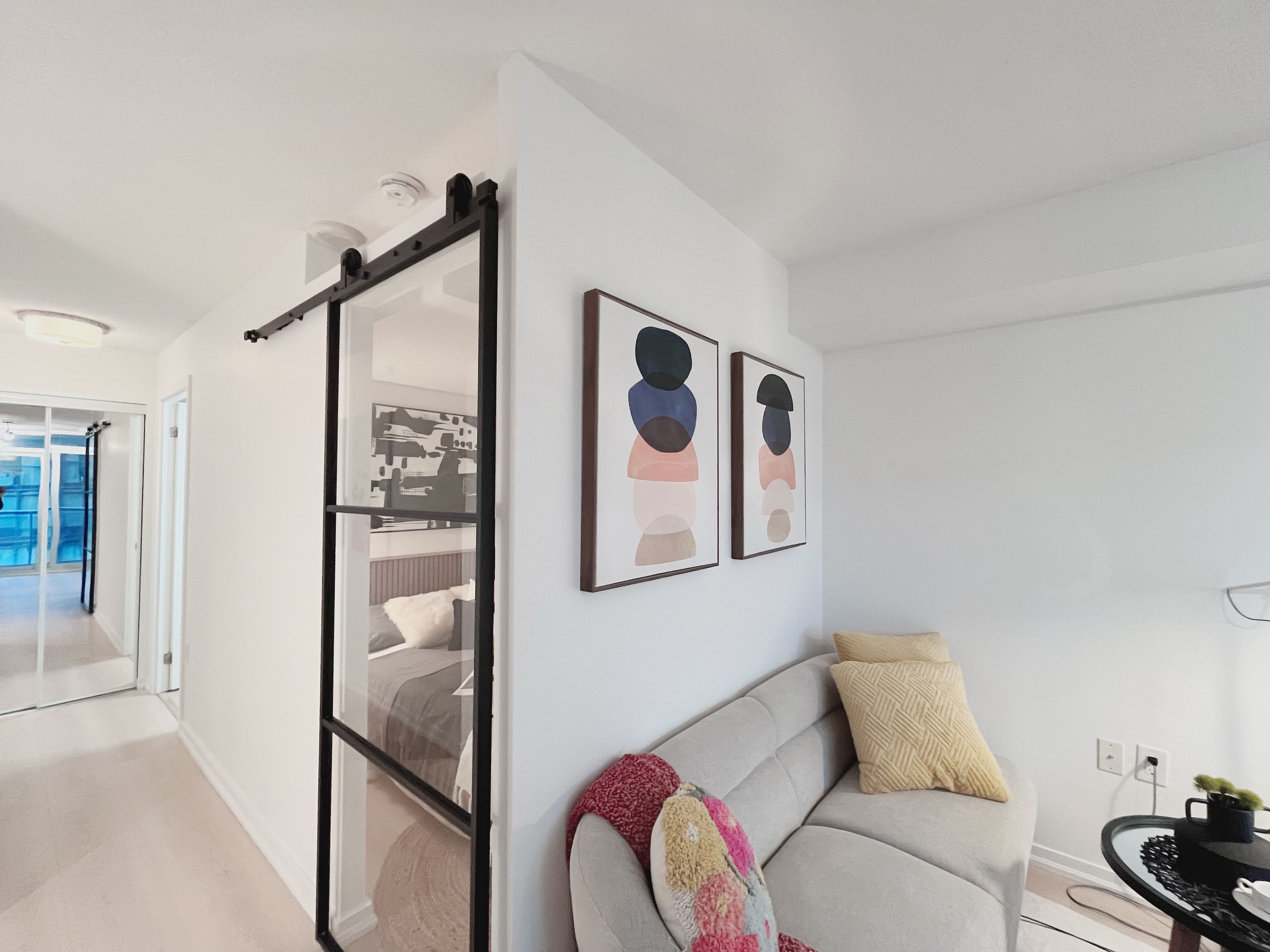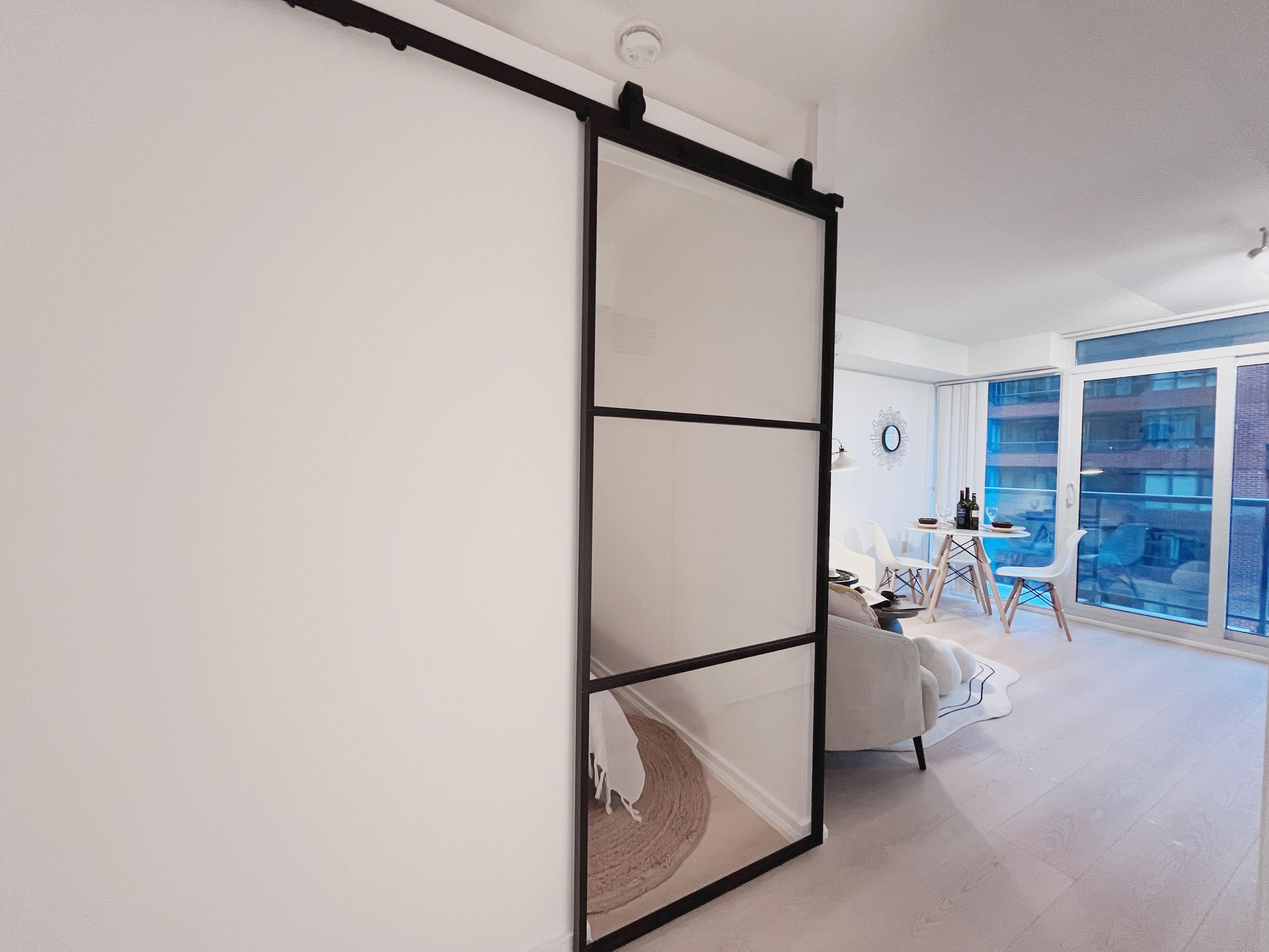 Prepare to be impressed by this meticulously upgraded two-storey studio that redefines urban living. From the moment you enter the elegant foyer, you ascend to a bright and spacious open-concept upper level that feels more like a luxury loft than a standard condo. The standout feature? A brilliant, custom-built private bedroom separated by a stylish glass barn door, offering the true separation and privacy of a one-bedroom layout-a rare and valuable find in a studio. This unit has undergone a comprehensive, no-expense-spared renovation, showcasing premium upgrades at every turn. The list includes brand-new modern luxury vinyl flooring, a fresh and neutral paint palette, new designer light fixtures, and new stainless steel fridge. The sleek kitchen features granite countertops and is perfectly positioned within the open living area, which opens directly onto your spacious private balcony. Here, you can enjoy your morning coffee with breathtaking, unobstructed views of the cn tower. The building offers full 24-hour concierge service for your security and convenience. Nestled on a quiet, in the heart of the fashion district, this home provides a peaceful retreat while being moments from an array of trendy cafes, gourmet restaurants, boutique shops, parks, and major transit options, placing the very best of the city at your doorstep. This is not just a listing; it's an experience. The unique two-storey layout, the custom bedroom addition, and the high-end finishes must be seen in person to be fully appreciated. This move-in ready home is a true model of modern urban design and won't last long.