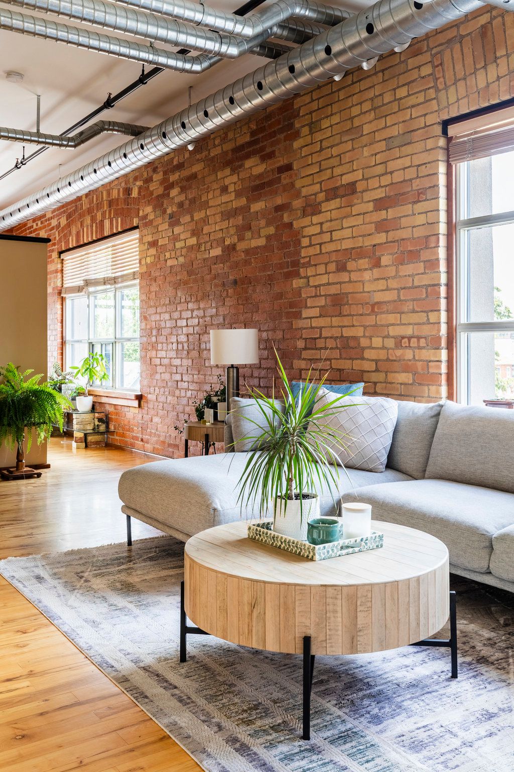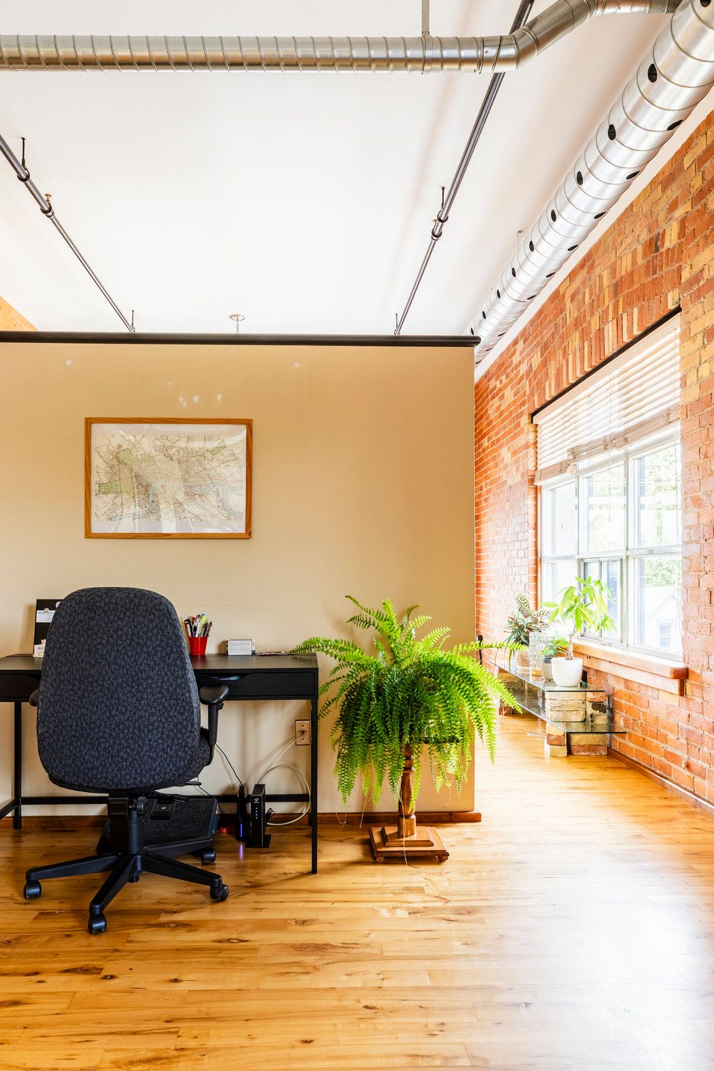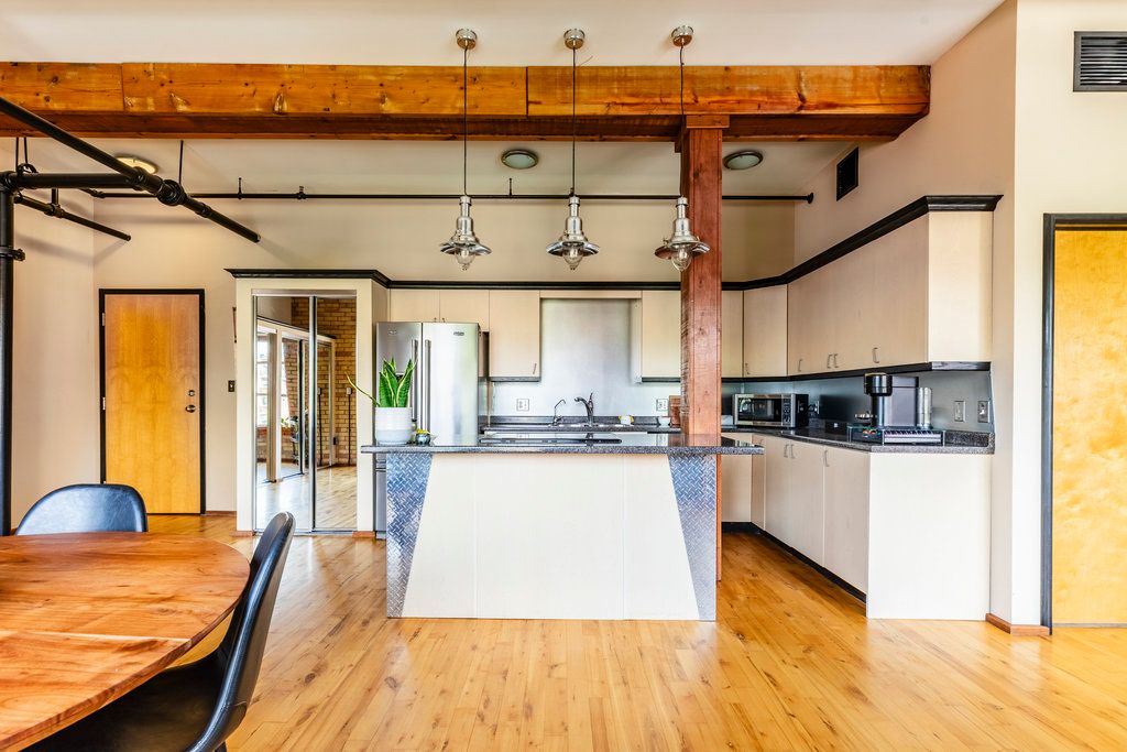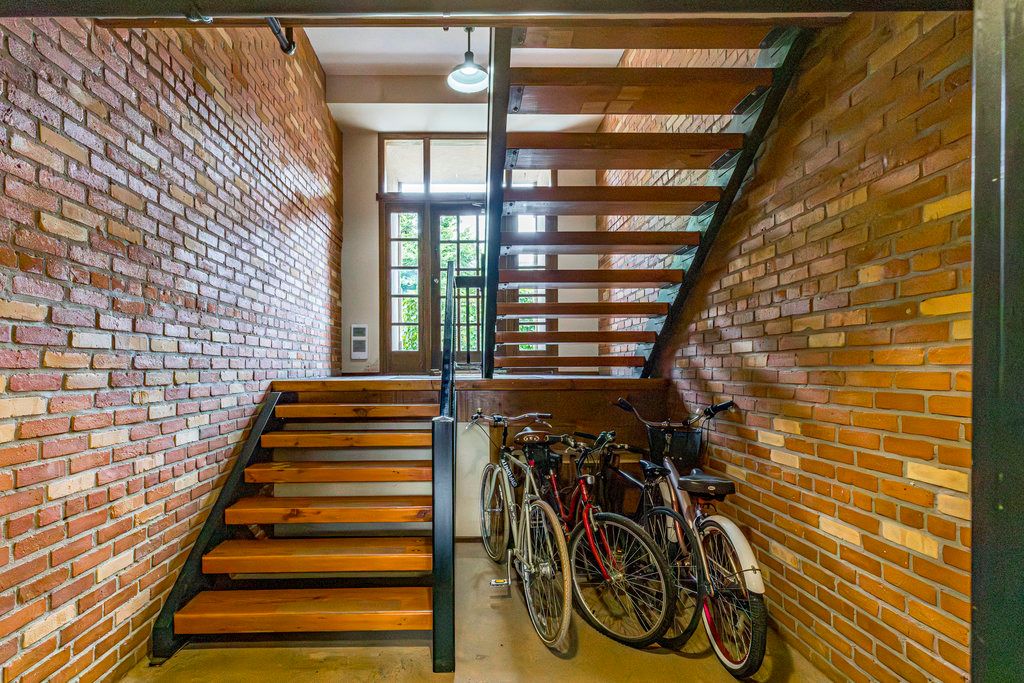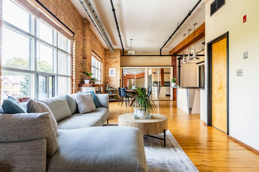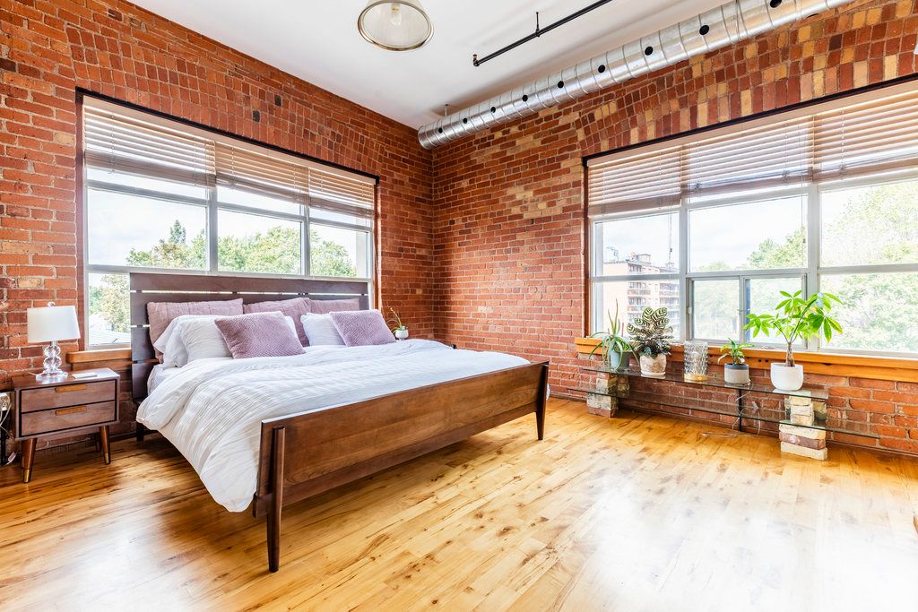 • Heritage loft featuring original brick walls and oversized windows for natural light.