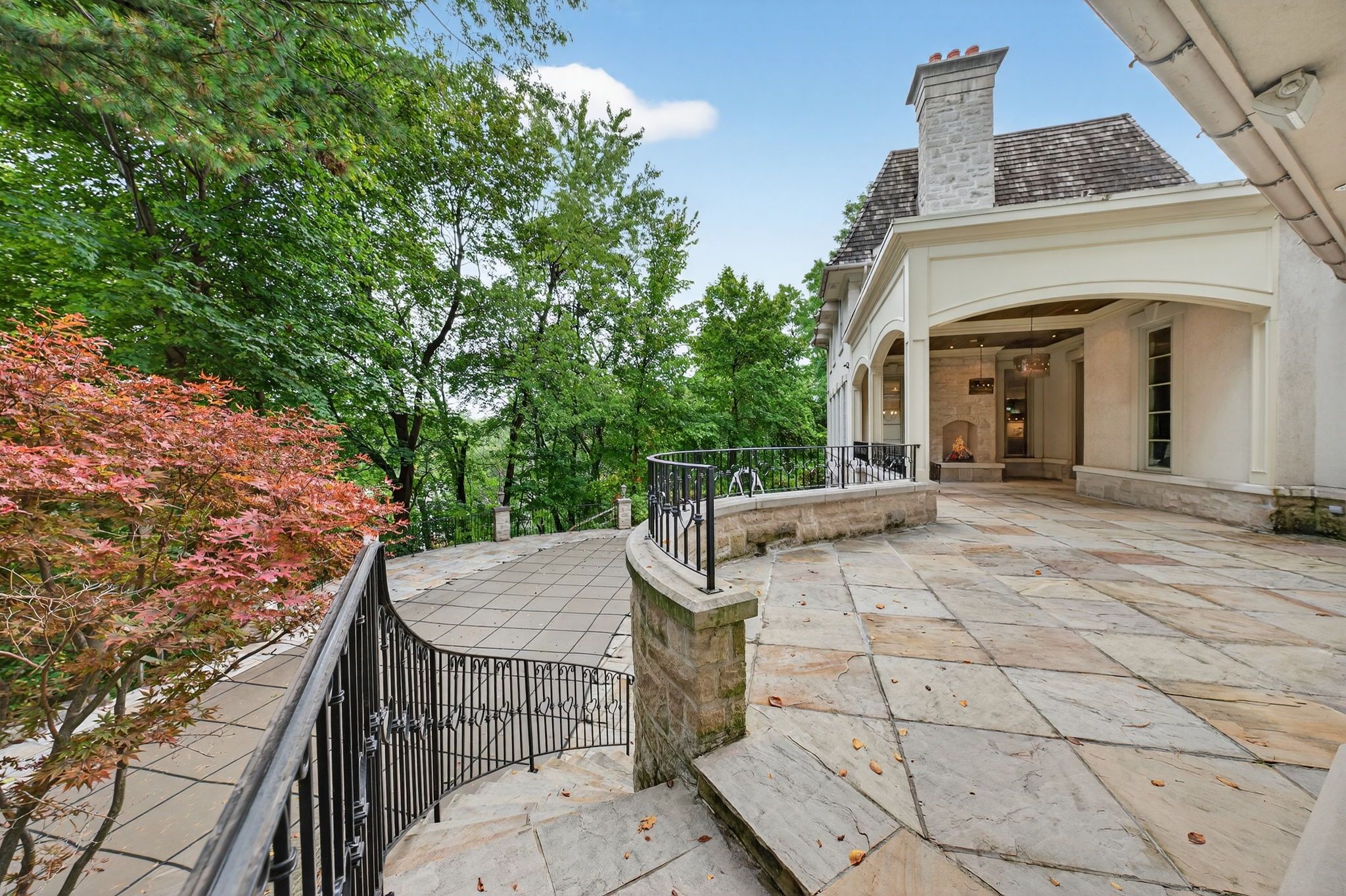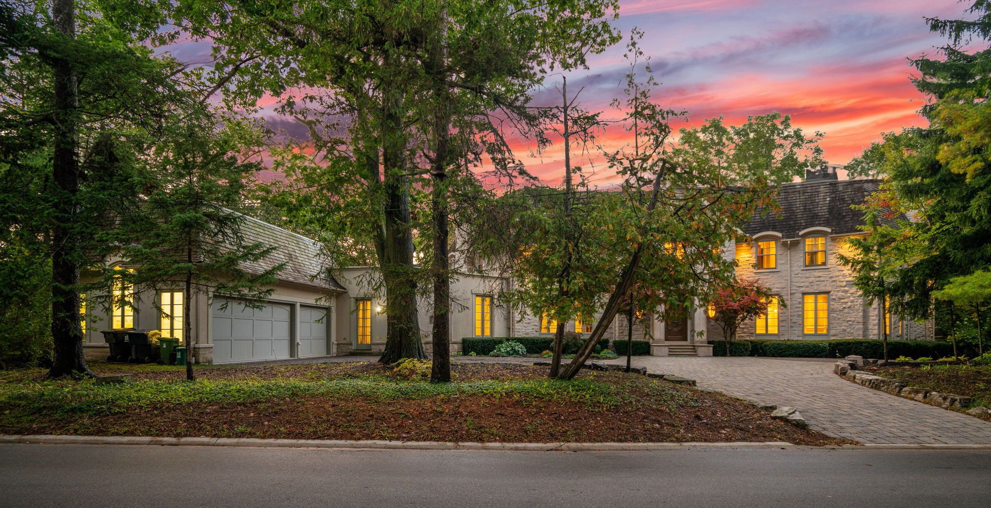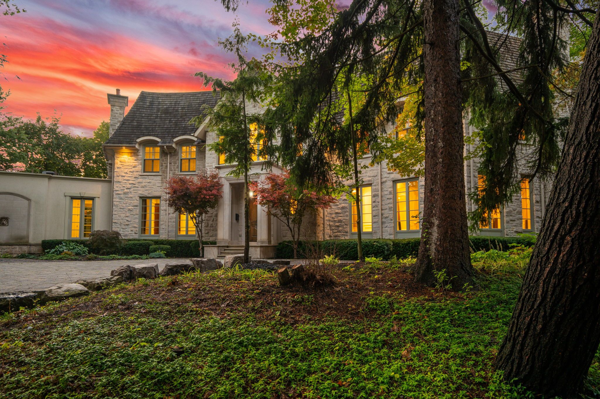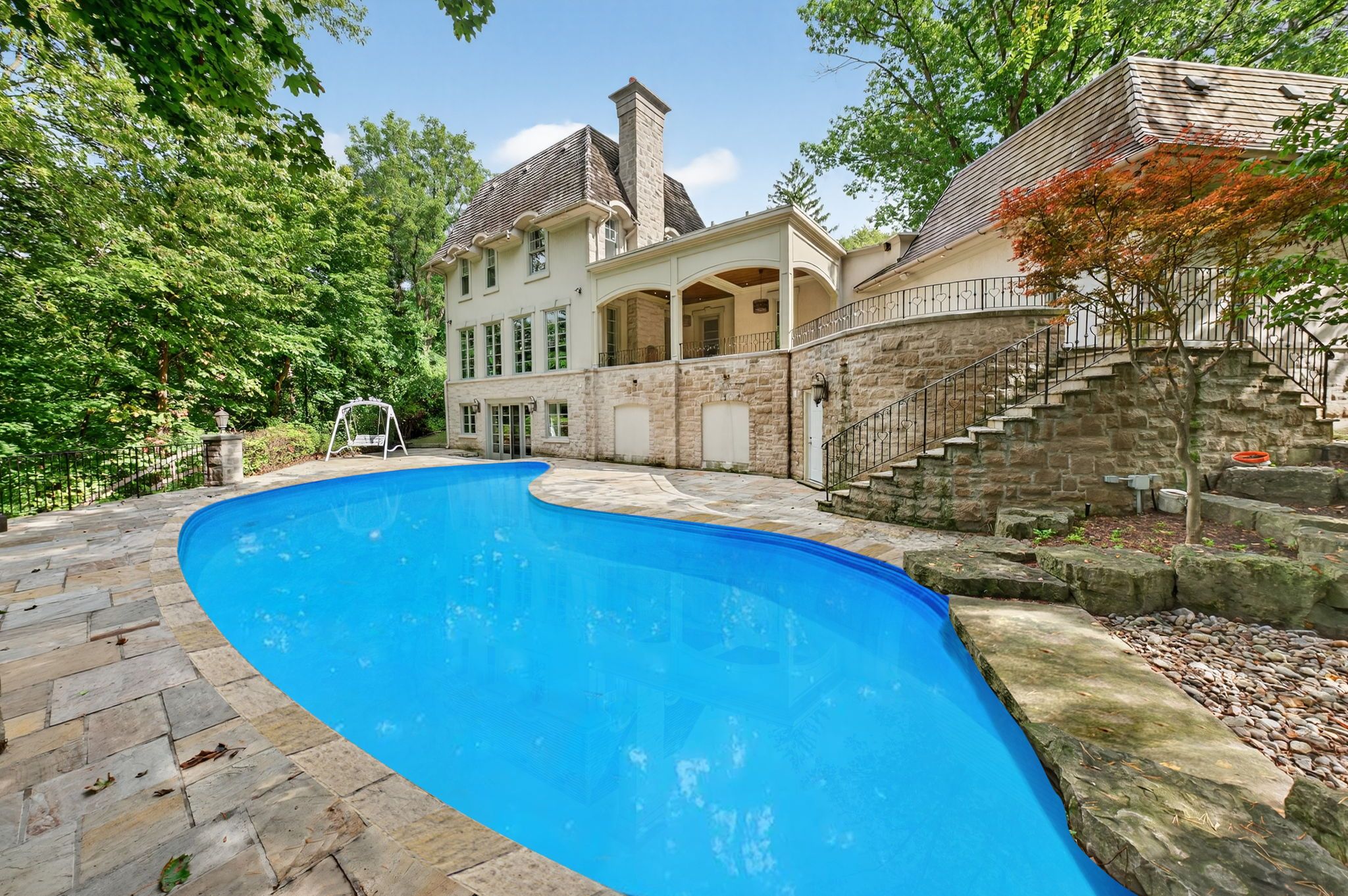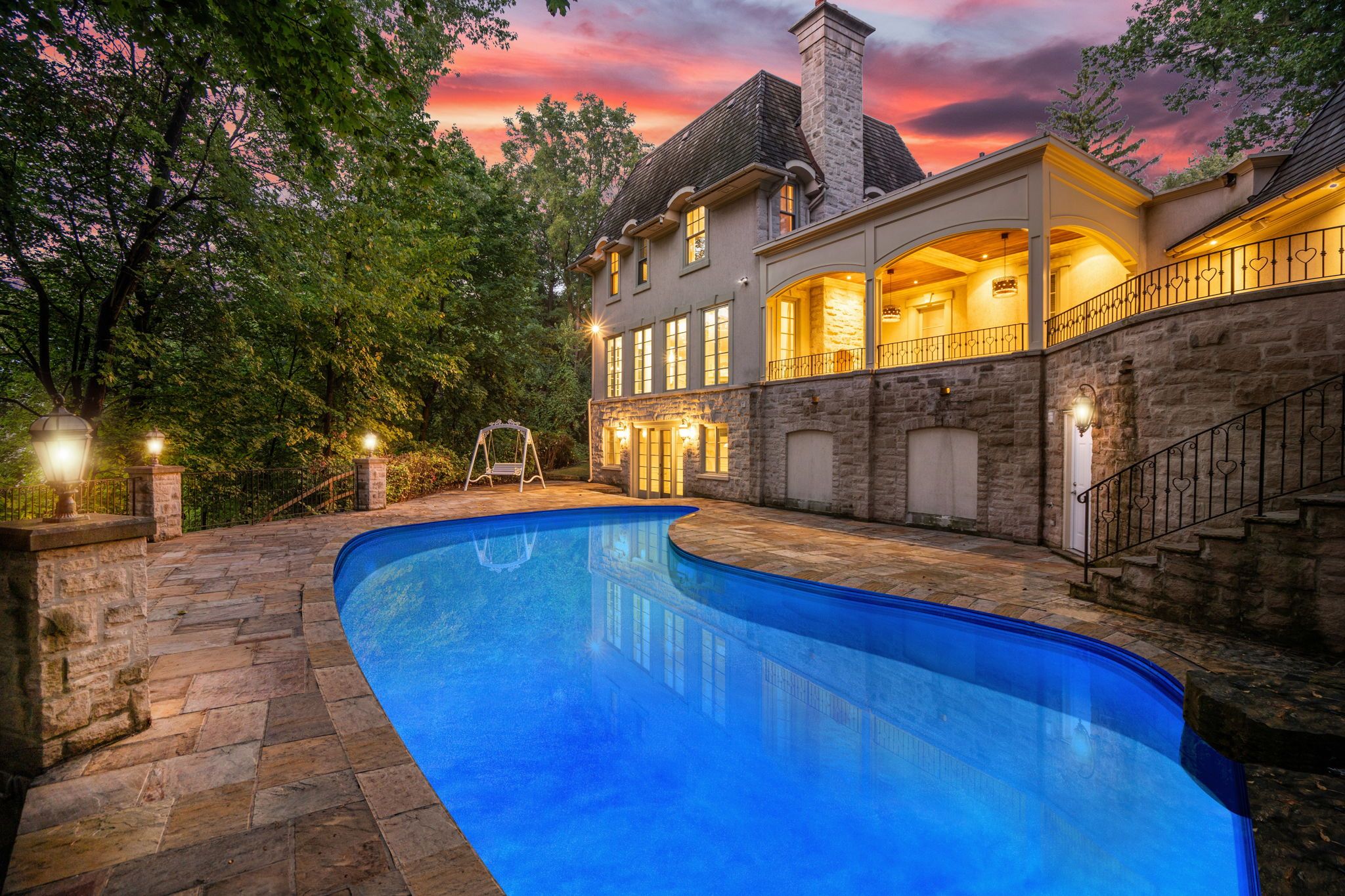 Backs onto ravine! Perched gracefully at the highest point of hoggs hollow, this french château inspired masterpiece sits on a spectacular 239. 08 x 207. 81 ft ravine lot (approx. 1. 14 acres). Designed by dee dee taylor hannah and built by award-winning builder michael rossini, this timeless stone estate offers over 10,000 sq. Ft. Of luxurious living space, blending european elegance with modern comfort. The homes distinctive curved and symmetrical design showcases architectural artistry rarely seen today. Featuring 4 bedrooms with ensuites, 9 washrooms, and a 3-car garage with a circular driveway accommodating up to 15 cars, all principal rooms face west, overlooking the serene ravine. A grand marble foyer, curved hallways, and custom millwork opens to elegant living and dining rooms that walk out to the ravine and garden. Two libraries on main floor, five fireplaces, built-in speakers, 10-ft ceilings, and hardwood floors throughout. The gourmet kitchen with double granite islands and an open-concept family room with motorized curtains creates a warm and inviting space for entertaining. Step out to a 700 sq. Ft. Patio with outdoor fireplace and panoramic ravine views. The primary suite features a lavish 9-piece ensuite, his & her walk-in closets, and heated bathroom floors. The walk-out lower level wth heated floors includes a home theatre, wine cellar, sauna, wet bar, nanny/guest ensuite, and a recreation room with fireplace opening directly to the backyard oasis. The heated concrete pool with cascading waterfall, framed by mature trees, creates a private, resort-like retreat. A rare offering combining elegance, privacy, and tranquility, just moments from the granite club, top private schools (crescent, tfs, havergal, ucc, bss), fine dining, and rosedale & don valley golf clubs. A true statement of taste, craftsmanship, and enduring luxury in one of torontos most prestigious enclaves.