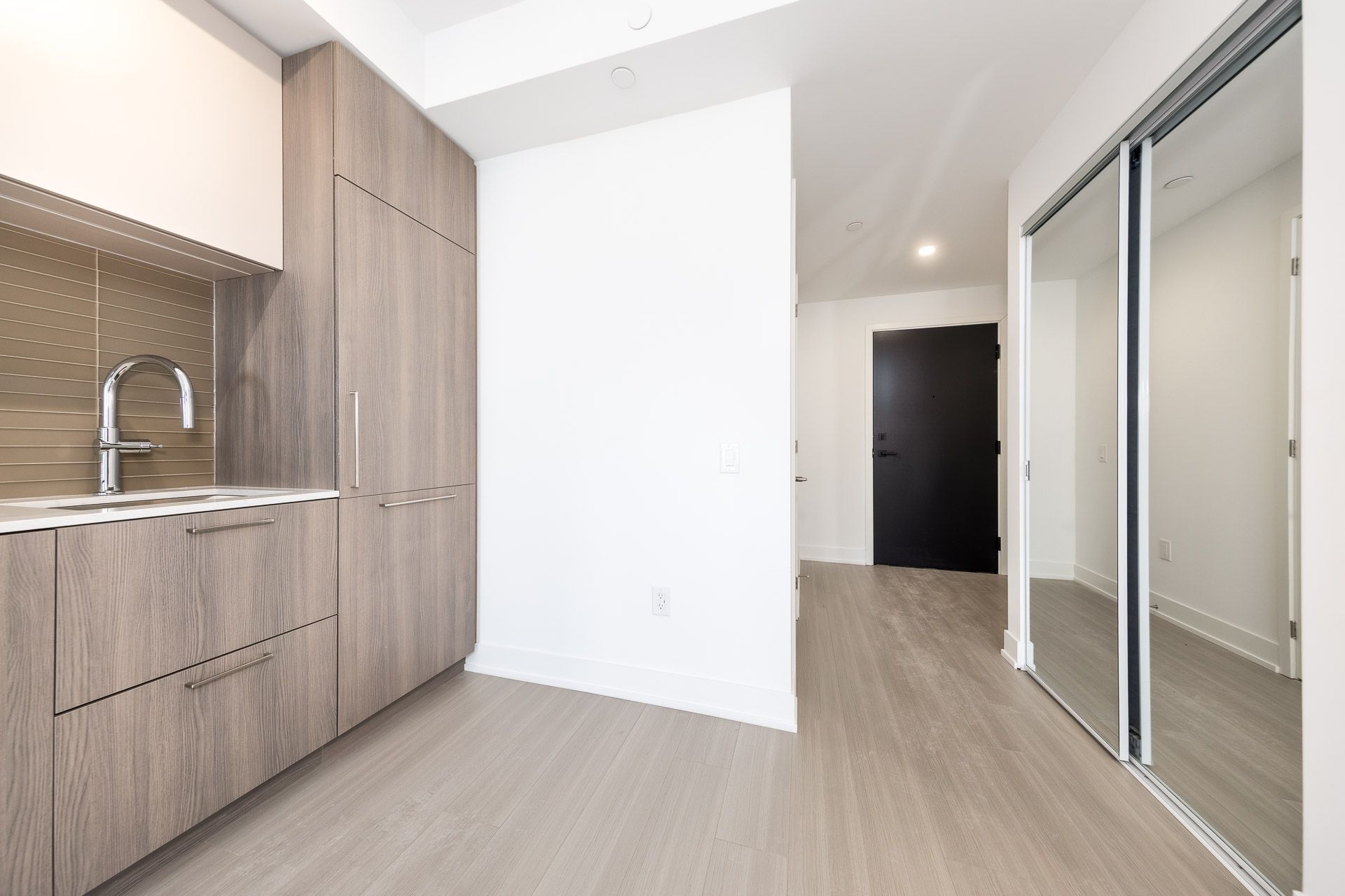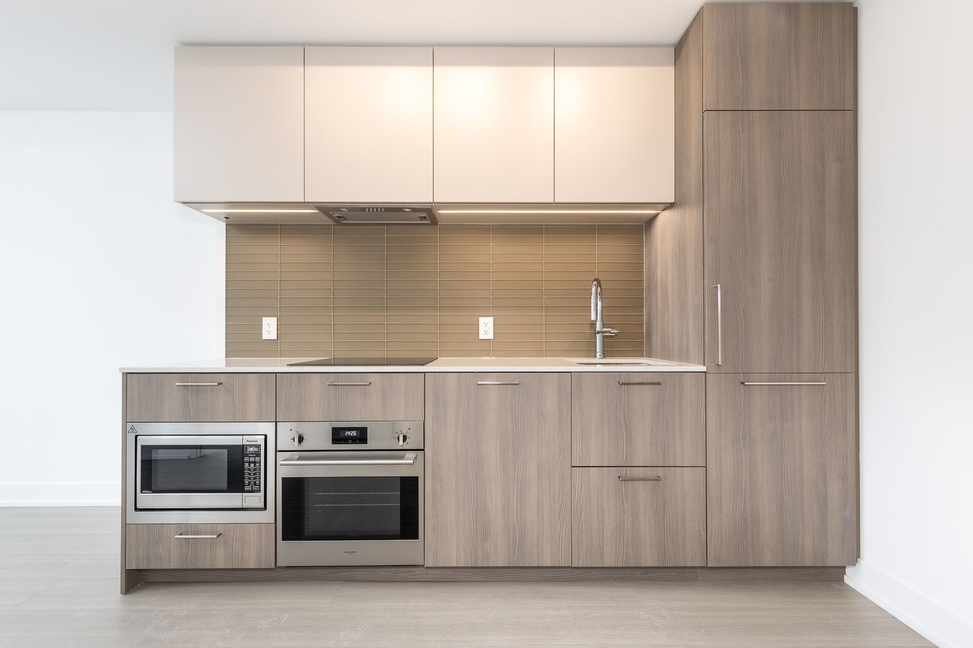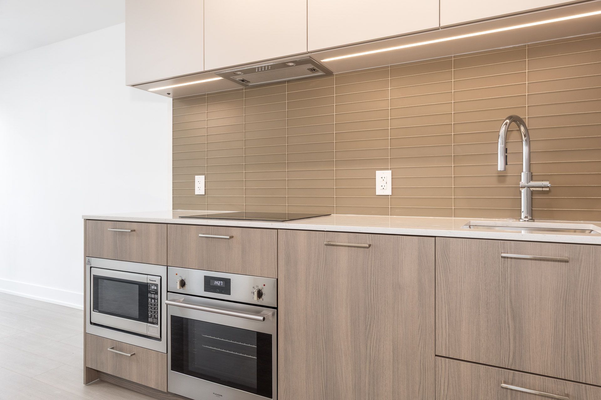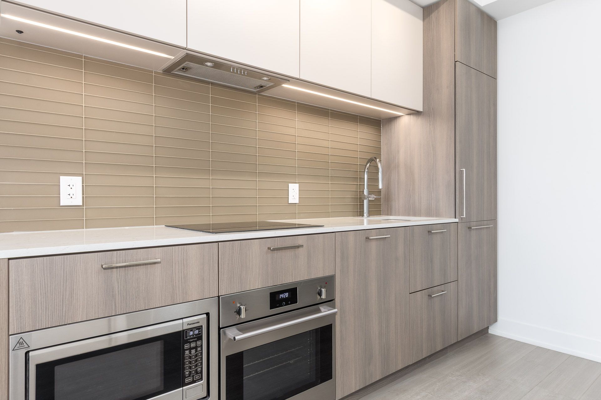 • Modern kitchen with quartz countertops and integrated appliances.