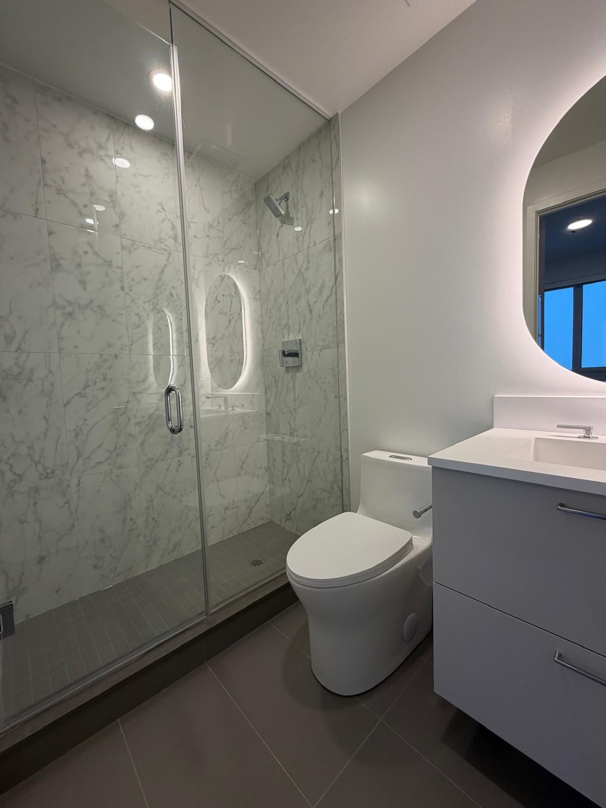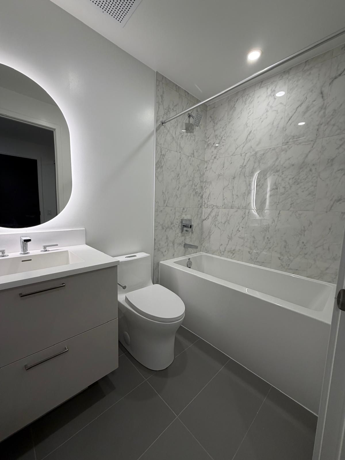 • Modern kitchen with European appliances and quartz countertops for convenience.