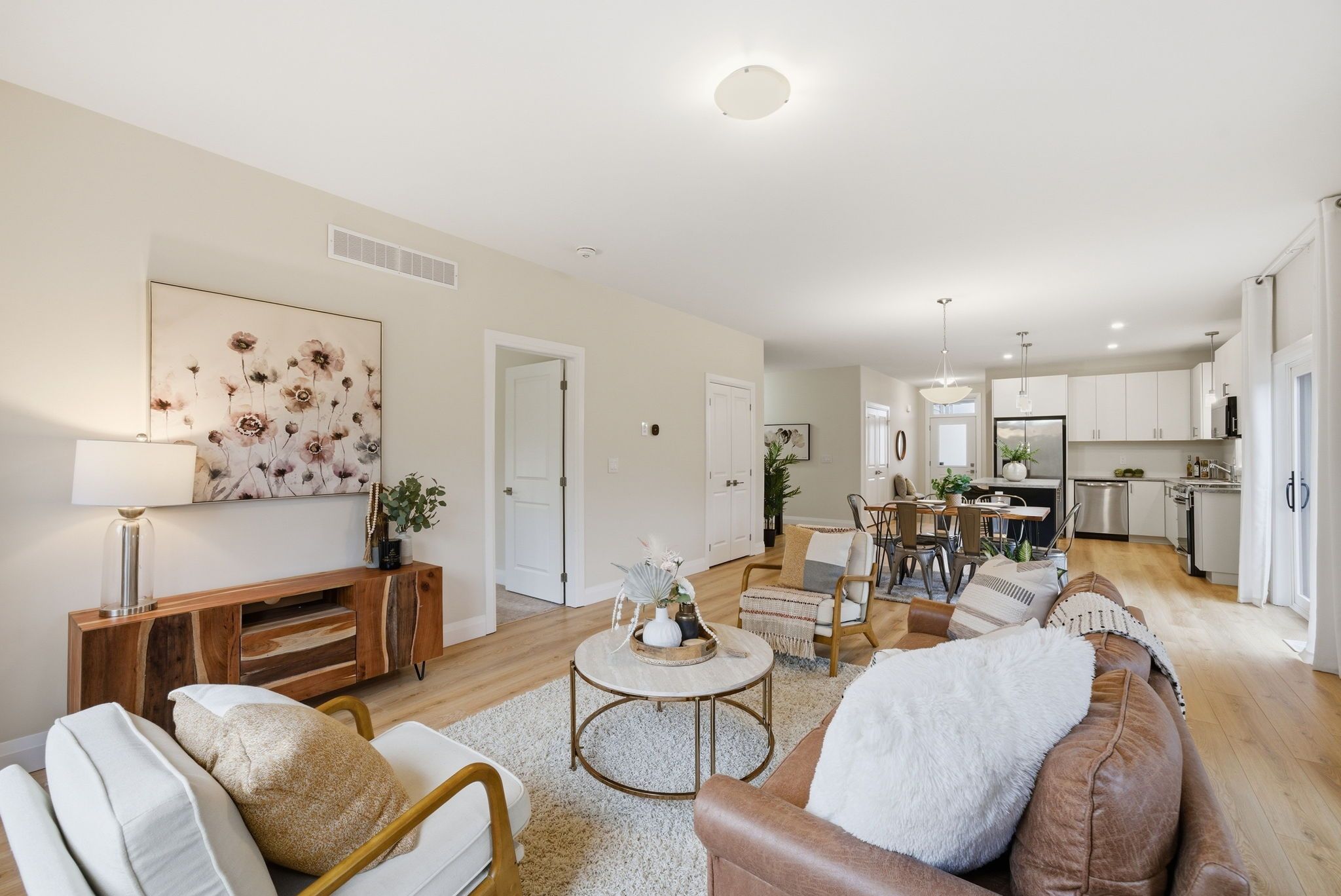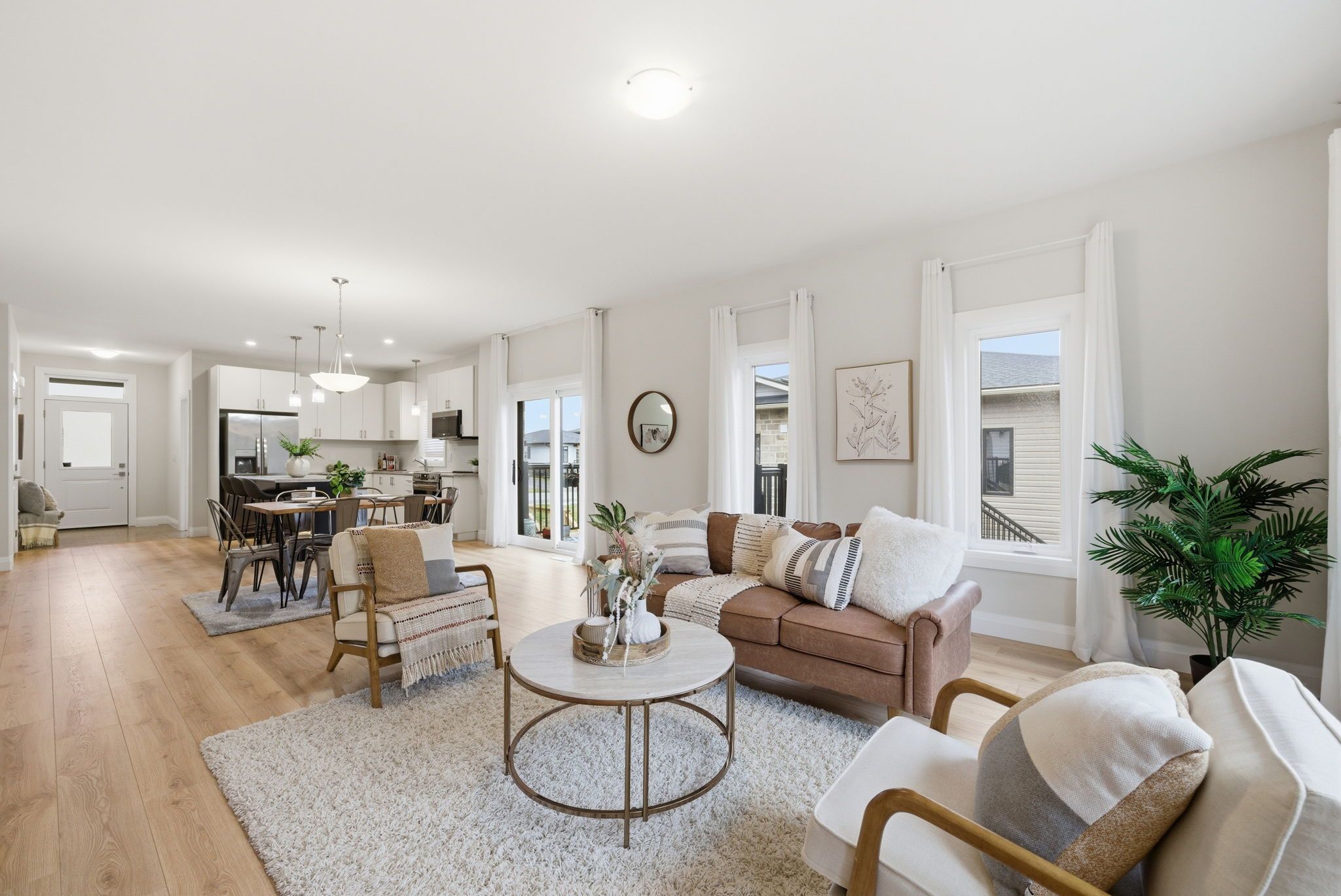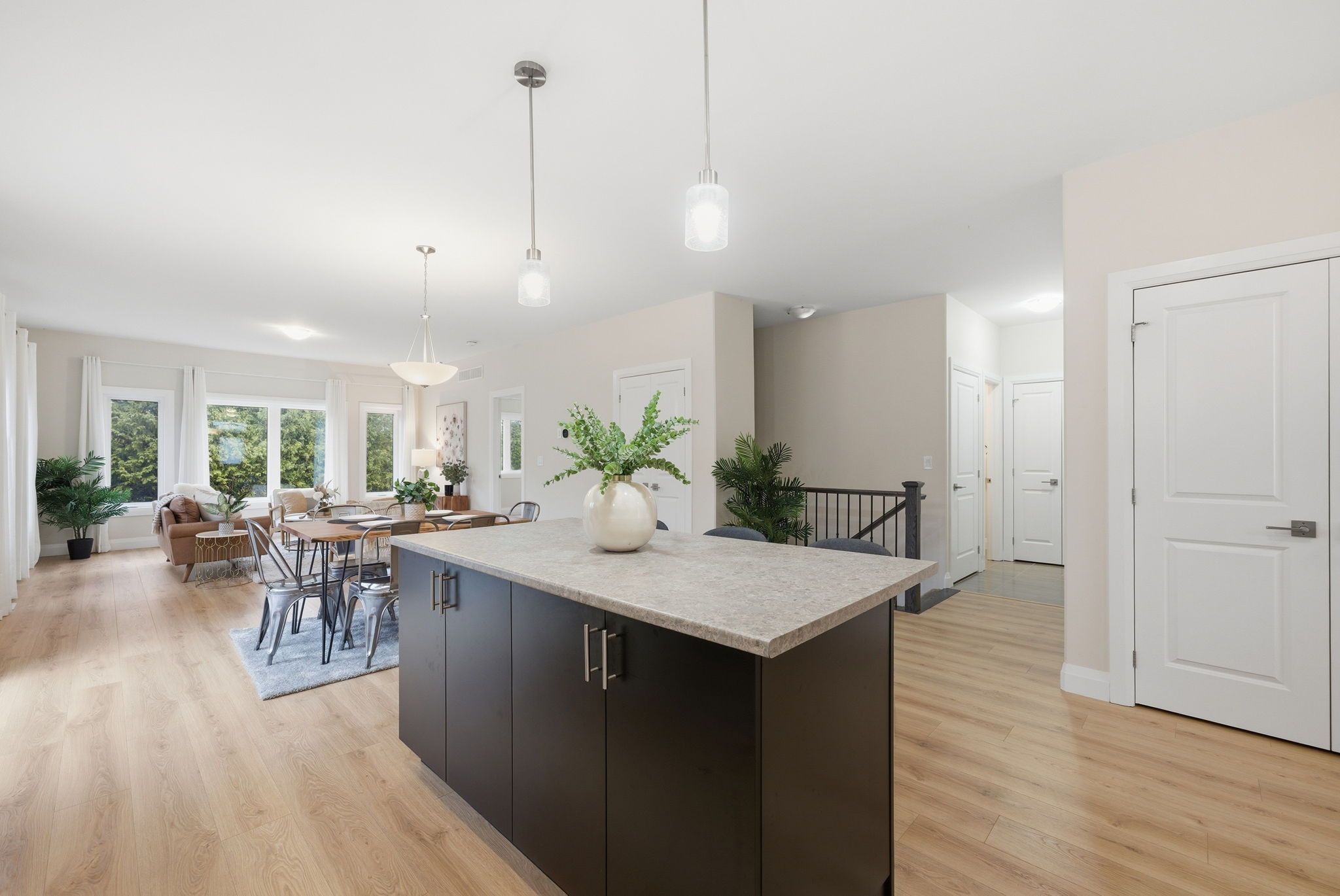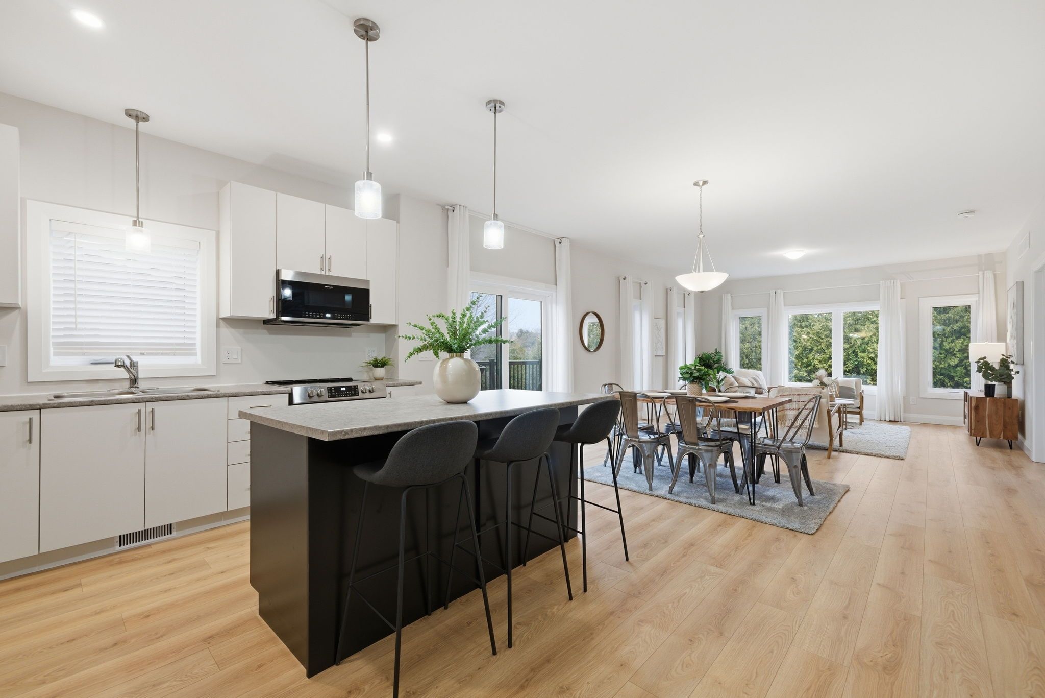 • Bright open-concept main floor with modern kitchen and high ceilings.