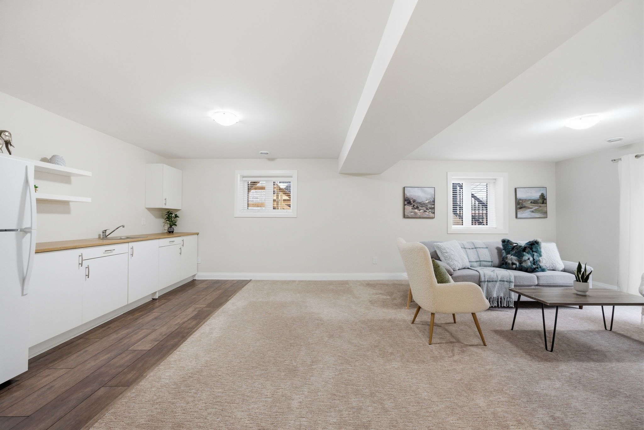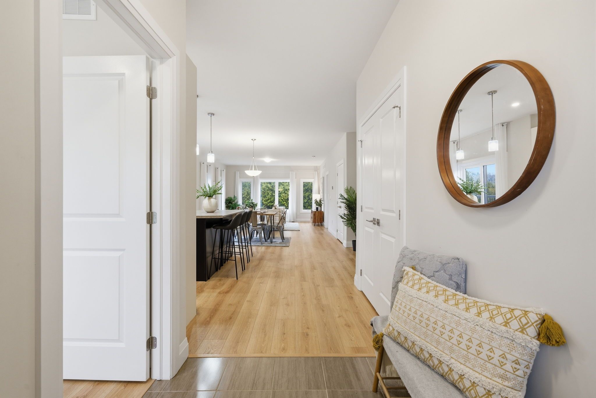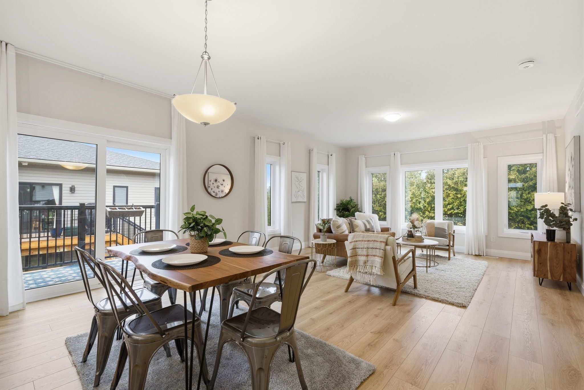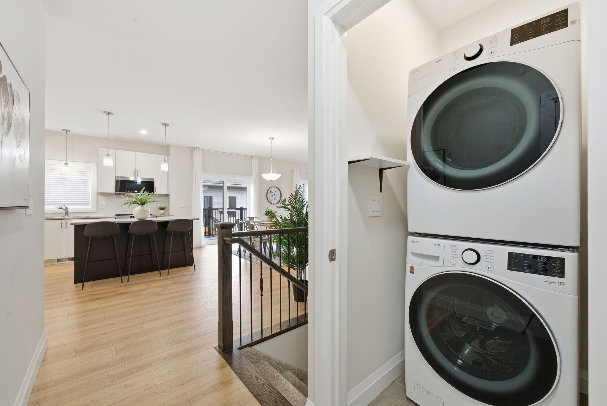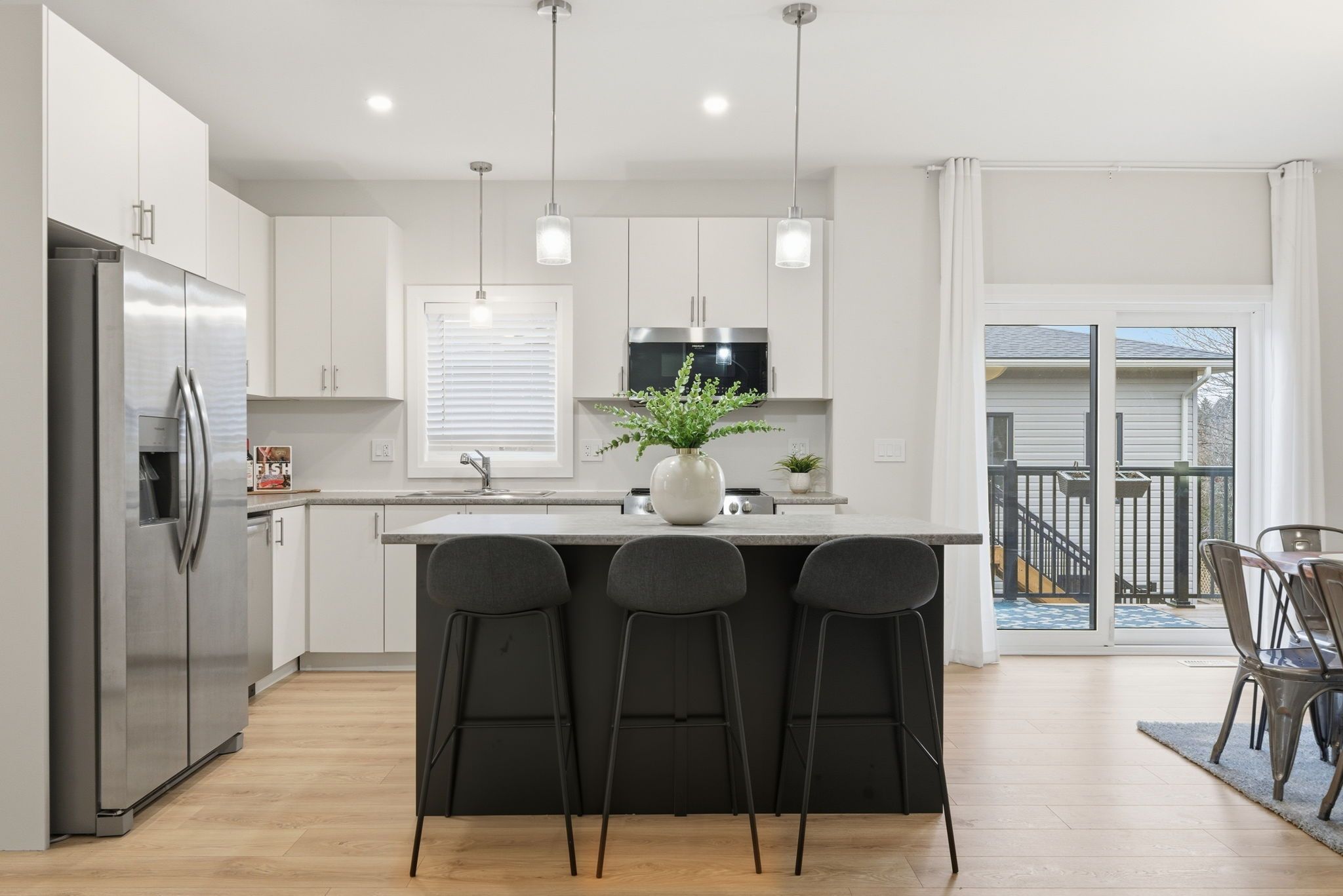 • Bright open-concept main floor with modern kitchen and high ceilings.