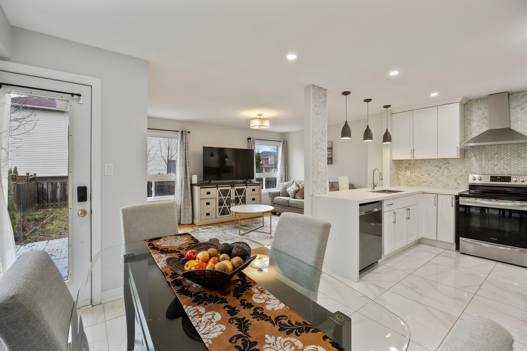 • Open concept layout with modern kitchen and stainless steel appliances.