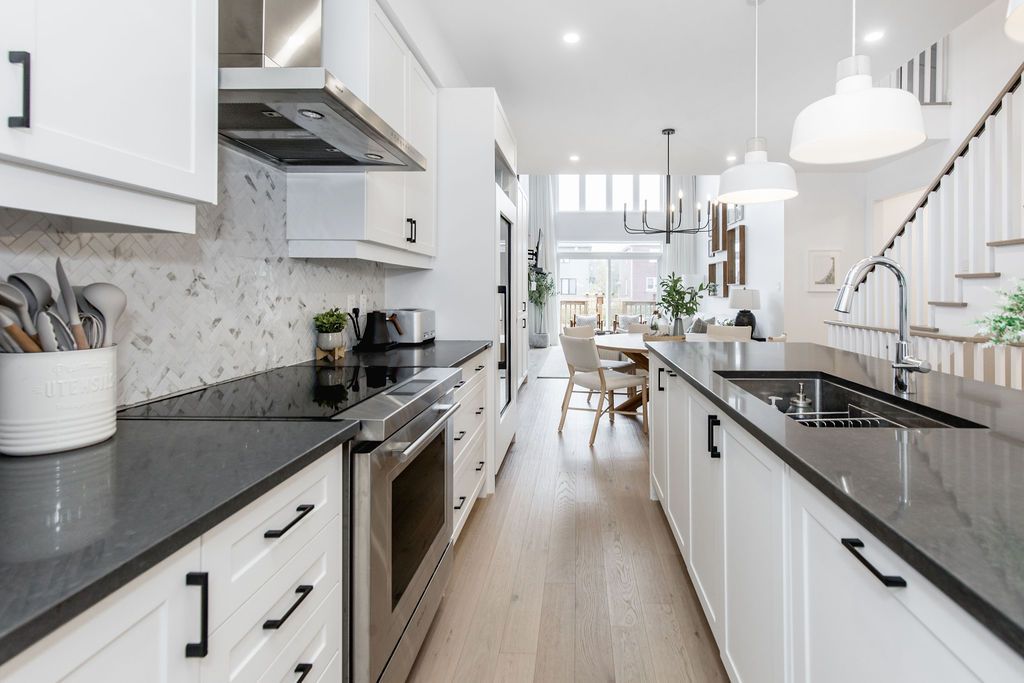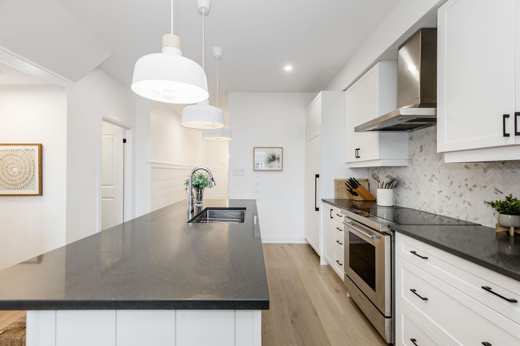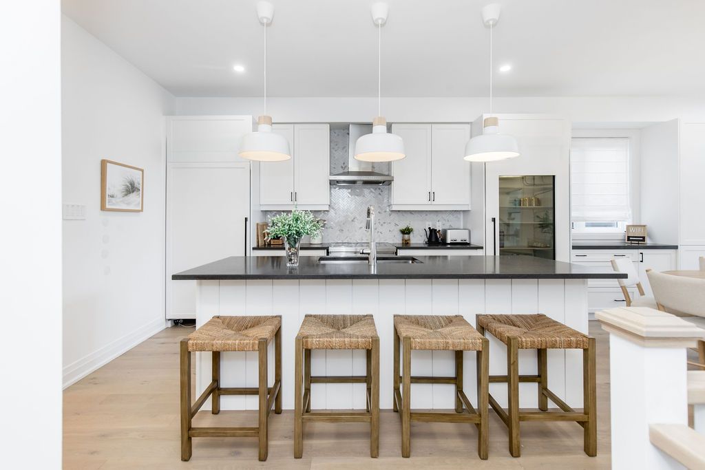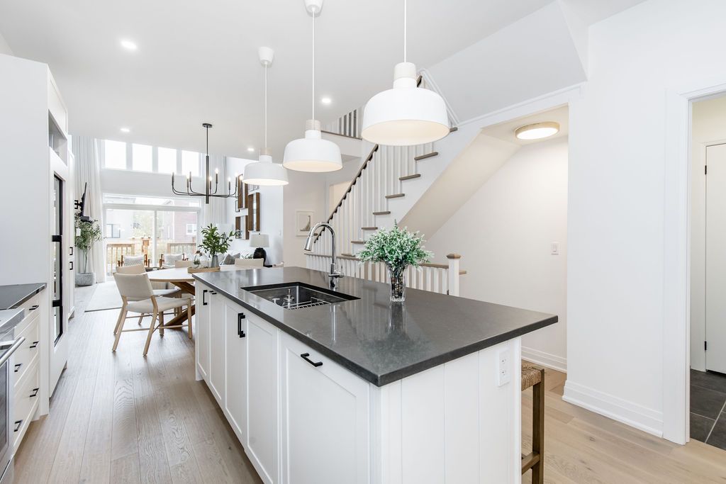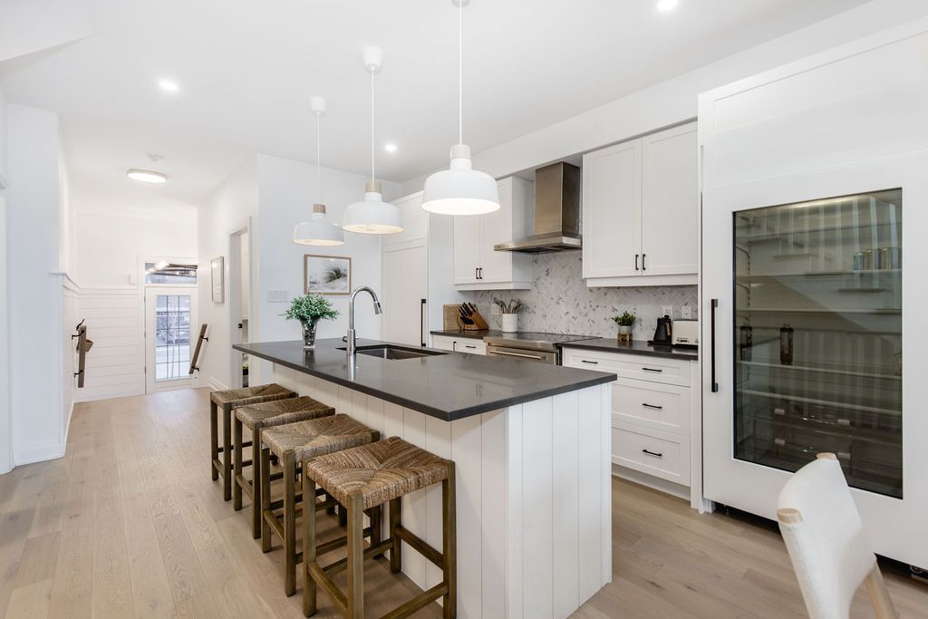 • Open-concept kitchen features a large quartz island and premium appliances.