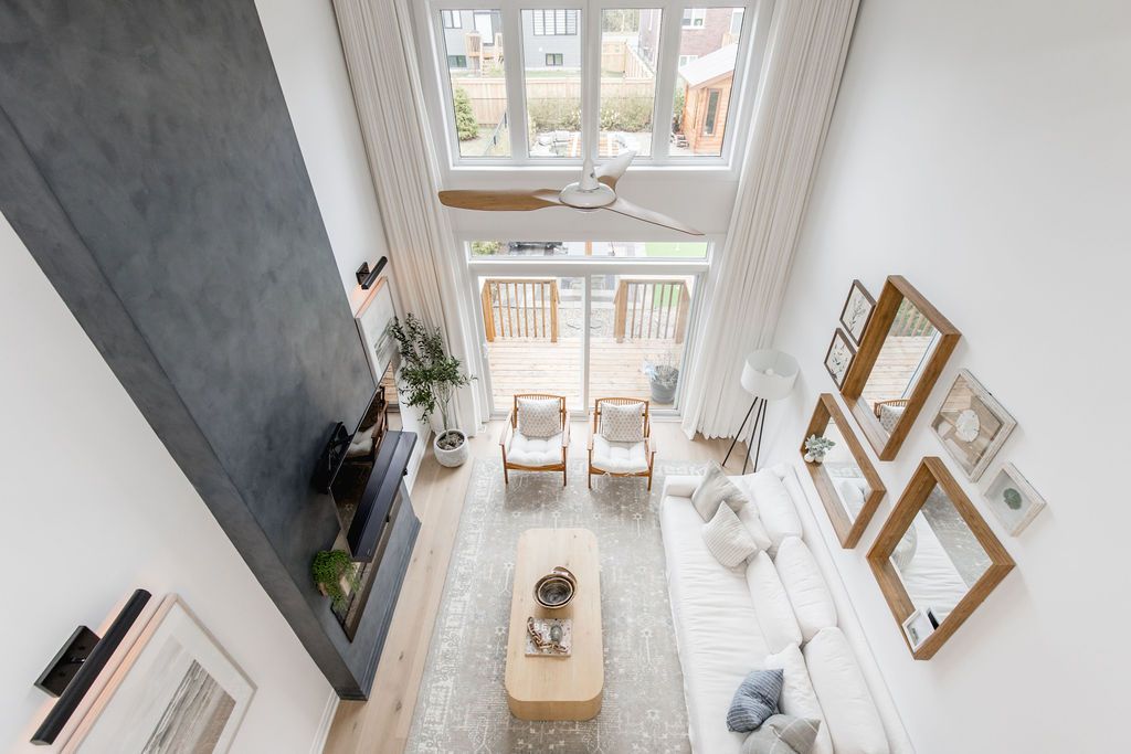 • Living room boasts 16-foot ceilings and a stunning limewash fireplace.