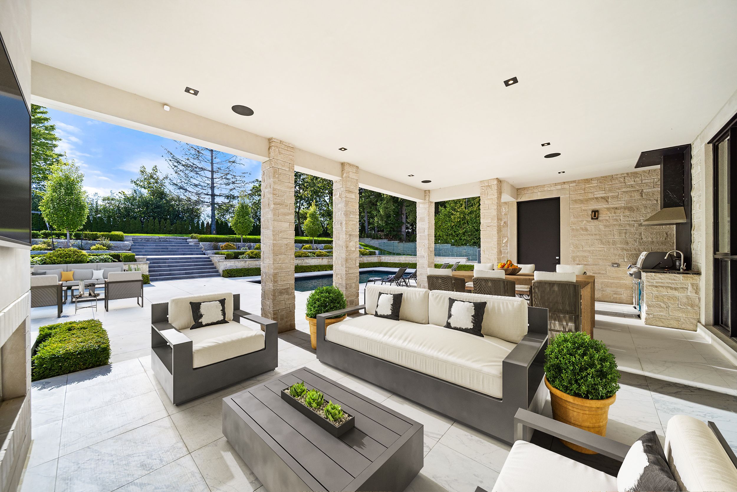 • Outdoor oasis includes saltwater pool, cabana, and outdoor kitchen.
