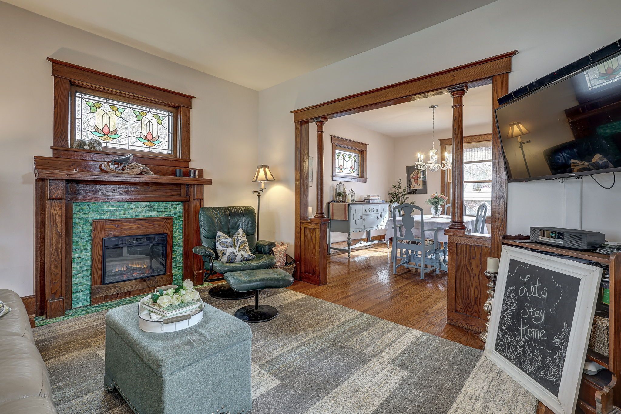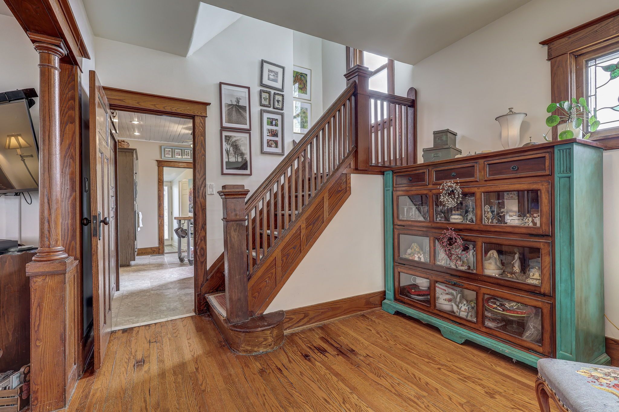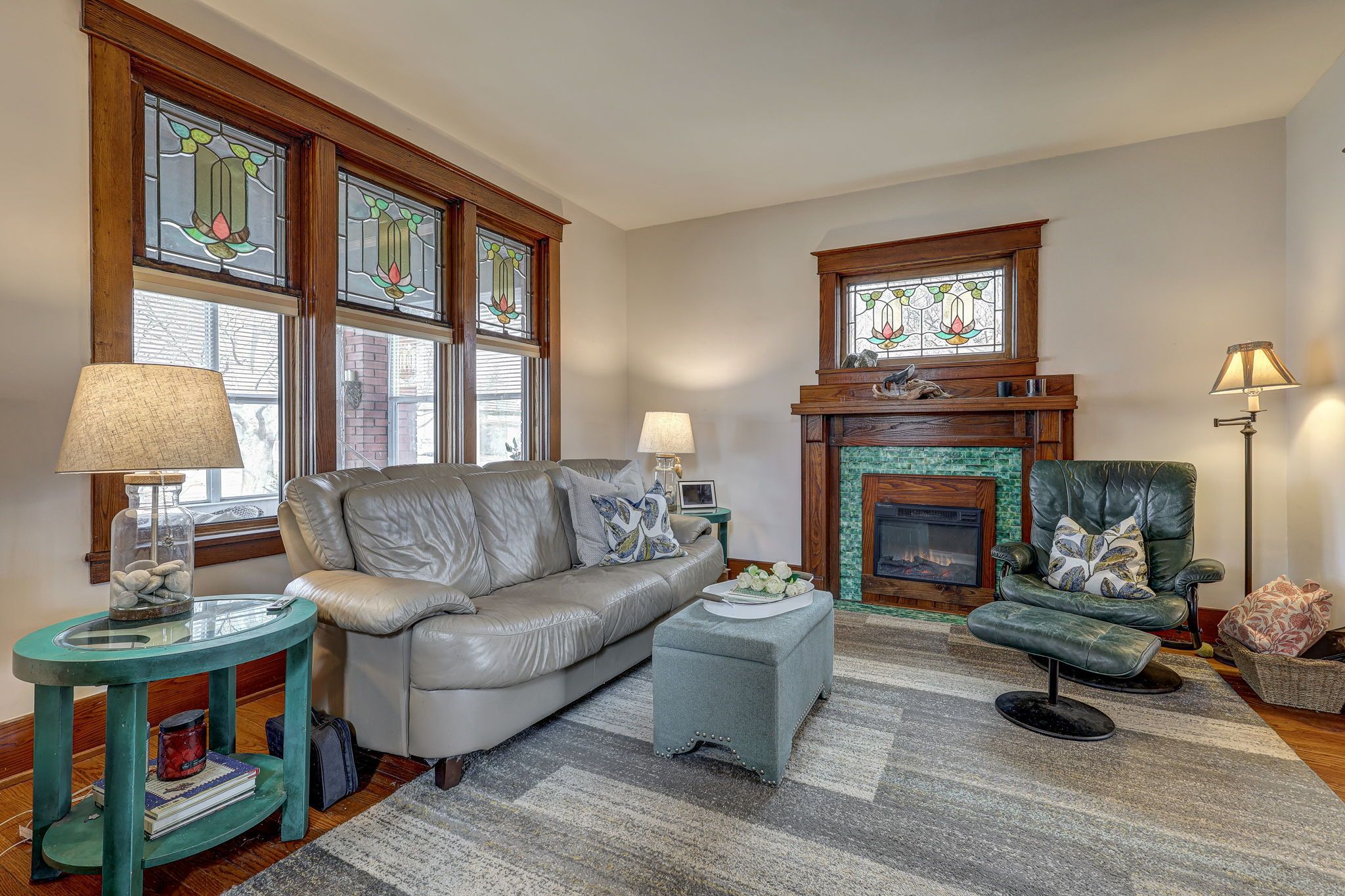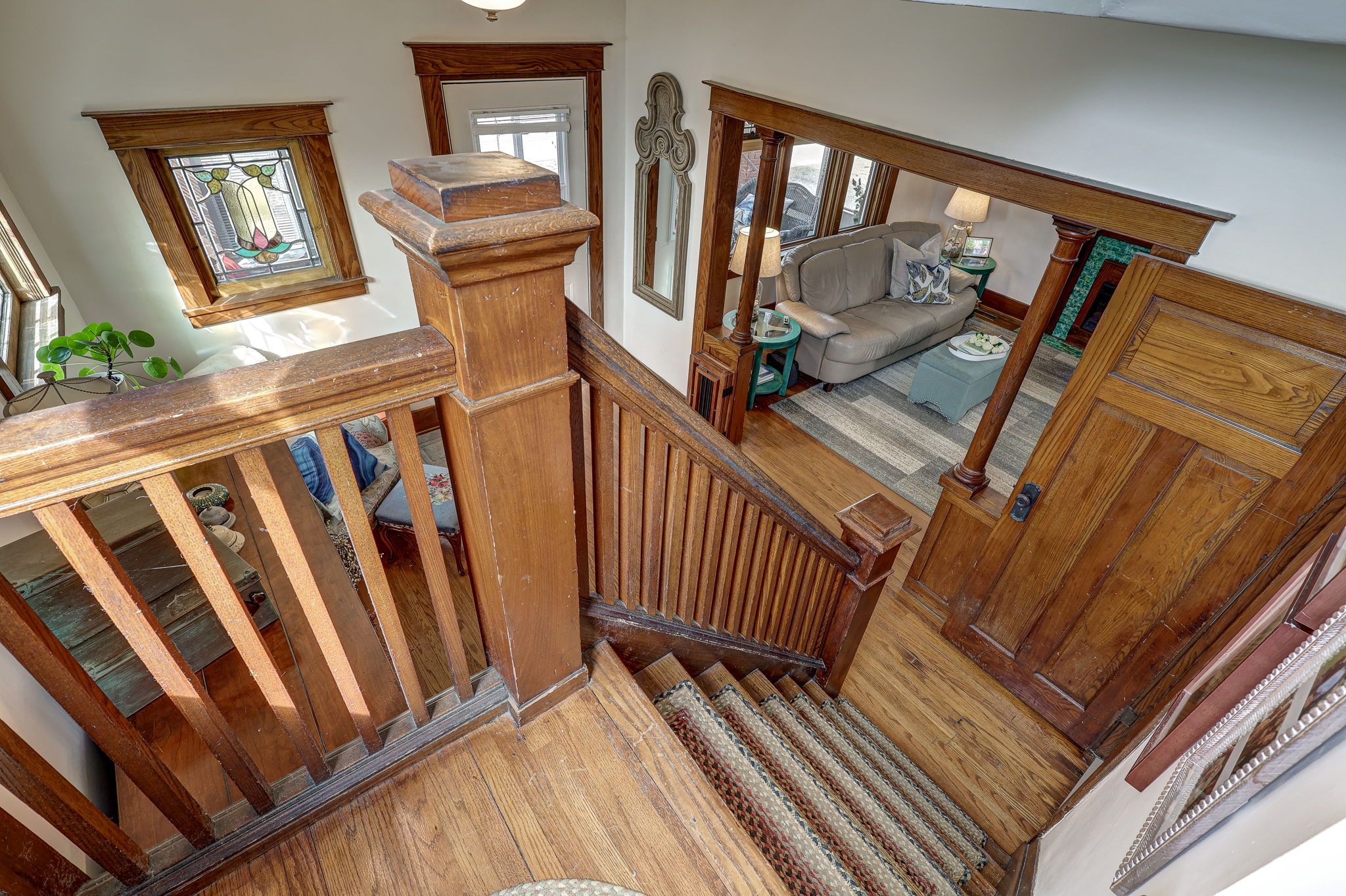 • Bright main level features original hardwood flooring and stained glass windows.