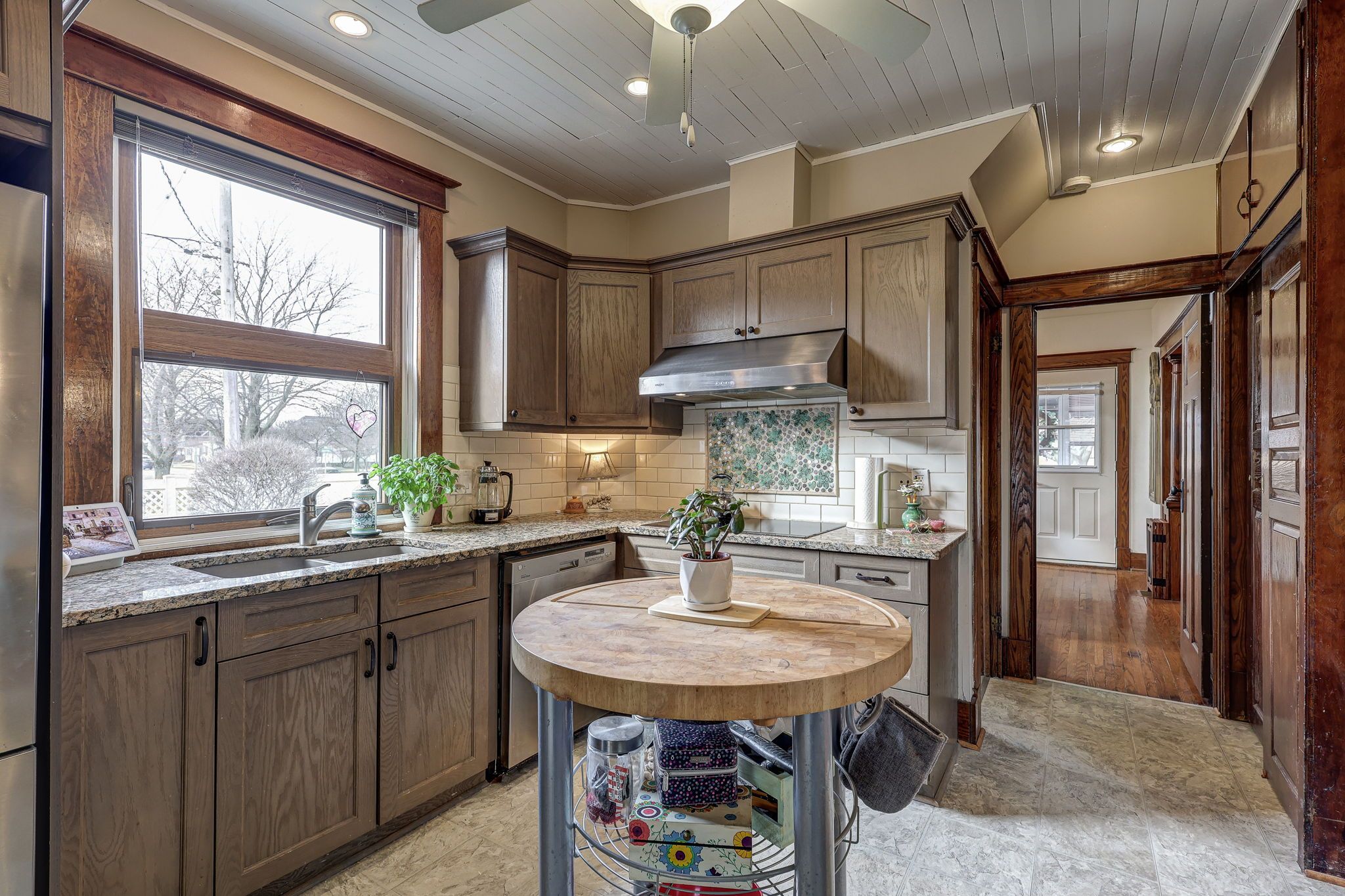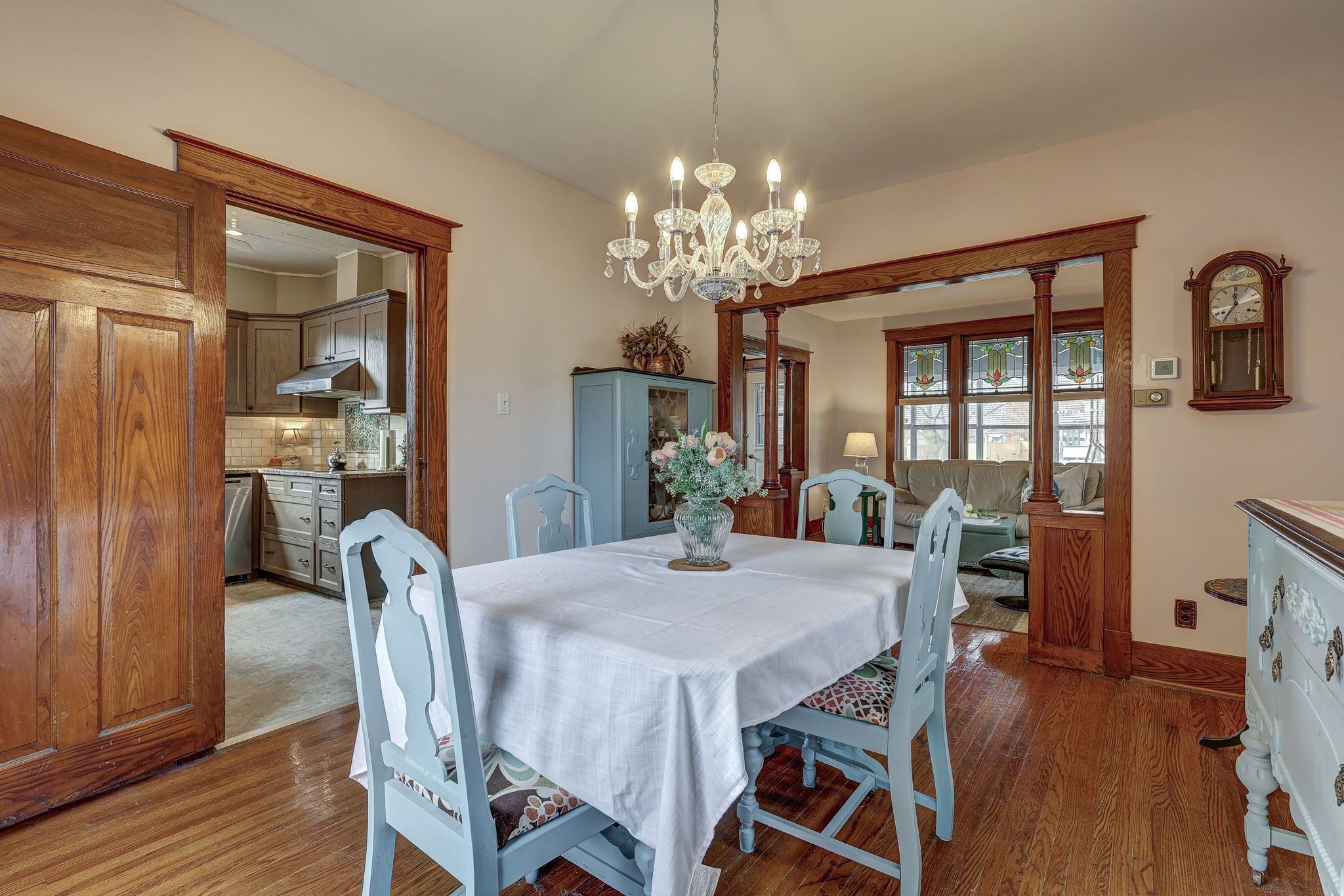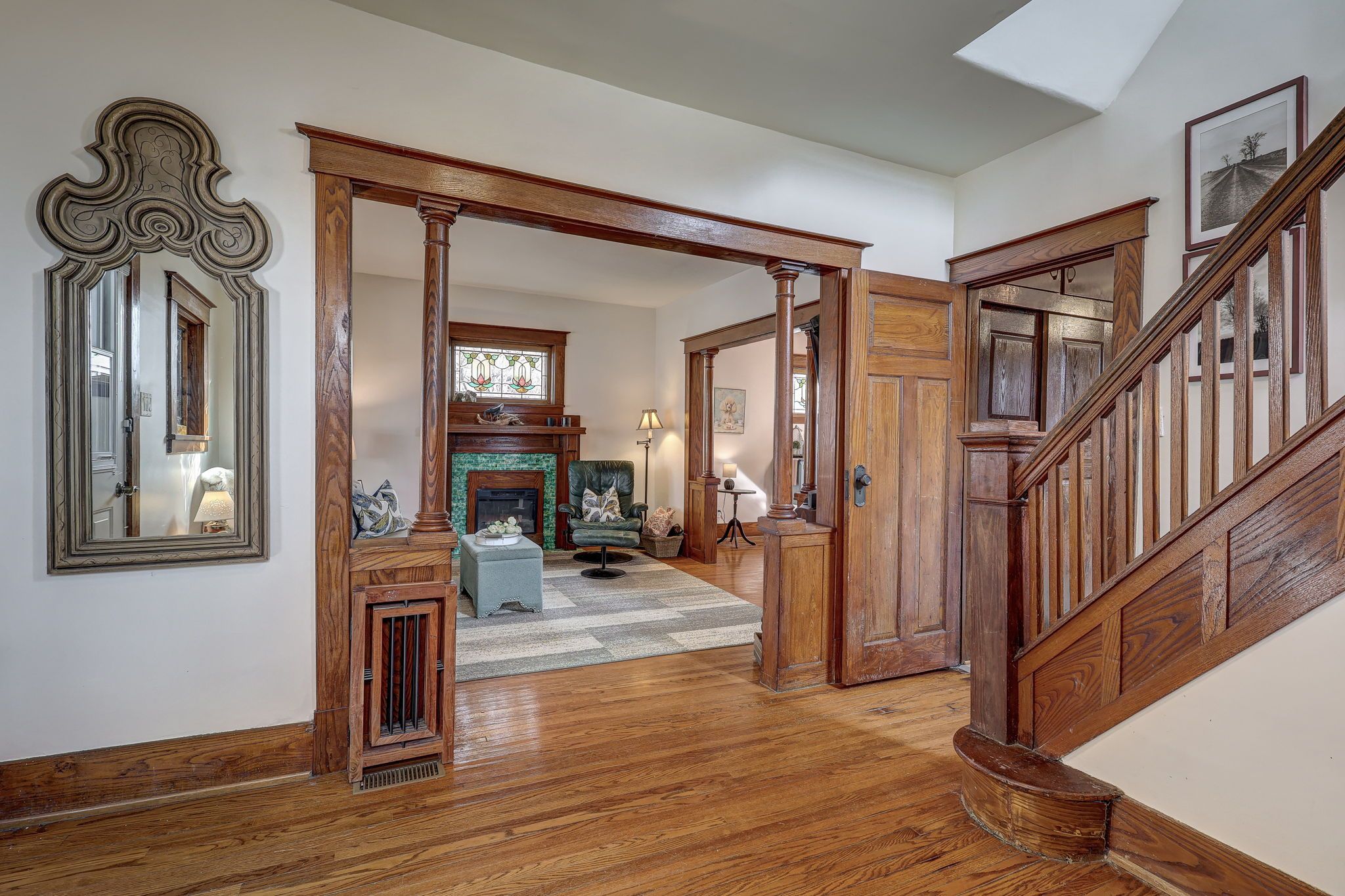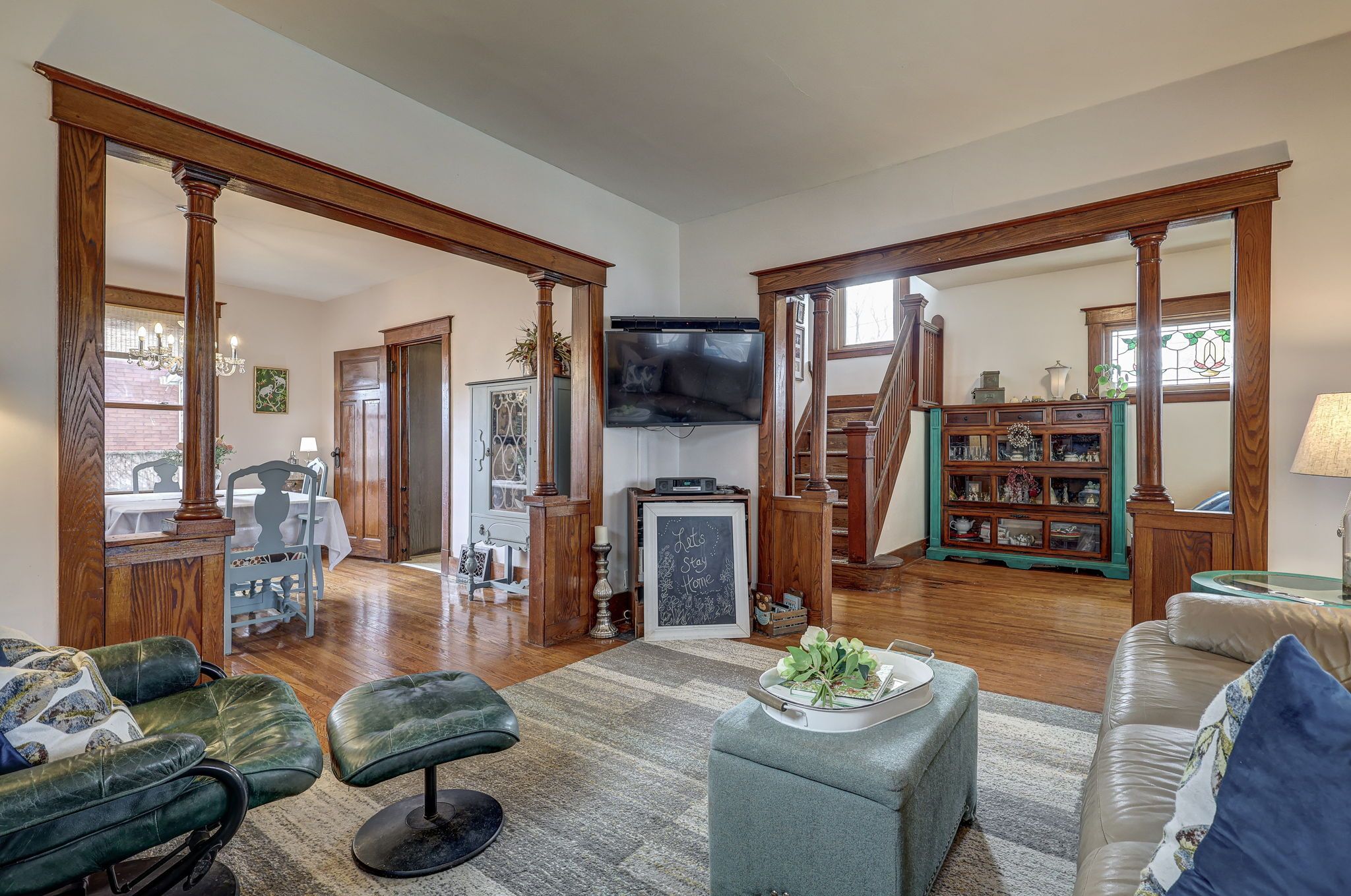 • Bright main level features original hardwood flooring and stained glass windows.