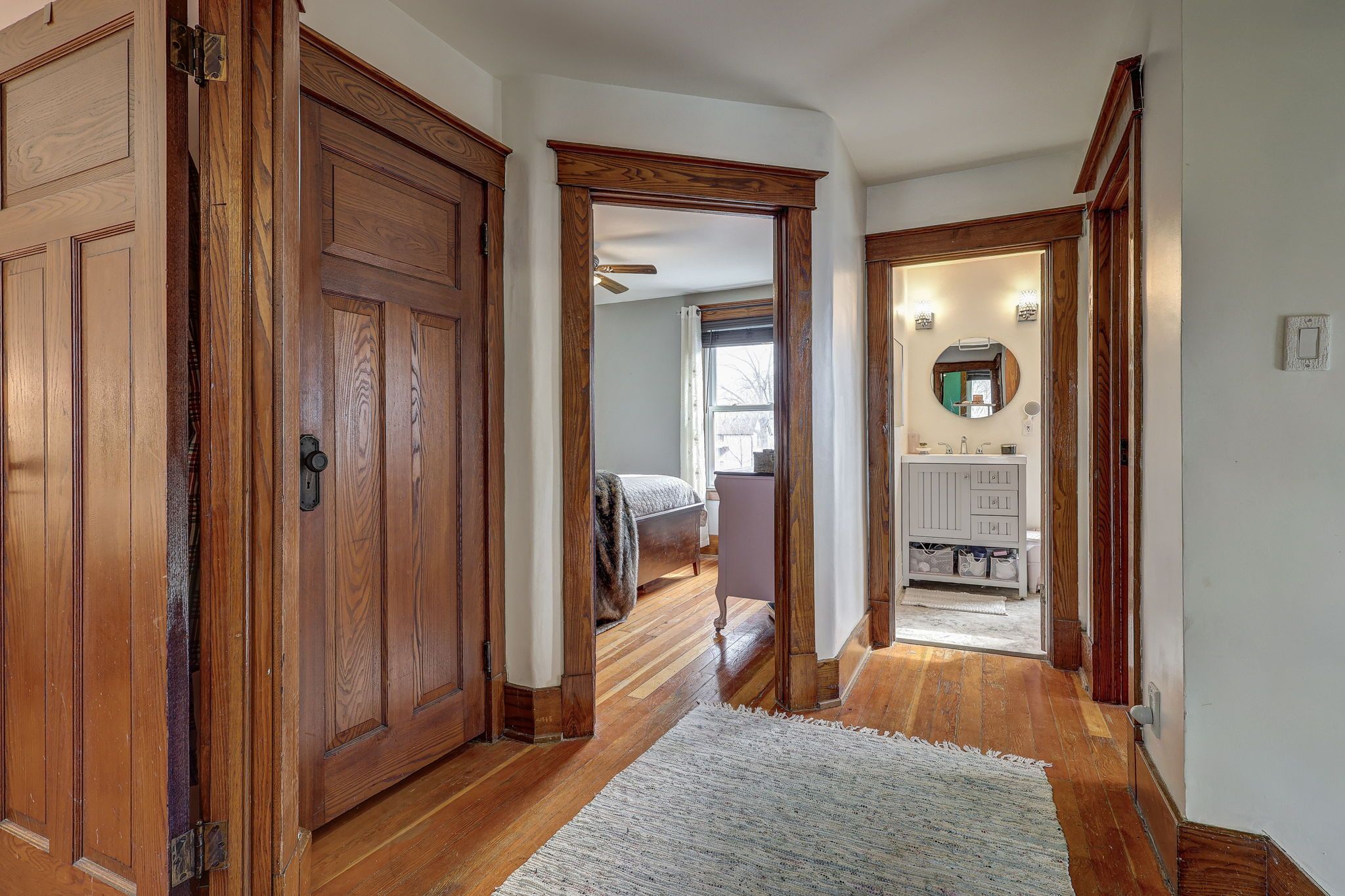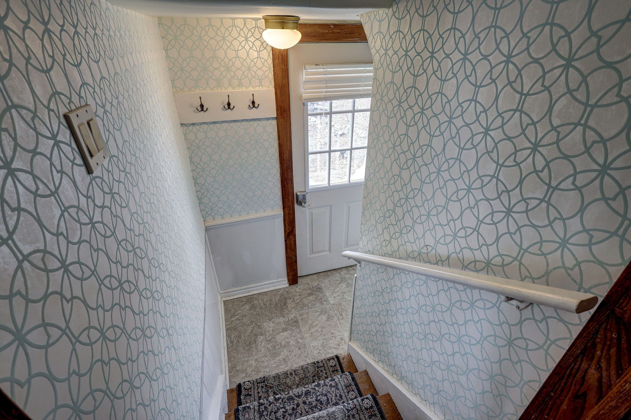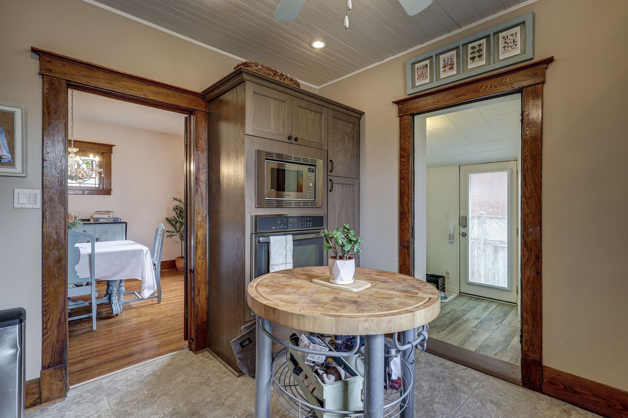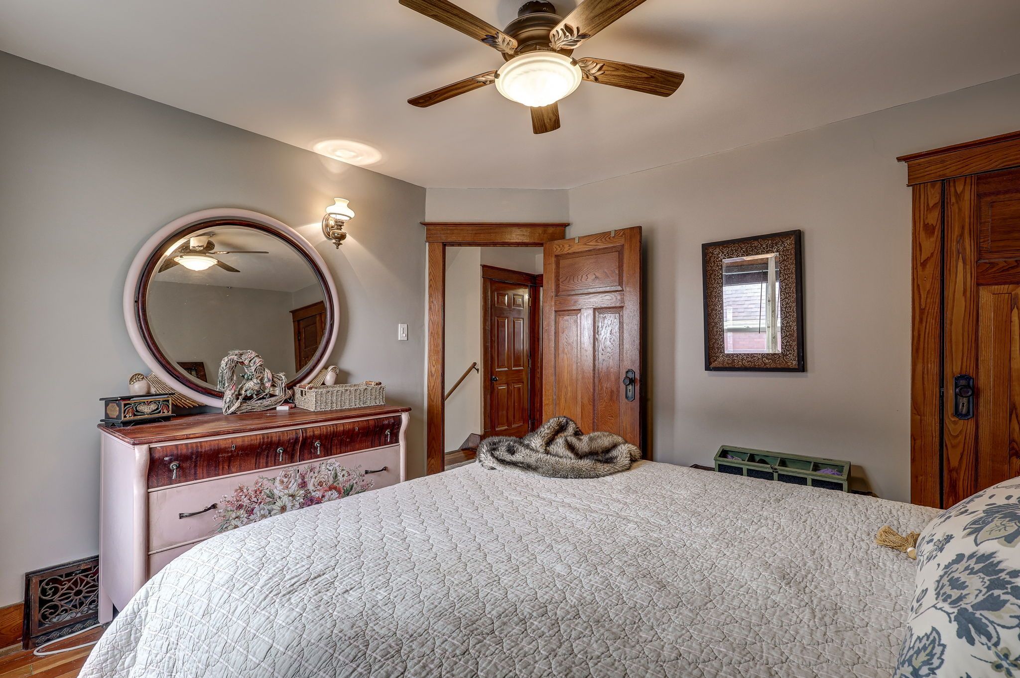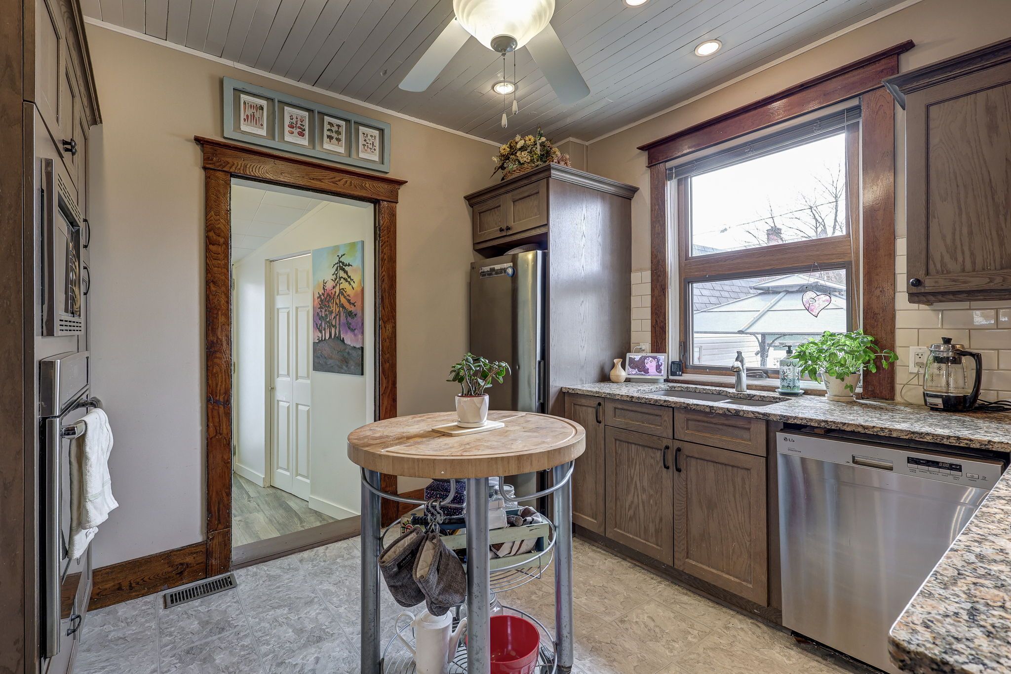 • Bright main level features original hardwood flooring and stained glass windows.