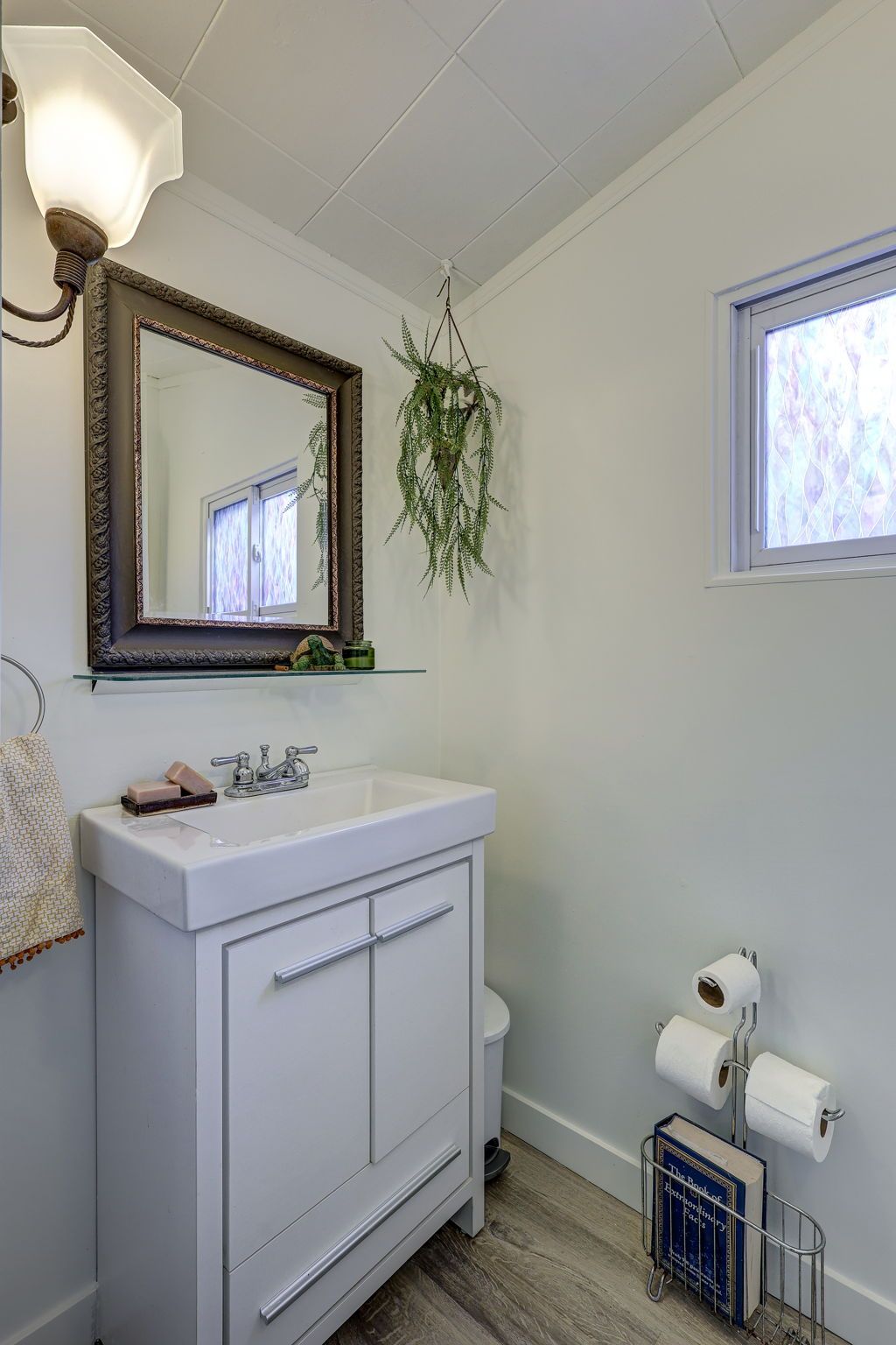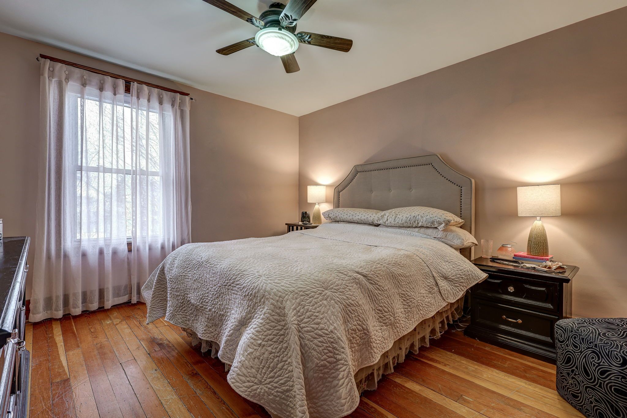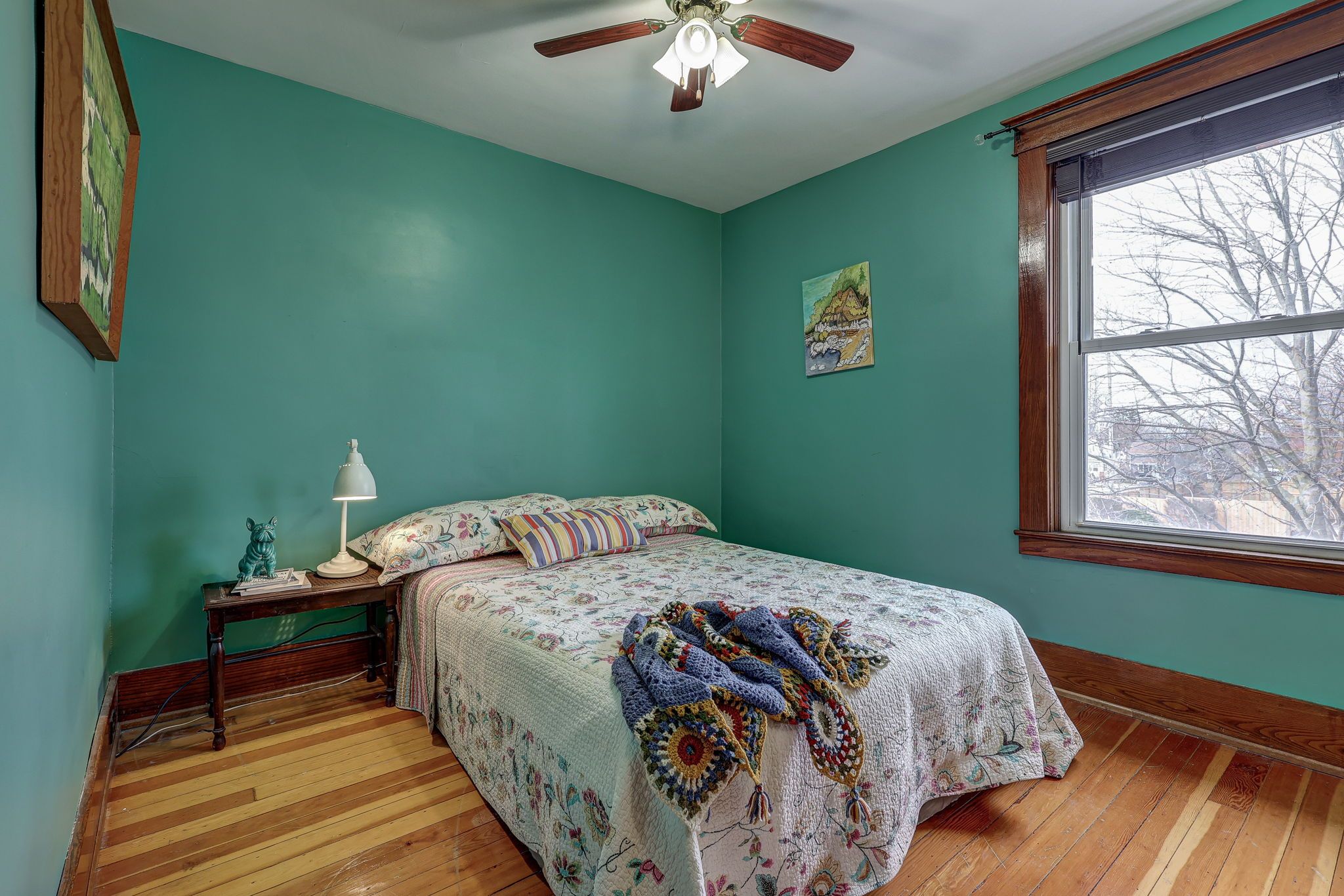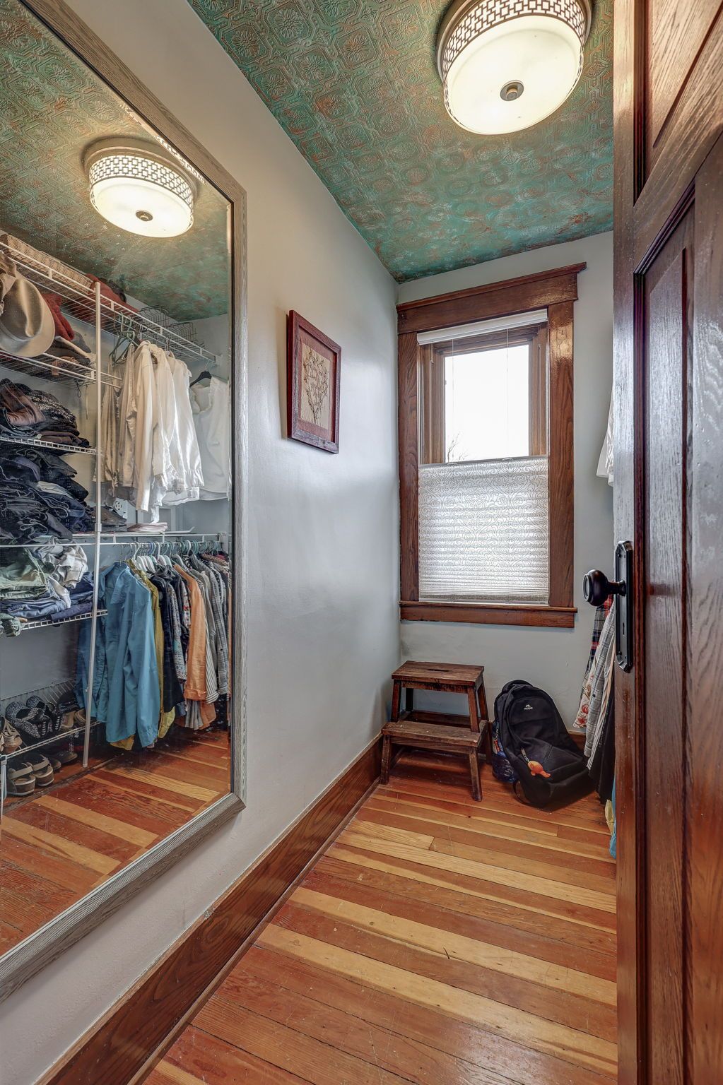 • Bright main level features original hardwood flooring and stained glass windows.