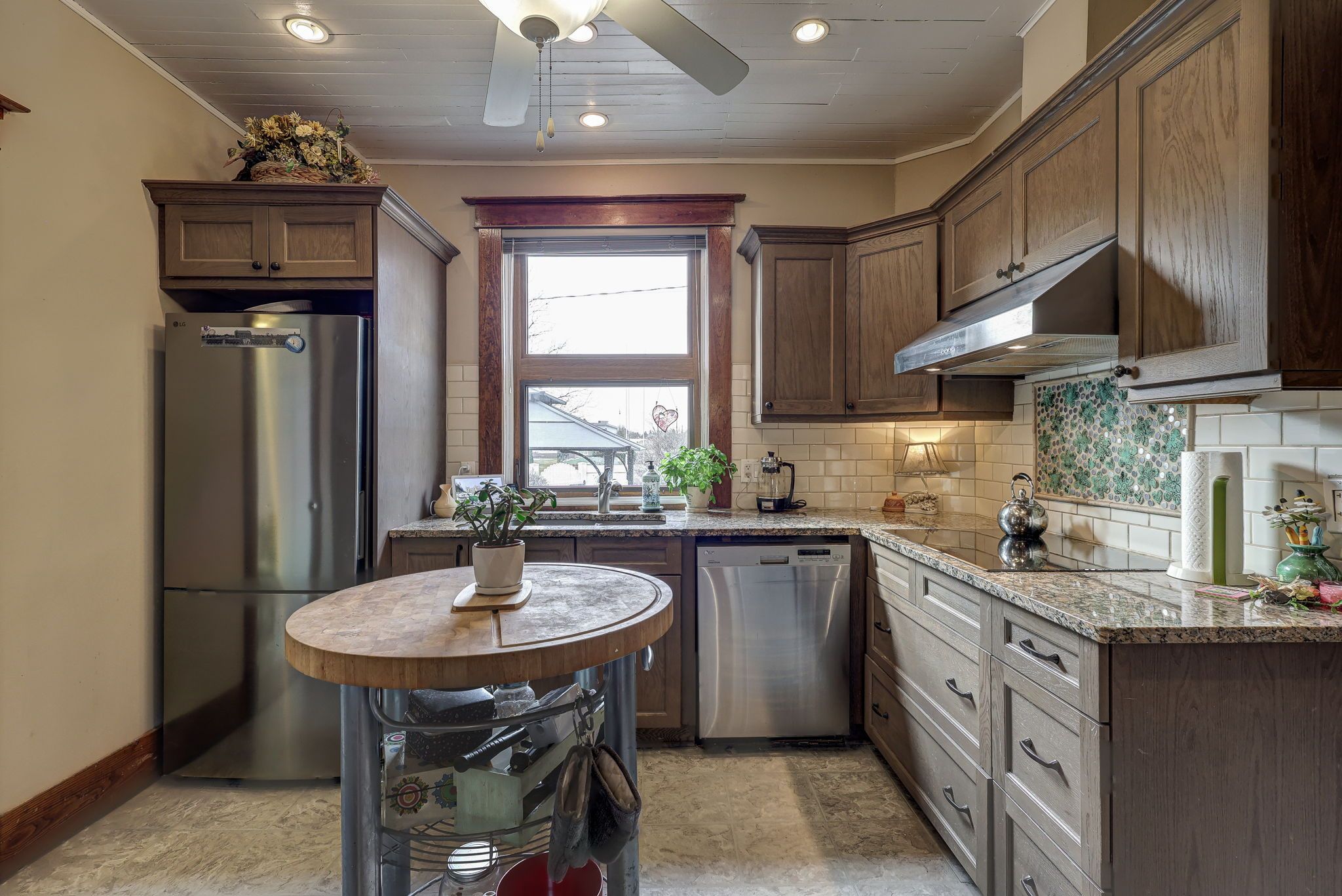 Classic red brick 2-storey full of timeless character and thoughtful updates! This beautifully maintained century home offers warmth, charm, and modern function in a desirable setting. Step through the welcoming front entrance into a bright main level featuring original hardwood flooring, elegant stained glass windows, and an inviting electric fireplace that adds cozy ambiance. The enclosed front porch provides the perfect spot to relax year-round. Entertain with ease in the spacious formal dining room, while the updated kitchen impresses with granite countertops, an island, an induction oven, ample cabinetry, plus a highly functional pantry. A convenient 2-piece powder room and a practical mudroom area enhance everyday living. Upper floor laundry is discreetly tucked into a closet for added convenience. Upstairs, you'll find three comfortable bedrooms, all with hardwood flooring. The primary bedroom includes custom window shades. A full bathroom with shower/tub combination serves the upper level. The lower level features a full second kitchen, rec room, craft space, two-piece bathroom that could easily be converted to a full bath for extended family, guests, or multi-generational living potential. Additional highlights include, original hardwood floors, beautiful stained glass details, blown-in insulation for improved efficiency, furnace updated approximately 4 years ago, roof shingles replaced in 2015, single garage plus storage shed, over 100 years of character and craftsmanship a rare opportunity to own a classic century home that blends historic charm with smart modern updates.