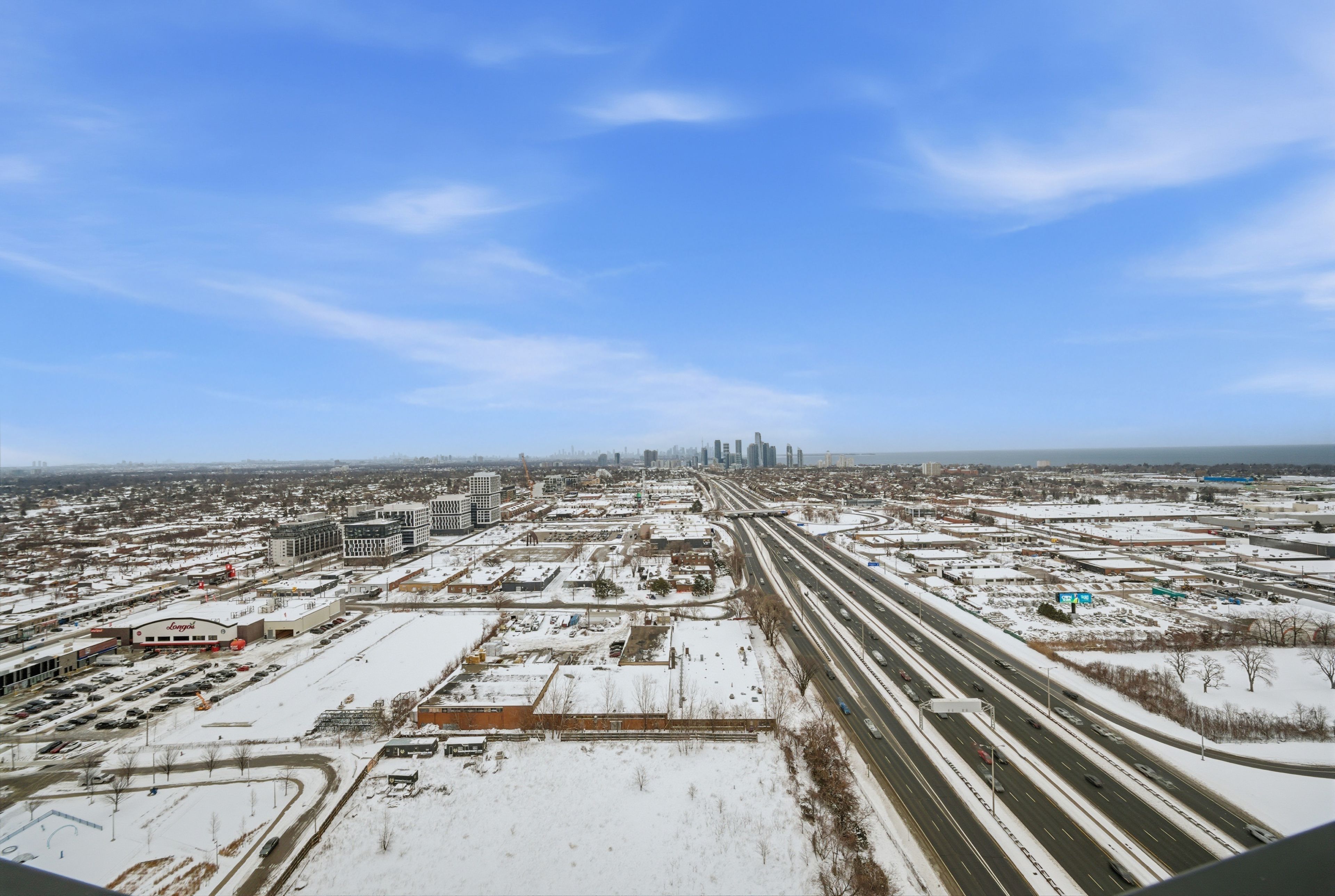 Bright and modern contemporary suite featuring panoramic lake and city skyline views from a spacious 150 sq. Ft. Balcony. Functional open-concept layout with 9' ceilings, one bedroom plus den, and one full bathroom. Laminate flooring throughout the main living area and bedroom. Updated kitchen with extended cabinetry, quartz countertops, and backsplash. Upgraded four-piece bathroom with deep soaker tub, modern finishes, and large quartz topped vanity. One underground parking and locker included. The building offers over 9,500 sq. Ft. Of amenities including fitness centre, sauna, outdoor pool, concierge, party room, guest suites, co-working space, recreation room, kids' room, pet wash, and direct shuttle service to subway station.