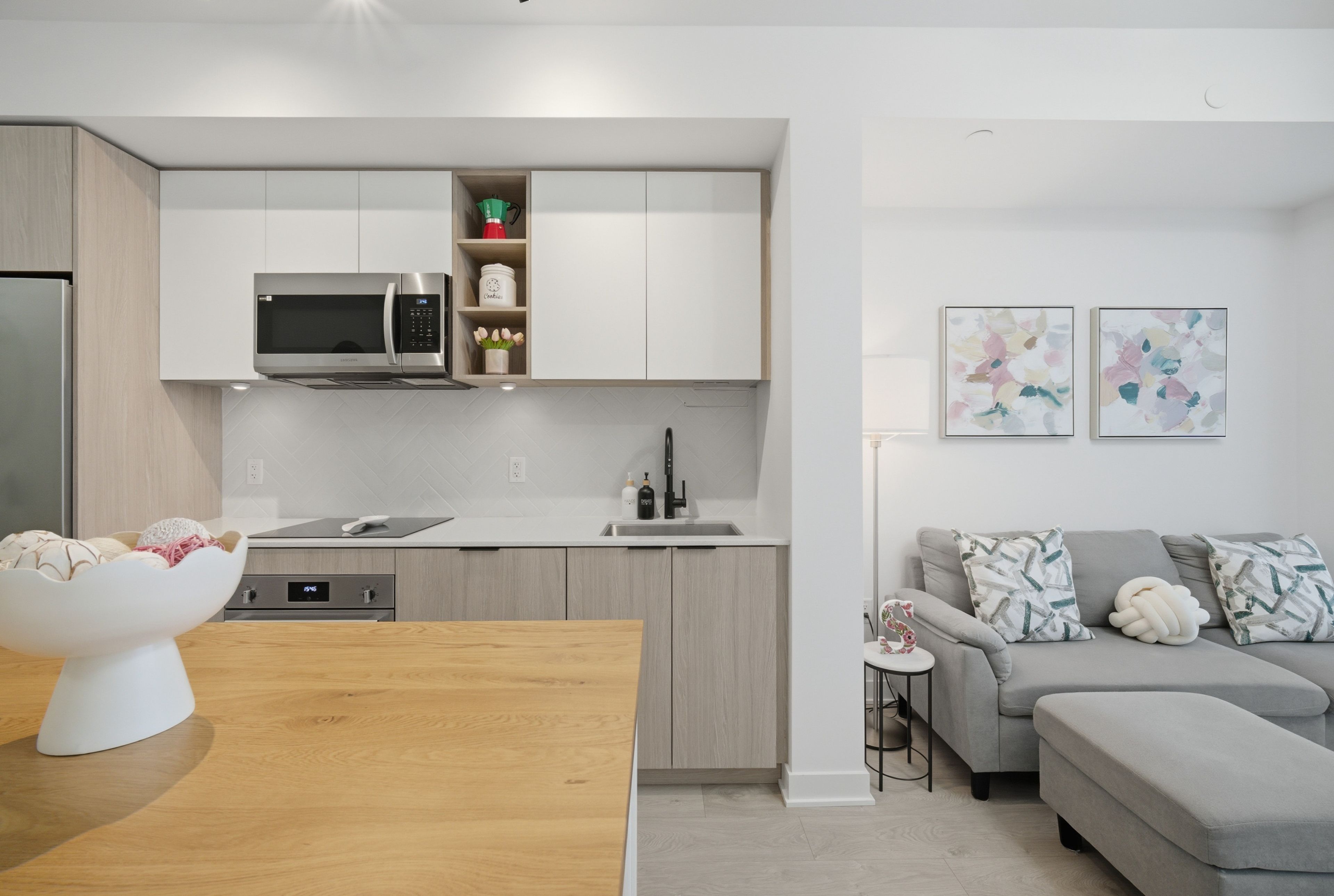 • Updated kitchen features quartz countertops and extended cabinetry.