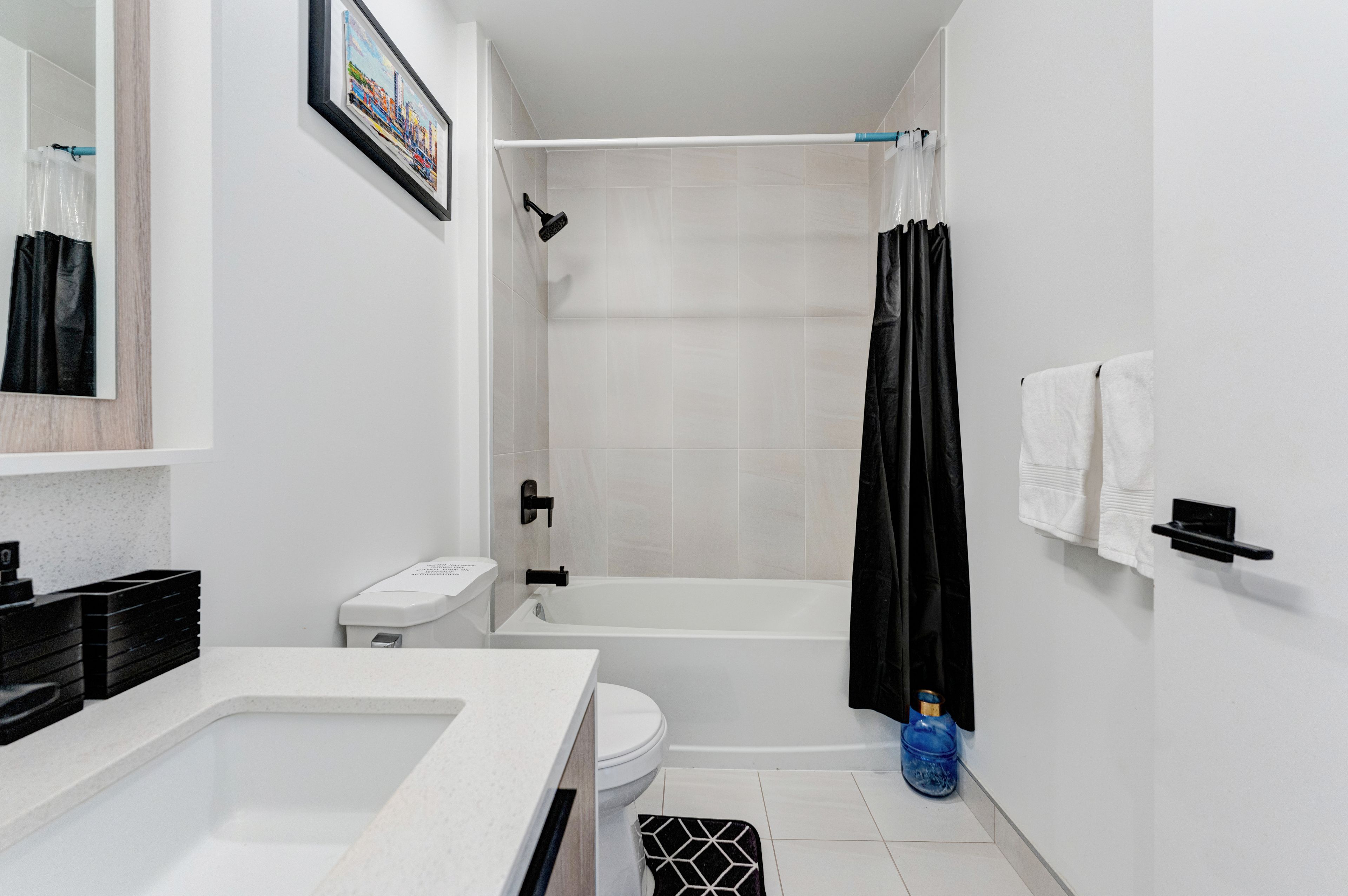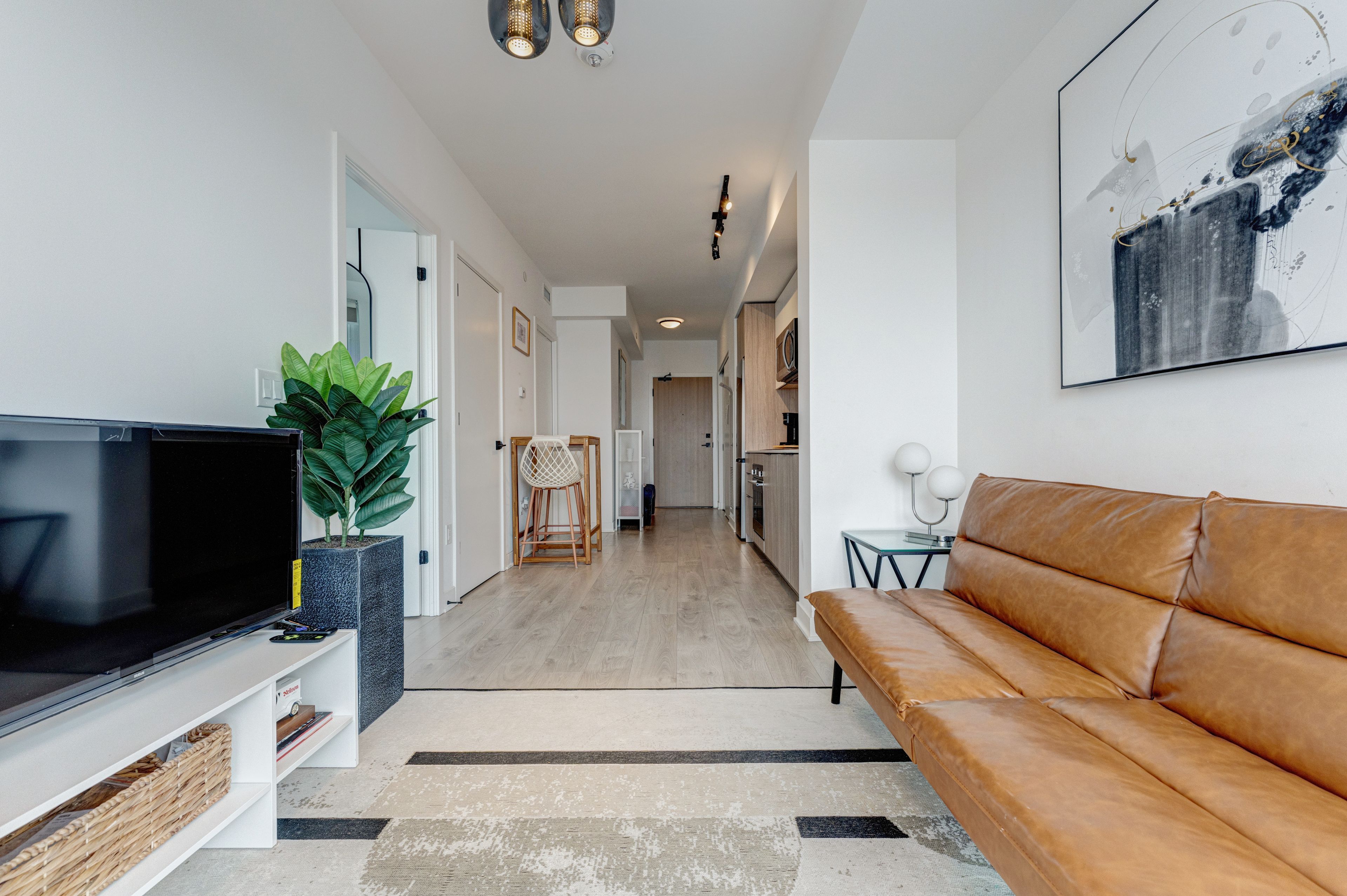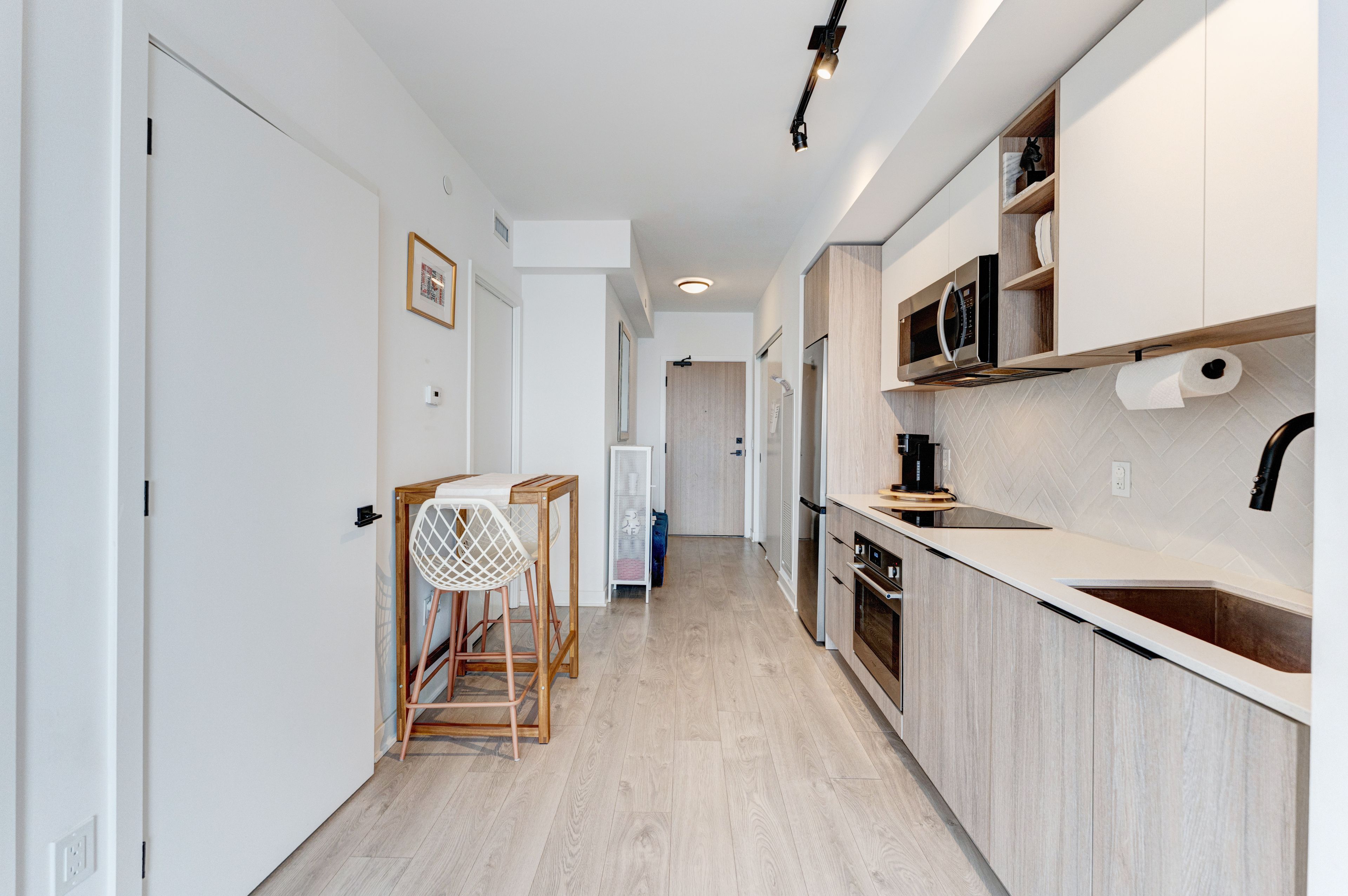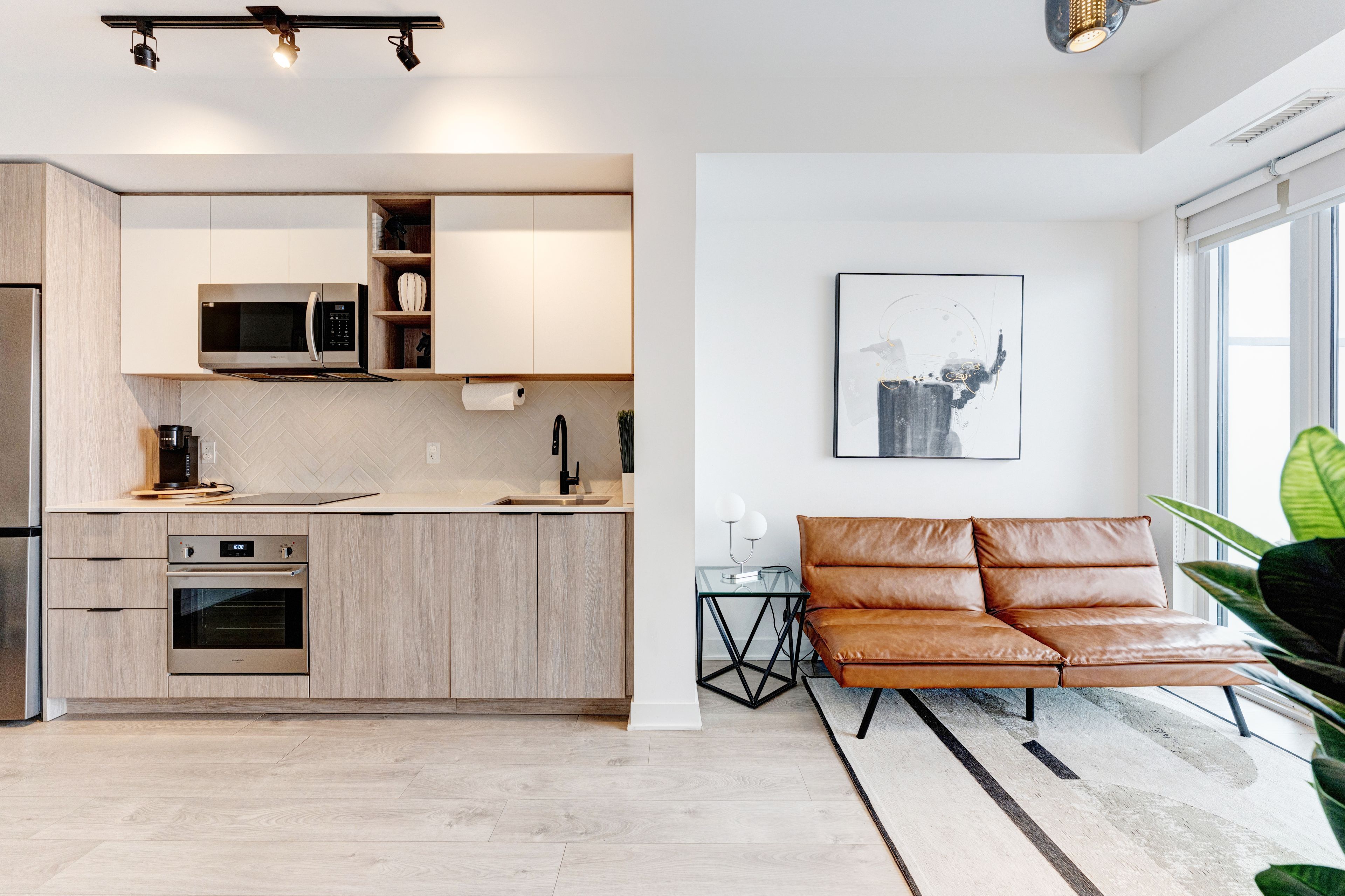 • Open-concept layout with a sleek kitchen and cozy bedroom with walk-in closet.