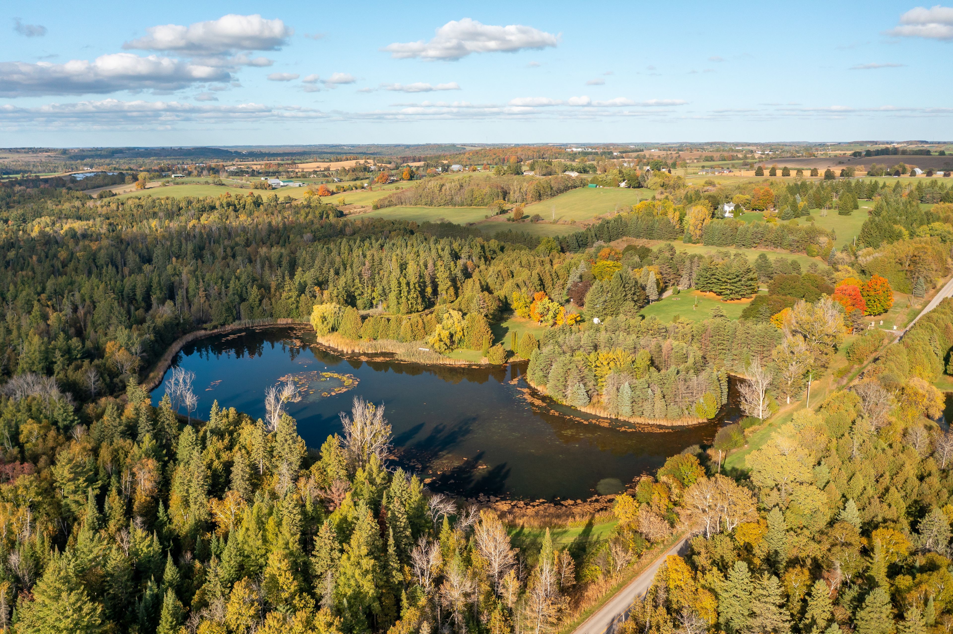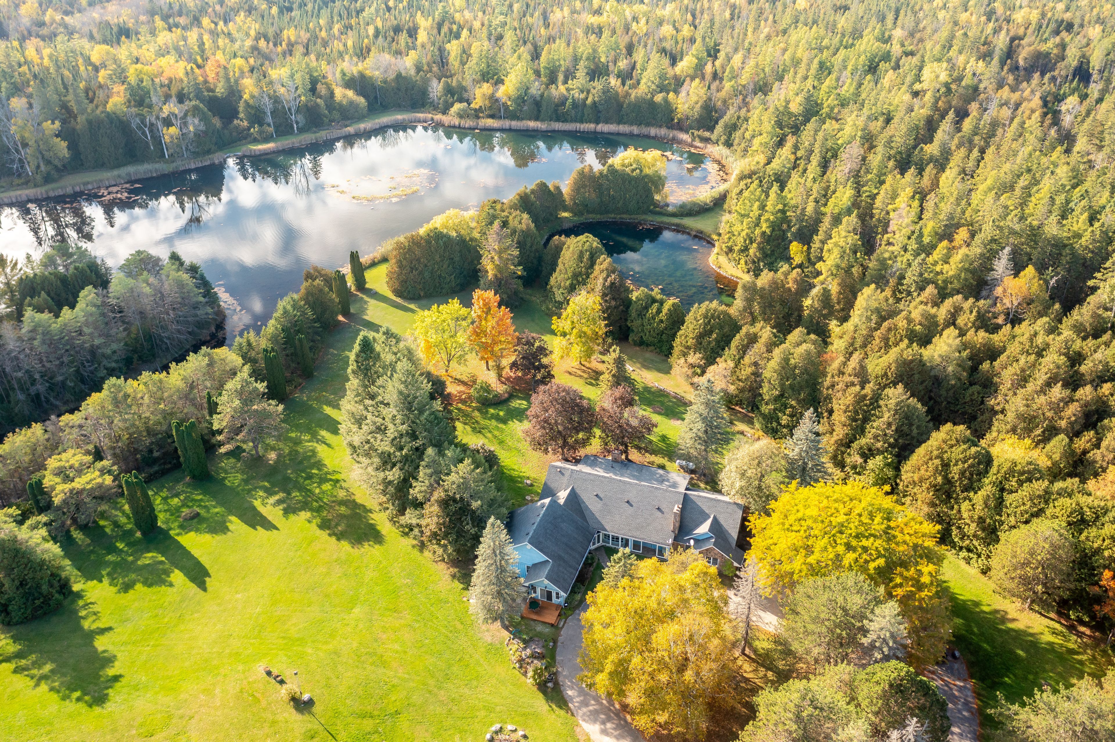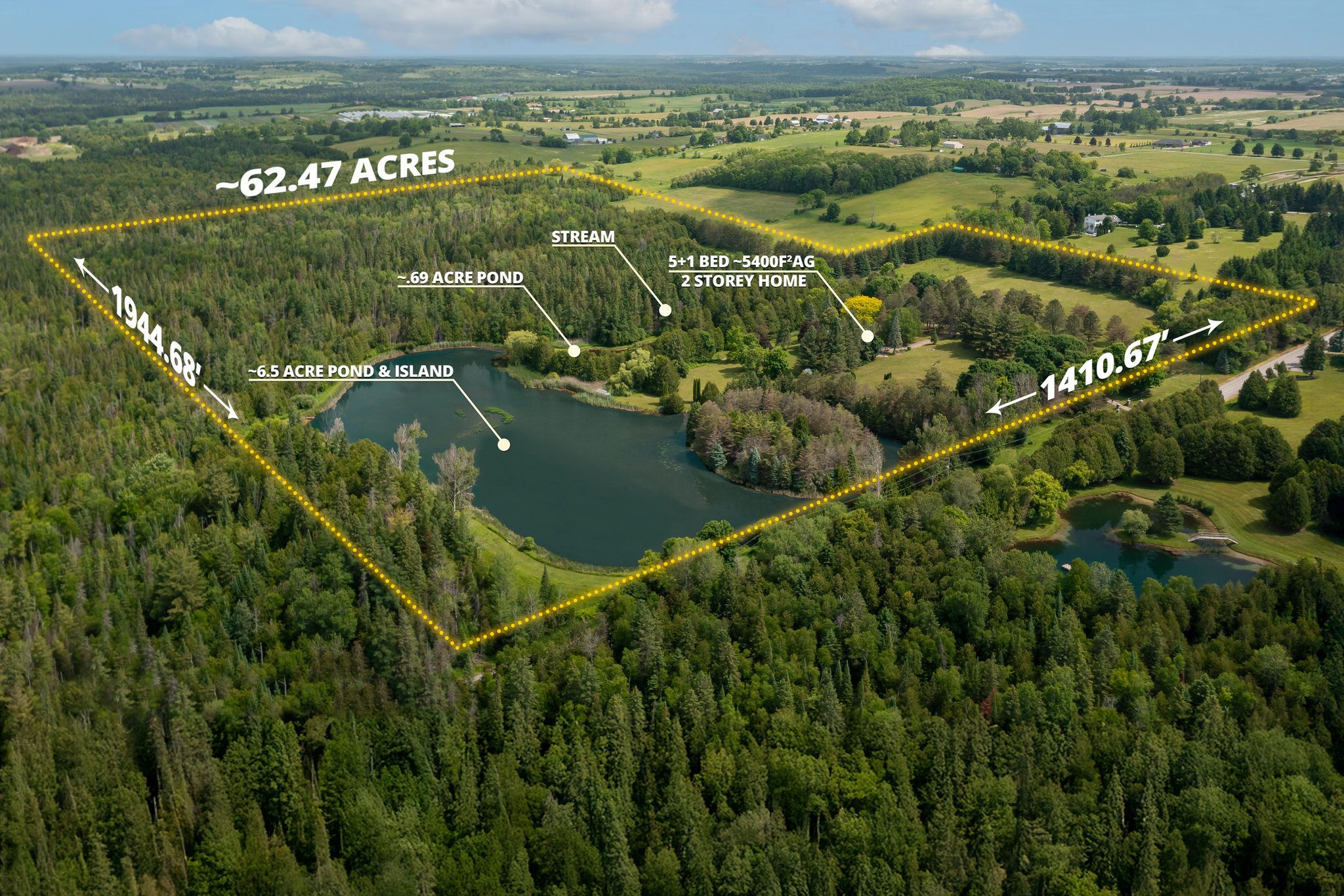 Discover timeless charm, modern comfort, and breathtaking natural beauty on this extraordinary 62-acre one of a kind retreat. This rare offering features over 7 acres of tranquil ponds including one with its own private island surrounded by mature trees, manicured grounds, and a peaceful, babbling stream. A long, winding driveway welcomes you to an impressive 5,400 square foot two-storey residence plus a partially finished basement, offering 6 bedrooms and 7 bathrooms. Thoughtfully designed with multiple walkouts, this home captures panoramic views of the lush landscape and serene waters from nearly every room. Inside, you'll find a blend of elegance and functionality. Two main floor bedrooms, including one with a walk-in dressing room and private ensuite. Three additional bedrooms on the second level, along with two fully renovated bathrooms featuring heated floors, an upper-level recreational room with a wet bar and gleaming hardwood floors throughout. The lower level offers flexibility with a separate entrance, bedroom, living area, and kitchenette perfect as a guest suite or in-law setup. Whether you're canoeing across the pond, reading beside the stream, or casting a line for an afternoon of fishing, this estate is a true nature lover's paradise. Located on a quiet road just 8 minutes from mount alberts shops and dining, and only 20 minutes to highway 404 and all the amenities of newmarket this is the perfect blend of rural tranquility and modern convenience.